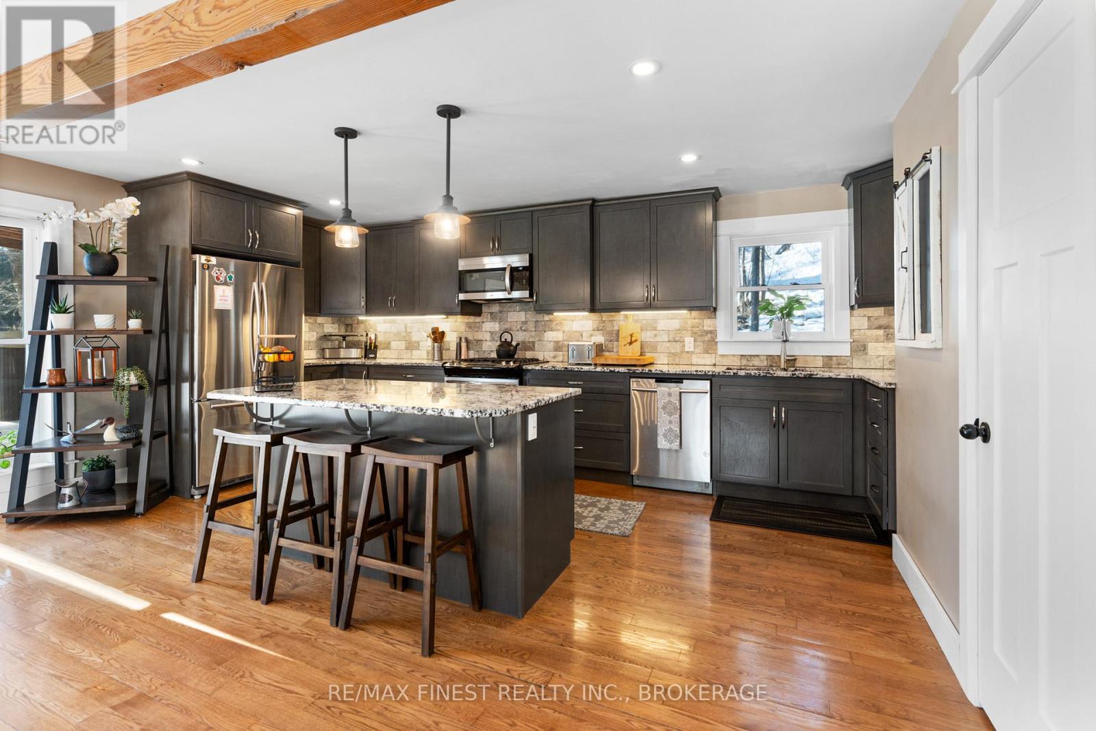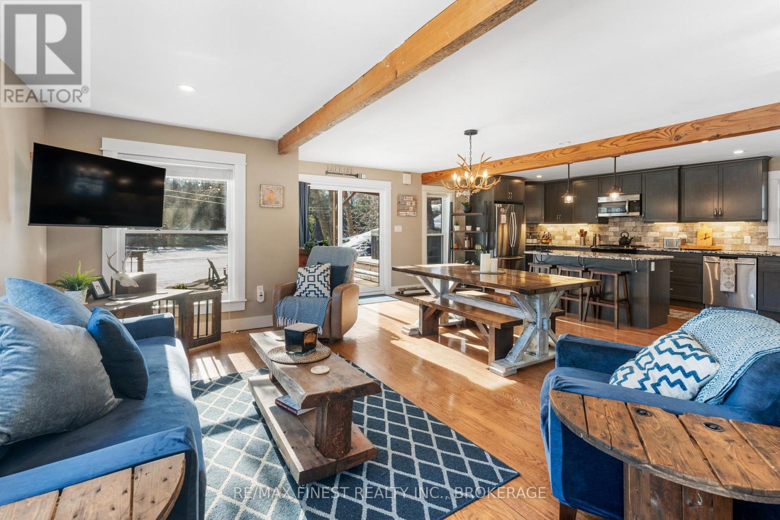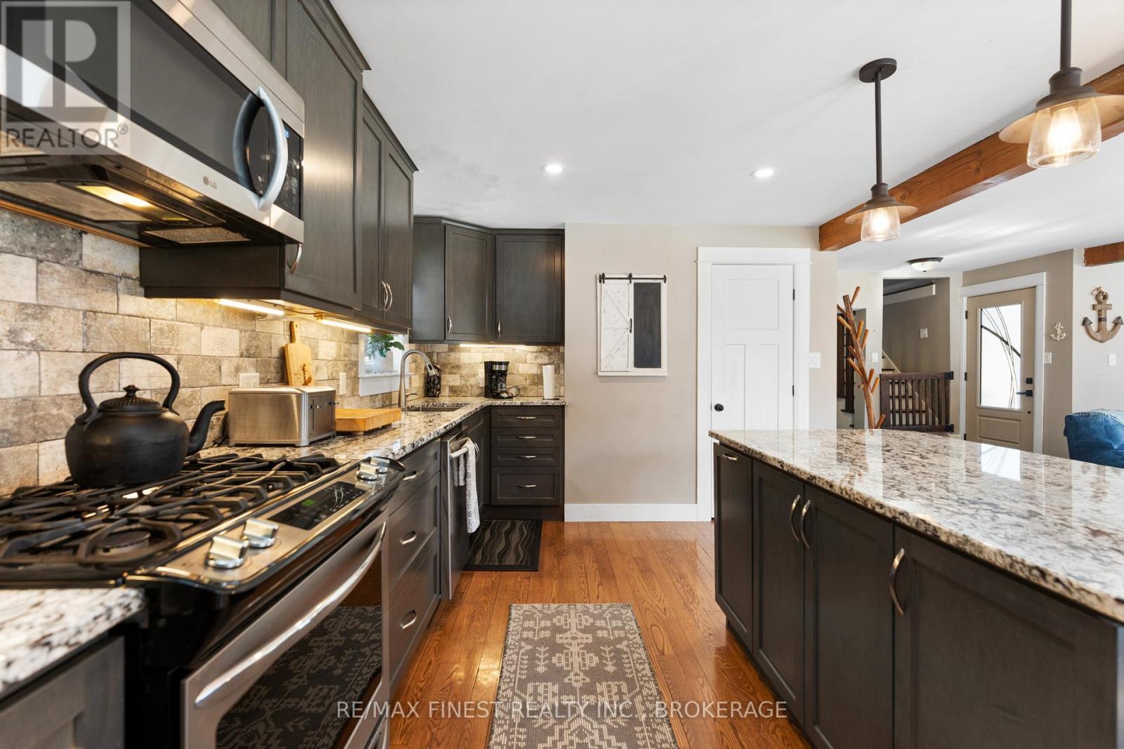 Welcome to your private waterfront retreat on Sydenham Lake, offering an incredible 312 feet of shoreline tucked into its own quiet bay just off the main lake. This protected shoreline provides the calm waters ideal for swimming, fishing, docking, and year-round lake enjoyment. Outdoor living is at its finest with a wraparound deck showcasing lake views and a stunning limestone patio designed for entertaining at the water's edge. Unwind in the hot tub beneath a custom-built gazebo after a day on the lake. This property also includes a double-car garage, a fully paved driveway, and a newly built storage building-providing ample storage for vehicles, tools, and recreational equipment. The home has been extensively renovated and thoughtfully updated. The custom-designed kitchen features granite countertops, a large island, and solid oak flooring-perfect for gathering and entertaining. Two beautifully updated bathrooms including a spa-inspired ensuite with a glass shower and deep, stand-alone soaking tub-an ideal retreat after a day outdoors. Additional upgrades include a new steel roof, siding and stone exterior, and new windows and flooring. A complete list of improvements is available upon request. This is a rare opportunity to own a truly exceptional waterfront property on Sydenham Lake-where privacy, modern comfort, and four-season recreation combine to create an unforgettable lakeside lifestyle. (id:64974)