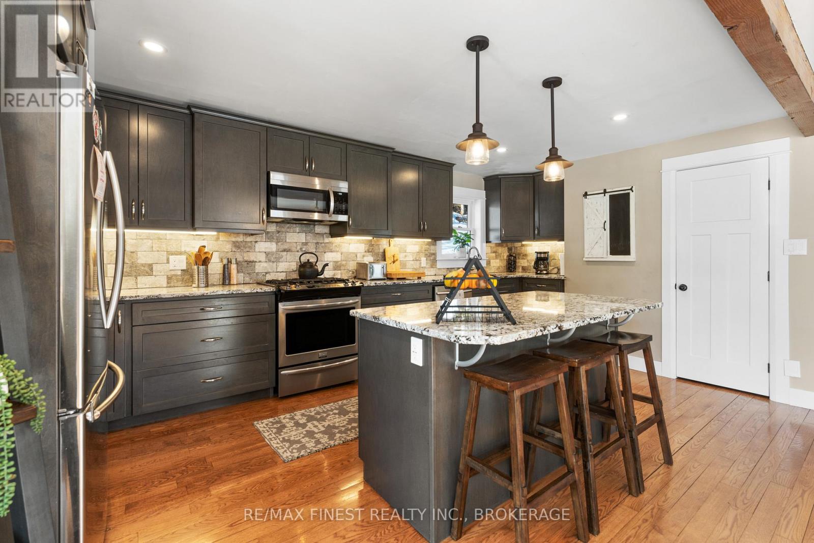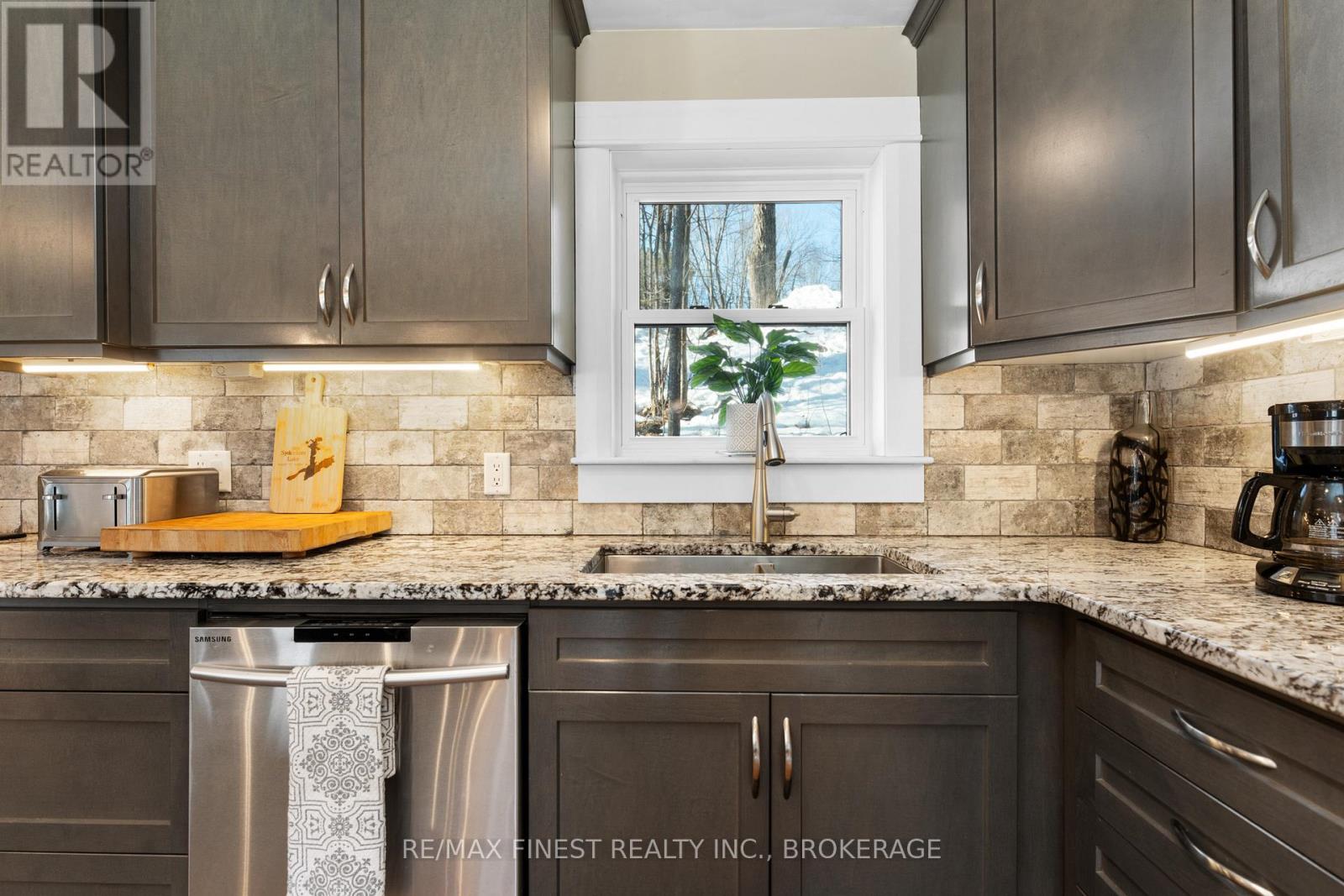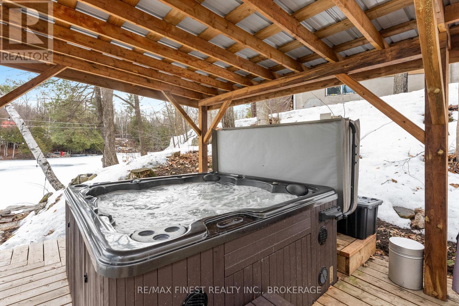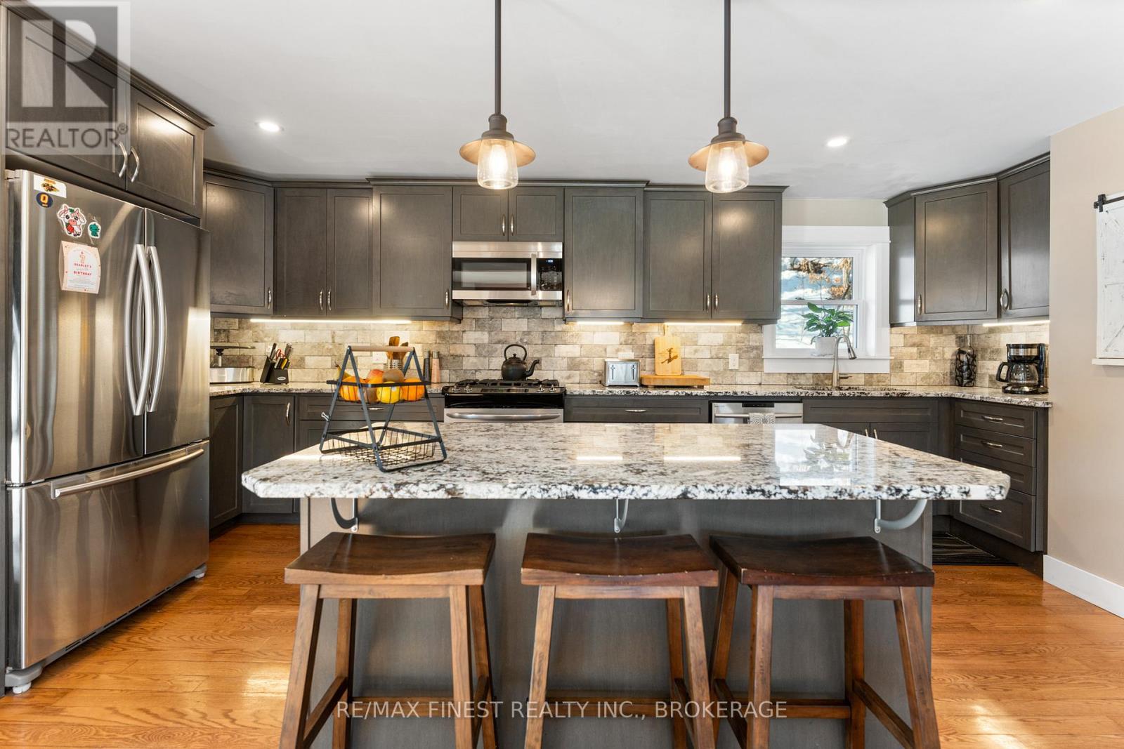 Welcome to your private waterfront retreat on Sydenham Lake, offering an incredible 312 feet of shoreline tucked into its own quiet bay just off the main lake. This protected shoreline provides the calm waters ideal for swimming, fishing, docking, and year-round lake enjoyment. Outdoor living is at its finest with a wraparound deck showcasing lake views and a stunning limestone patio designed for entertaining at the water's edge. Unwind in the hot tub beneath a custom-built gazebo after a day on the lake. This property also includes a double-car garage, a fully paved driveway, and a newly built storage building-providing ample storage for vehicles, tools, and recreational equipment. The home has been extensively renovated and thoughtfully updated. The custom-designed kitchen features granite countertops, a large island, and solid oak flooring-perfect for gathering and entertaining. Two beautifully updated bathrooms including a spa-inspired ensuite with a glass shower and deep, stand-alone soaking tub-an ideal retreat after a day outdoors. Additional upgrades include a new steel roof, siding and stone exterior, and new windows and flooring. A complete list of improvements is available upon request. This is a rare opportunity to own a truly exceptional waterfront property on Sydenham Lake-where privacy, modern comfort, and four-season recreation combine to create an unforgettable lakeside lifestyle. (id:64974)