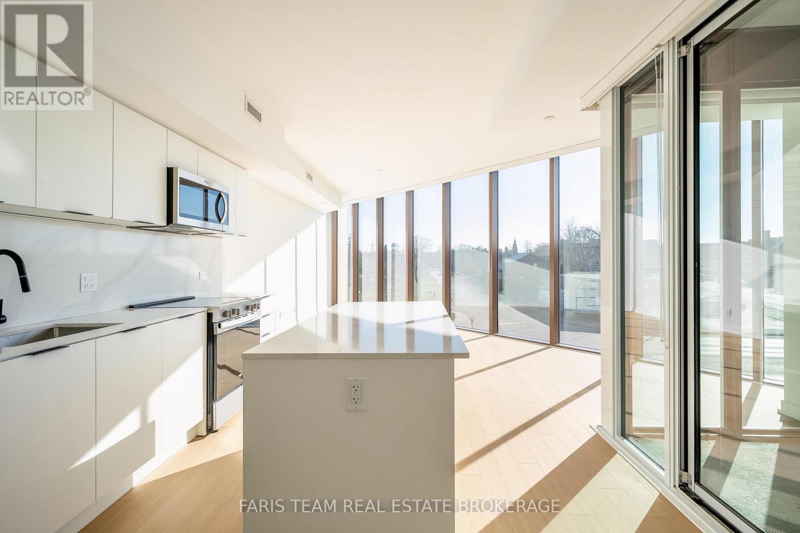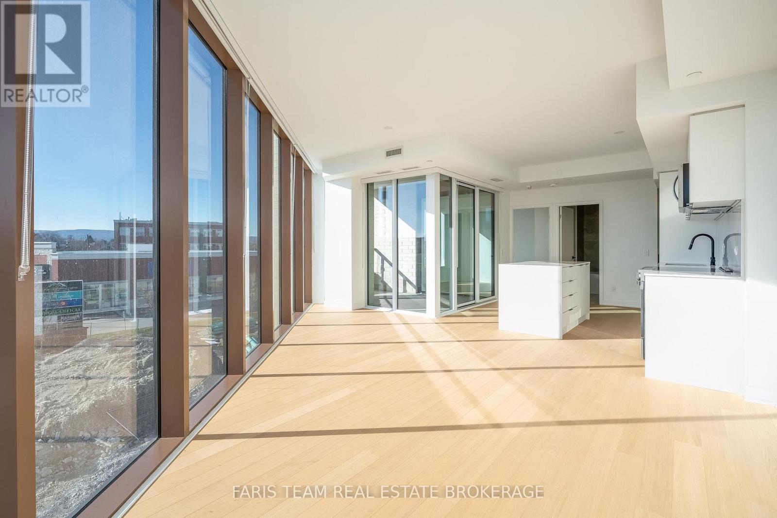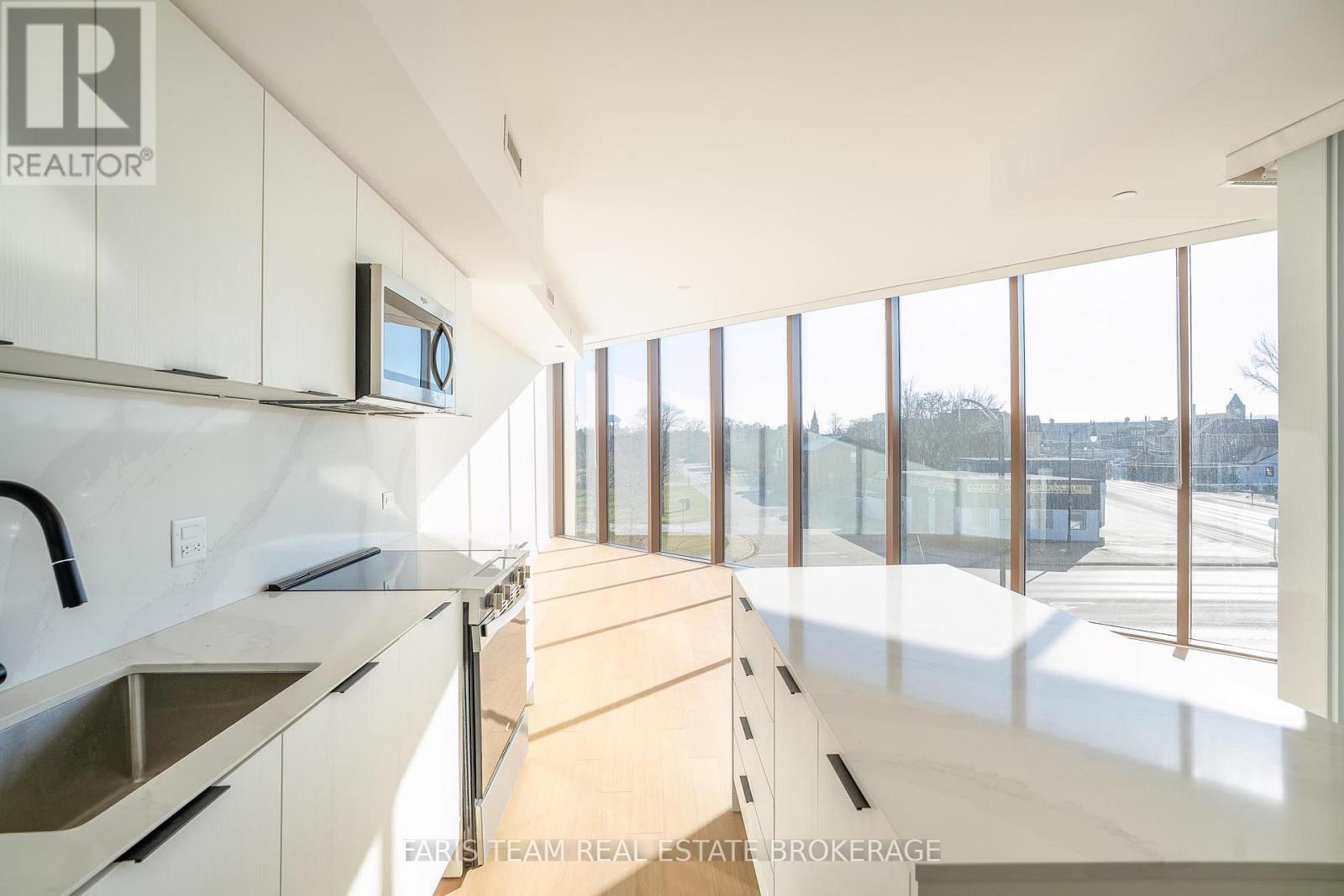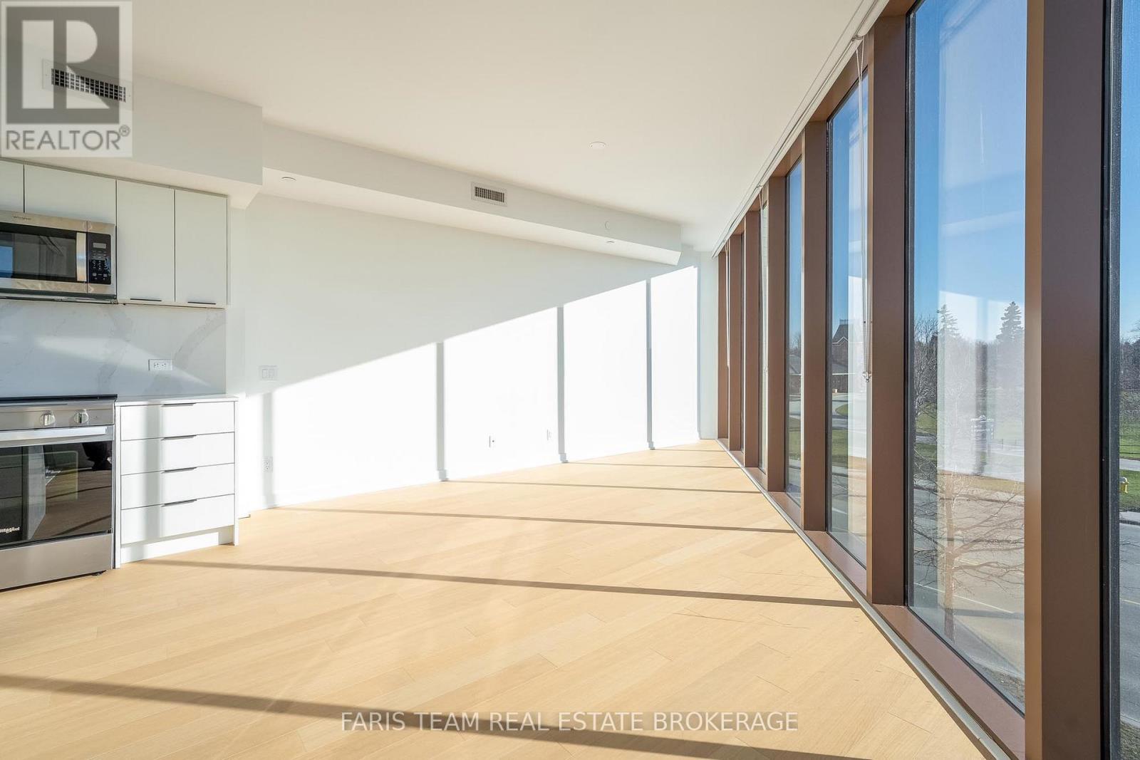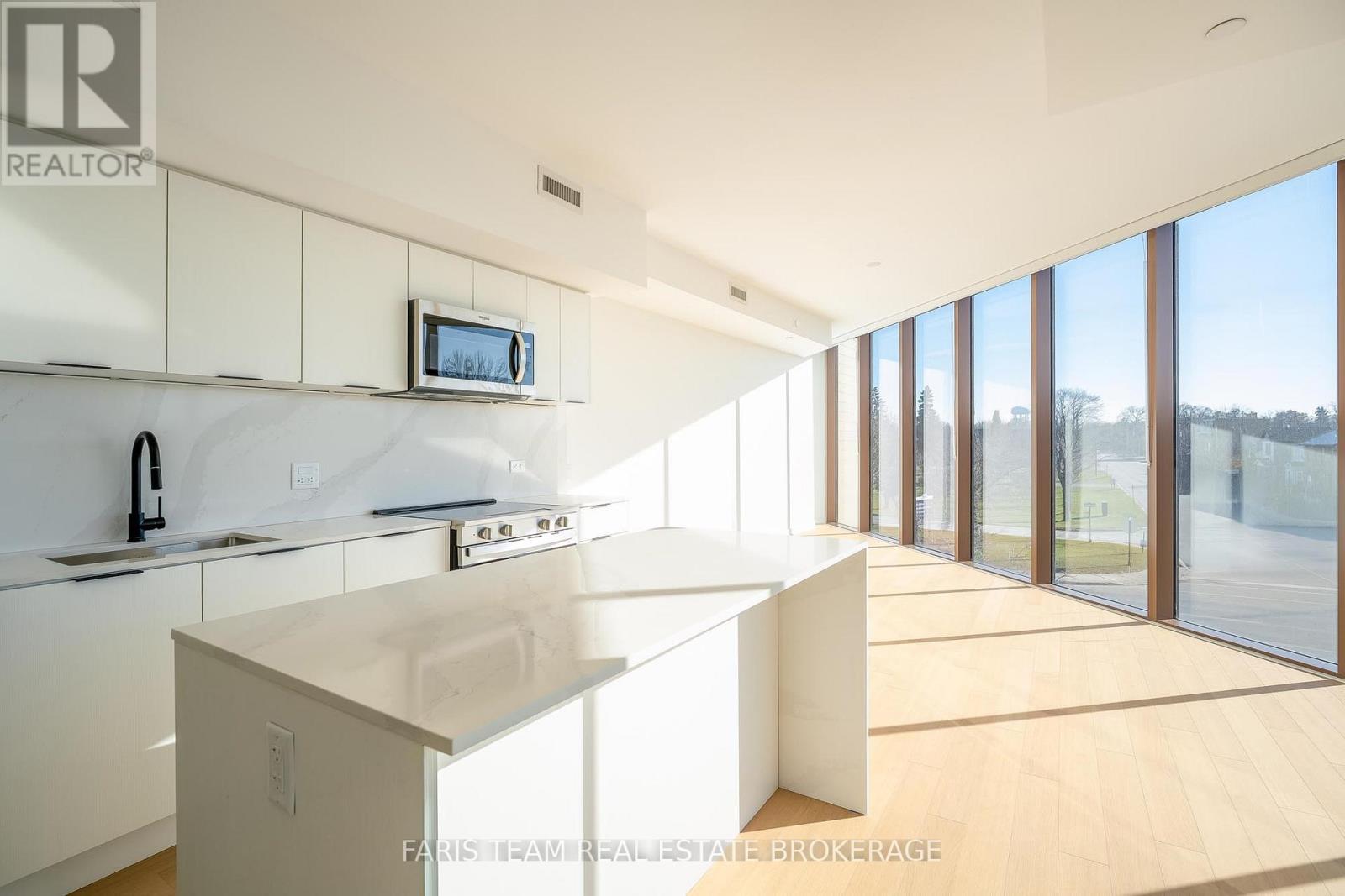 Top 5 Reasons You Will Love This Condo: 1) This bright and inviting corner unit showcases floor-to-ceiling windows that wrap the main living area, filling the unit with natural light throughout the day, with a desirable southwest exposure, you'll enjoy warm afternoon sun, stunning sunsets, and picturesque views stretching over downtown Collingwood with Blue Mountain as your backdrop 2) Harbour House stands as Collingwood's newest luxury condominium development, thoughtfully crafted and ideally located just steps from the Harbour, providing modern architecture and vibrant charm with easy walkability of Collingwood's waterfront 3) Residents of Harbour House enjoy an exceptional selection of amenities, including two beautifully furnished guest suites, a fully equipped fitness centre, a rooftop lounge with an outdoor terrace, and a dedicated media room, with additional conveniences such as a pet spa, bike storage, and a gear prep room perfectly complementing Collingwood's active, four-season way of life 4) Offering 856 square feet of thoughtfully designed living space plus a well-sized den, this layout provides versatility for a home office, reading retreat, or guest area, and comprises over $24,100 in premium upgrades including a stone bathroom vanity, a waterfall-edge kitchen island with matching backsplash, upgraded tile selections, high-end appliances, and sleek roller blinds 5) Added benefit of a dedicated underground parking space adding year-round comfort and protection from the elements, ensuring effortless living in every season. 856 fin.sq.ft. *Please note some images have been virtually staged to show the potential of the condo. (id:64974)