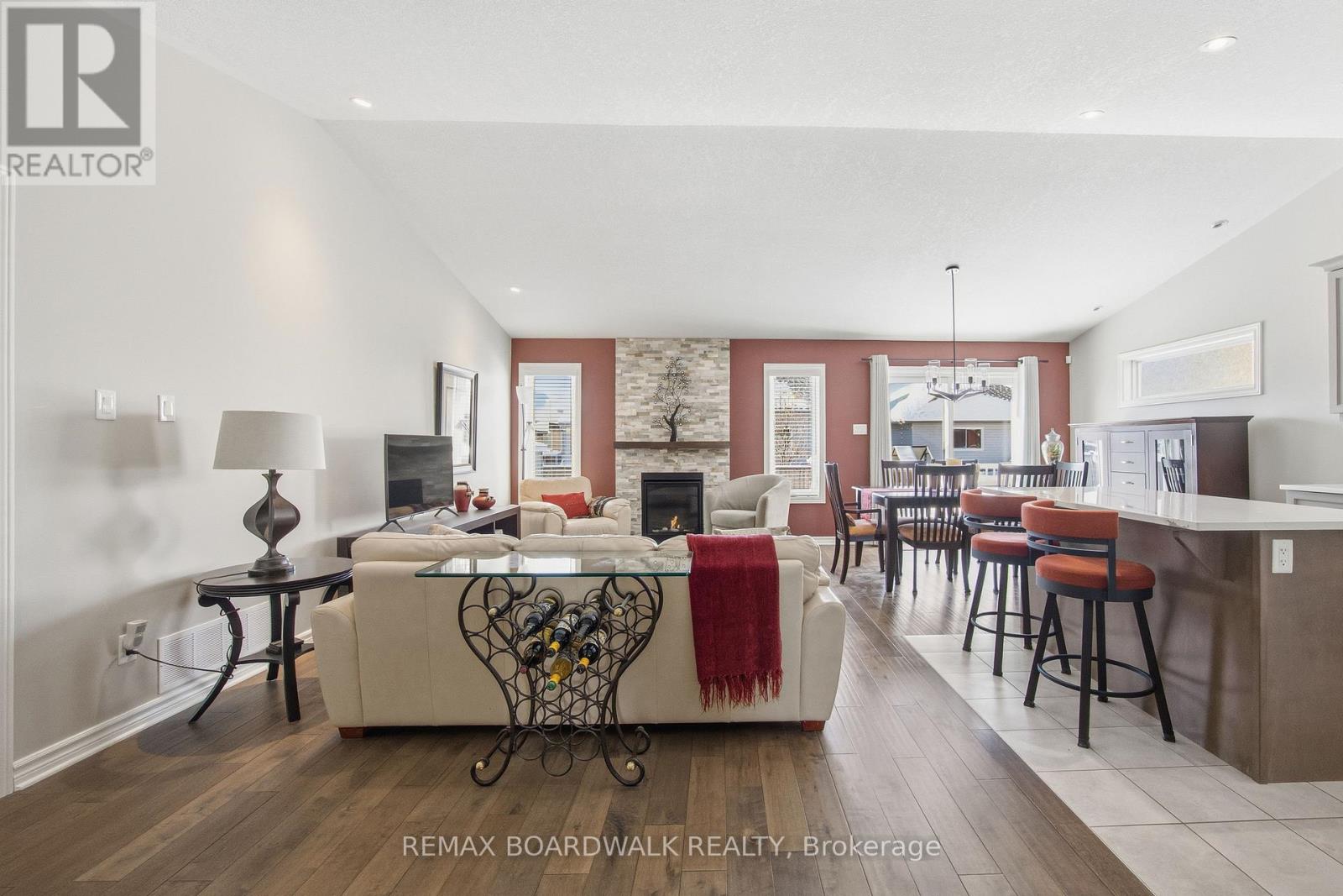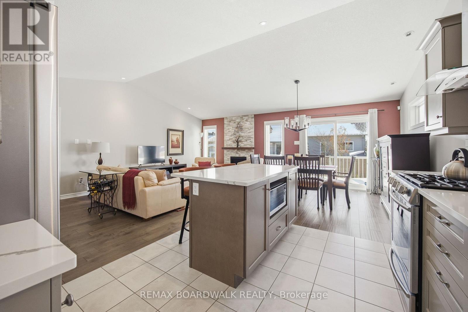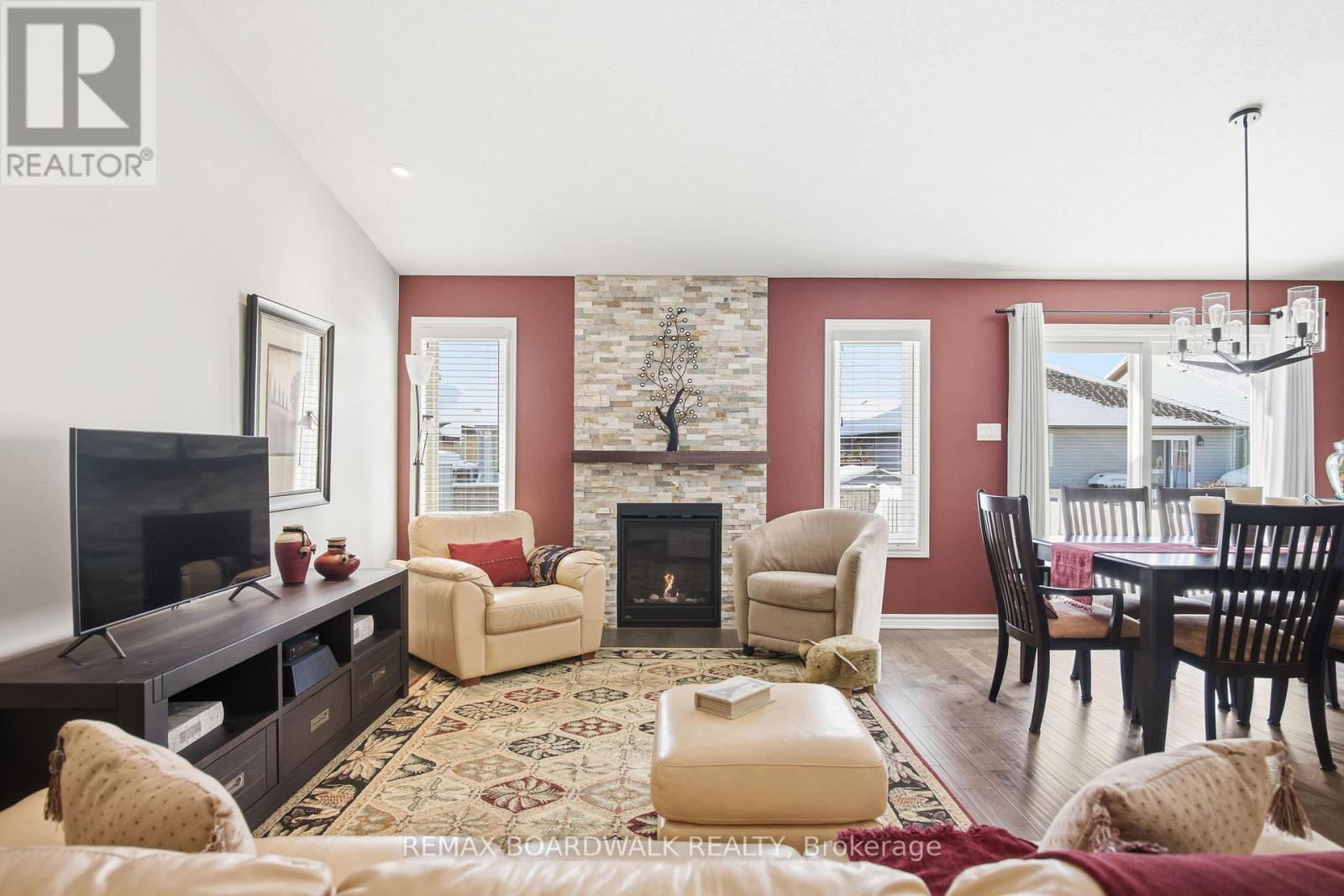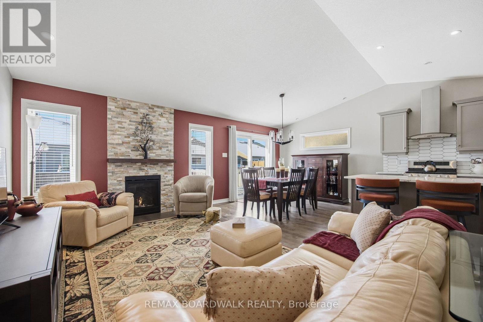 Beautiful bungalow located in Mill Run, one of Almonte's most sought-after communities, where pride of ownership is evident throughout. This thoughtfully designed 2+2 bedroom, 3 full bathroom home offers a bright, open-concept layout ideal for both everyday living and entertaining. Vaulted ceilings create an inviting sense of space in the main living area, complemented by rich hardwood floors and a cozy gas fireplace. The custom kitchen is truly the heart of the home, featuring ample cabinetry, stainless steel appliances, a large island with seating, and an impressive walk-in pantry. The primary suite has been redesigned to provide additional space and comfort, complete with a generous walk-in closet and a well-appointed 4-piece ensuite. A convenient main-level laundry room enhances the home's seamless flow. The finished lower level offers abundant additional living space, including a spacious recreation room with gas fireplace, a full bathroom, and two large bedrooms-perfect for guests, extended family, fitness room or a home office setup. This home also provides exceptional storage and peace of mind with a standby home generator. Step outside to enjoy a zero-maintenance yard and a professionally built shed, ideal for easy living. Situated in a prime location within walking distance to grocery stores, pharmacy, coffee shops and hardware store. Minutes to Almonte and its charming boutiques, cafés, and restaurants. This exceptional home blends comfort, convenience, and community, offering refined, low-maintenance living with vibrant small-town charm. (id:64974)