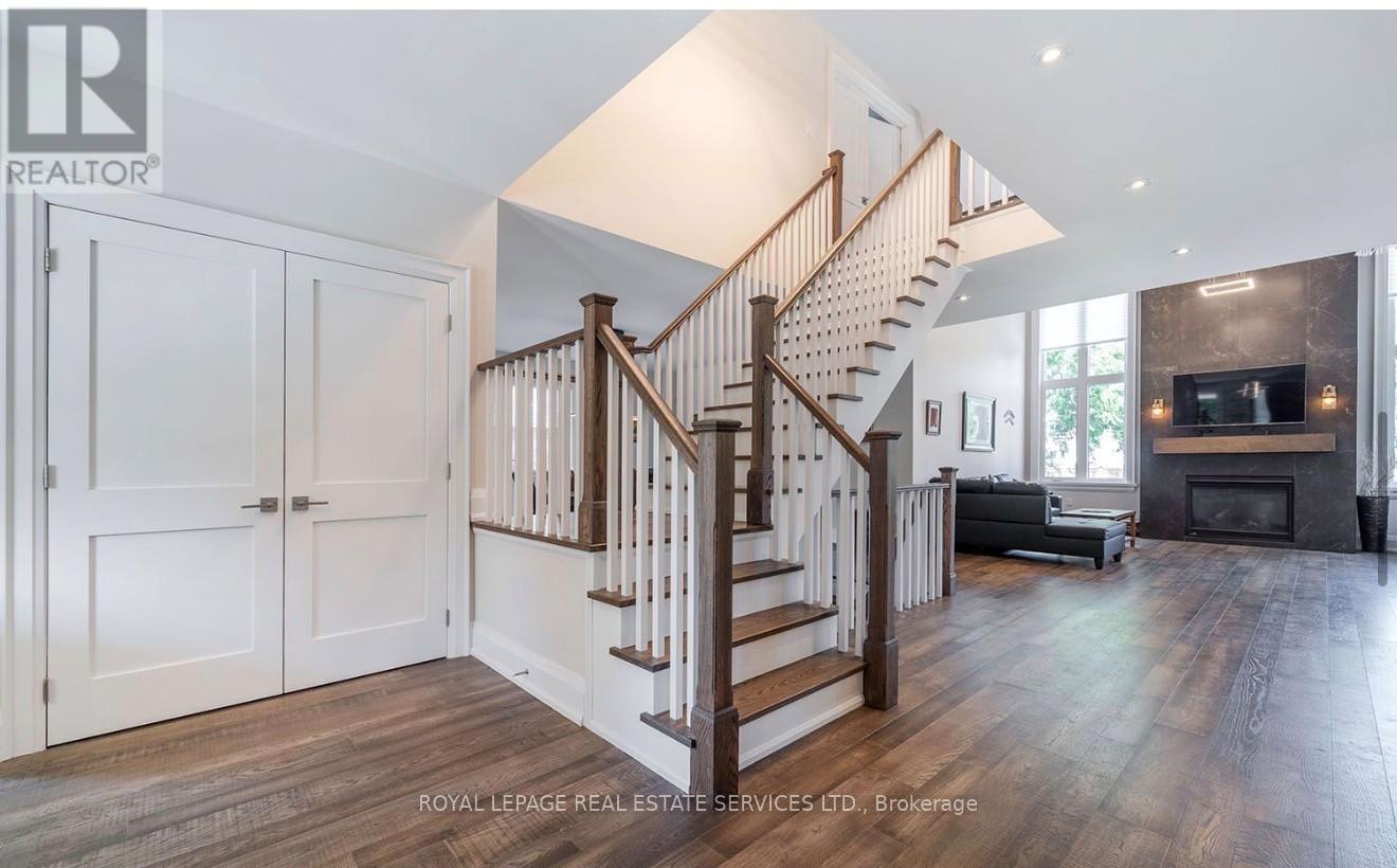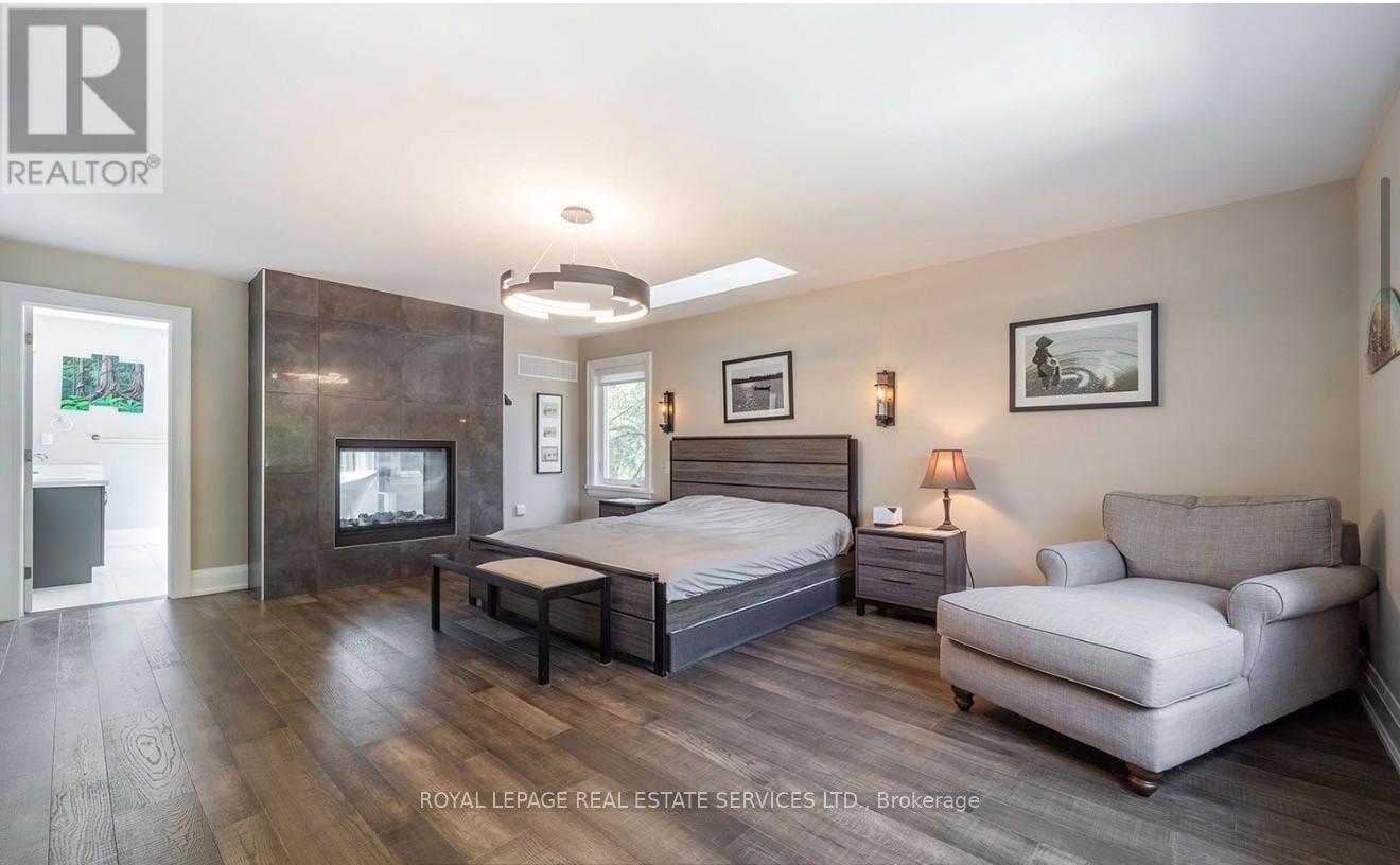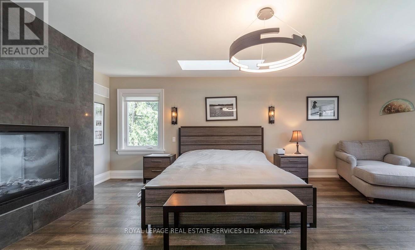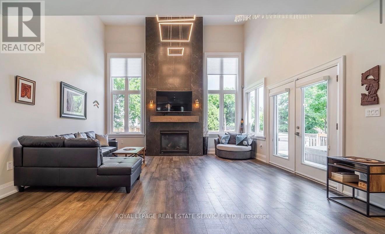 Custom built in 2018 and nestled in one of Burlington's most desired neighbourhoods, 2163 Deyncourt Drive offers a seamless blend of luxury, comfort, and modern living. Situated on a premium 60' x 142' north-west facing lot on a quiet street in Central Burlington, this home is designed for both everyday living and effortless entertaining. The main level showcases a living room with soaring cathedral ceiling, a dramatic gas fireplace, and a French door walkout to the deck, creating a bright and inviting atmosphere. The gourmet kitchen is a true centrepiece, complete with quartz countertops, designer backsplash, premium stainless steel appliances, and an oversized 8' island with breakfast bar, flowing seamlessly into the dining area. A dedicated main floor office provides the perfect space for working from home. Upstairs, the private primary retreat offers a luxurious escape with a walk-in closet, two-sided gas fireplace, and a spa-inspired five-piece ensuite featuring a skylight, double sinks, freestanding tub, steam shower, and heated floor. Two additional bedrooms, a family room, beautifully appointed five-piece main bathroom, and a convenient laundry room complete the upper level. The finished basement extends the living space with a recreation area, fourth bedroom, laminate flooring, and a three-piece bathroom - ideal for guests or extended family. Step outside to your private backyard oasis, featuring a custom deck with hot tub and an interlock patio, perfect for relaxing or entertaining. Additional highlights include expansive windows that flood the home with natural light, engineered hardwood flooring throughout the main and upper levels, multiple walkouts, and a full irrigation system. Ideally located close to Burlington's vibrant downtown core, Spencer Smith Park, the lake, major highways, and the GO Train, this exceptional home delivers the perfect balance of luxury, convenience, and lifestyle. (certain images have been digitally enhanced) (id:64974)