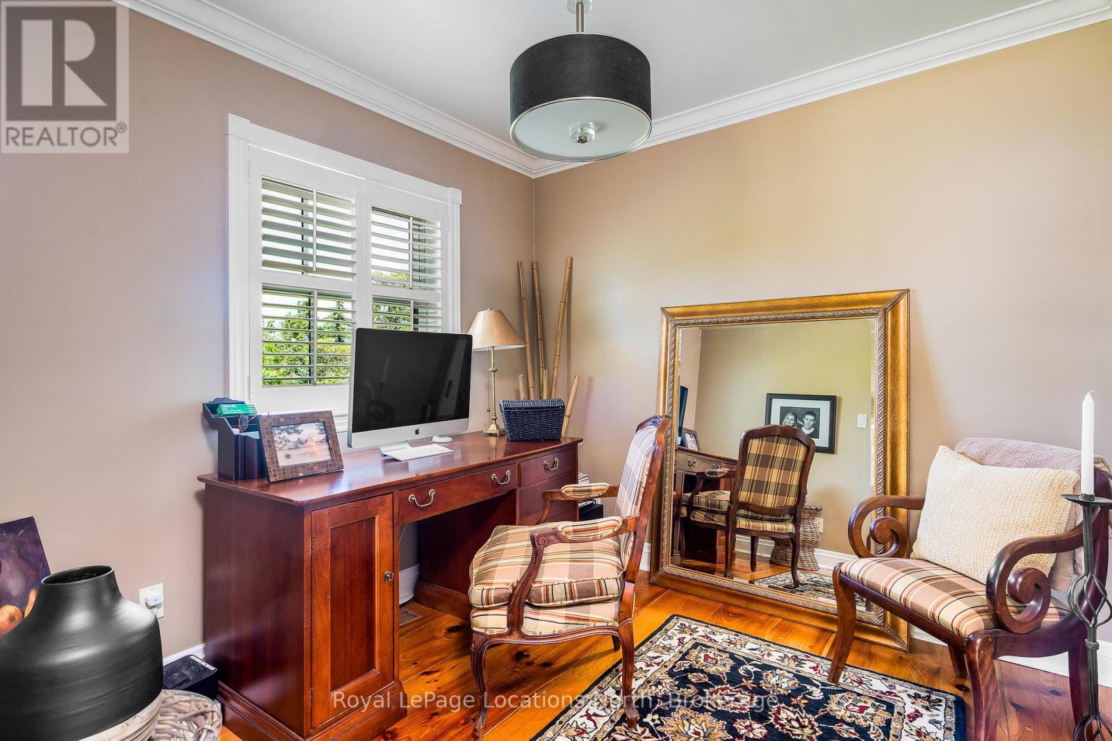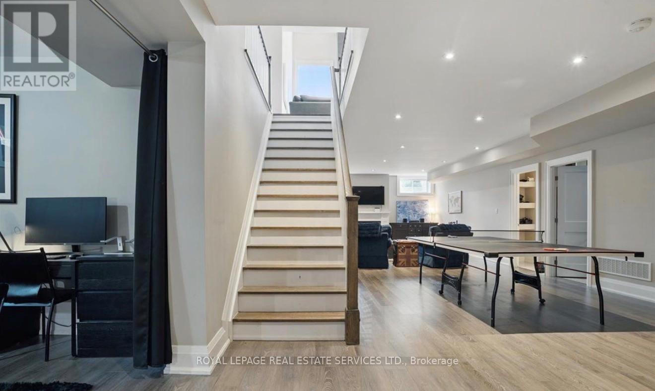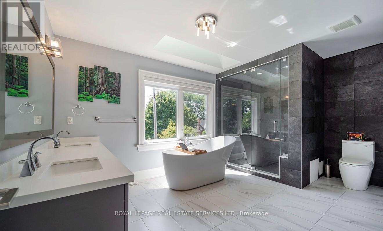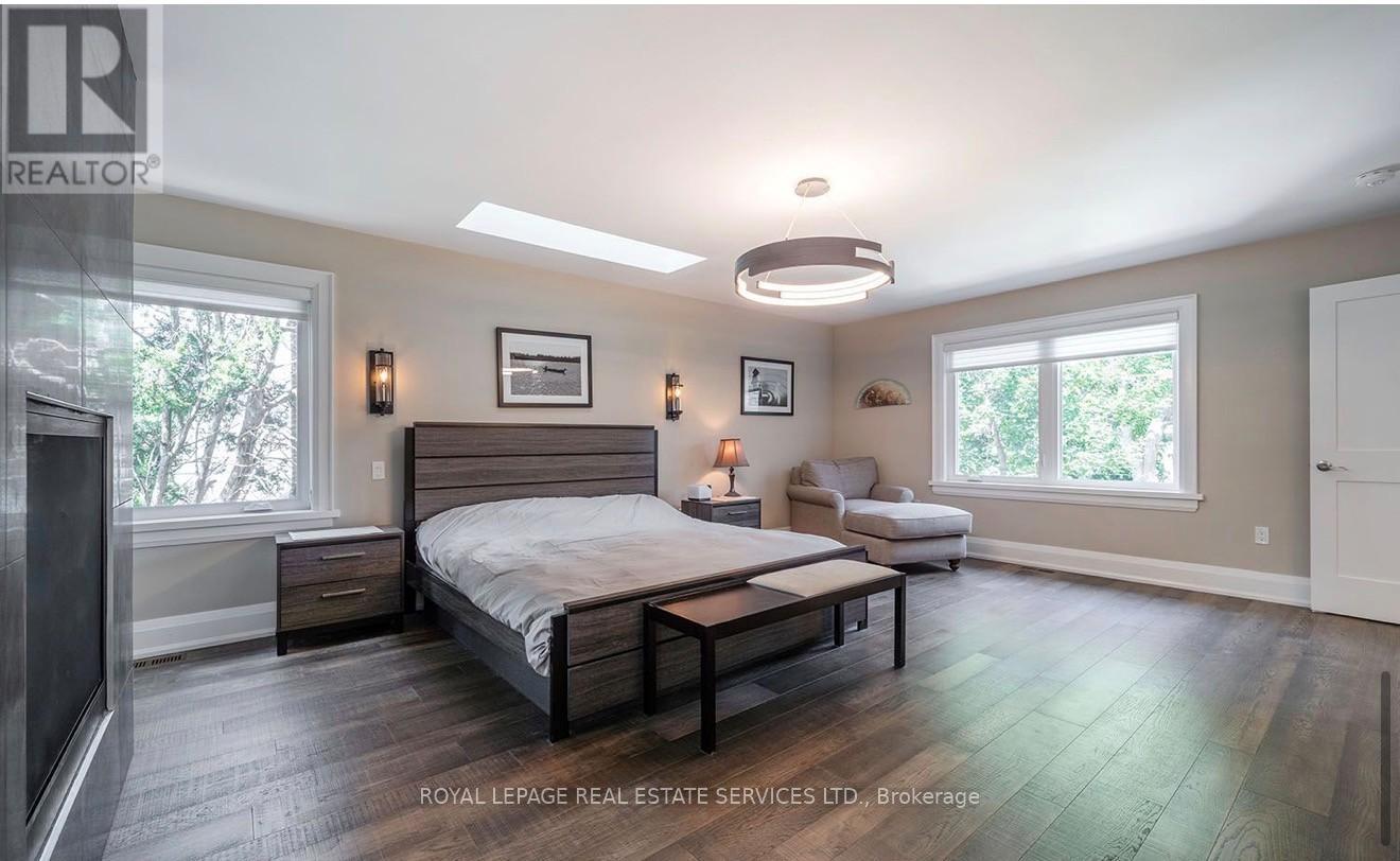Custom built in 2018 and nestled in one of Burlington's most desired neighbourhoods, 2163 Deyncourt Drive offers a seamless blend of luxury, comfort, and modern living. Situated on a premium 60' x 142' north-west facing lot on a quiet street in Central Burlington, this home is designed for both everyday living and effortless entertaining. The main level showcases a living room with soaring cathedral ceiling, a dramatic gas fireplace, and a French door walkout to the deck, creating a bright and inviting atmosphere. The gourmet kitchen is a true centrepiece, complete with quartz countertops, designer backsplash, premium stainless steel appliances, and an oversized 8' island with breakfast bar, flowing seamlessly into the dining area. A dedicated main floor office provides the perfect space for working from home. Upstairs, the private primary retreat offers a luxurious escape with a walk-in closet, two-sided gas fireplace, and a spa-inspired five-piece ensuite featuring a skylight, double sinks, freestanding tub, steam shower, and heated floor. Two additional bedrooms, a family room, beautifully appointed five-piece main bathroom, and a convenient laundry room complete the upper level. The finished basement extends the living space with a recreation area, fourth bedroom, laminate flooring, and a three-piece bathroom - ideal for guests or extended family. Step outside to your private backyard oasis, featuring a custom deck with hot tub and an interlock patio, perfect for relaxing or entertaining. Additional highlights include expansive windows that flood the home with natural light, engineered hardwood flooring throughout the main and upper levels, multiple walkouts, and a full irrigation system. Ideally located close to Burlington's vibrant downtown core, Spencer Smith Park, the lake, major highways, and the GO Train, this exceptional home delivers the perfect balance of luxury, convenience, and lifestyle. (certain images have been digitally enhanced) (id:64974)