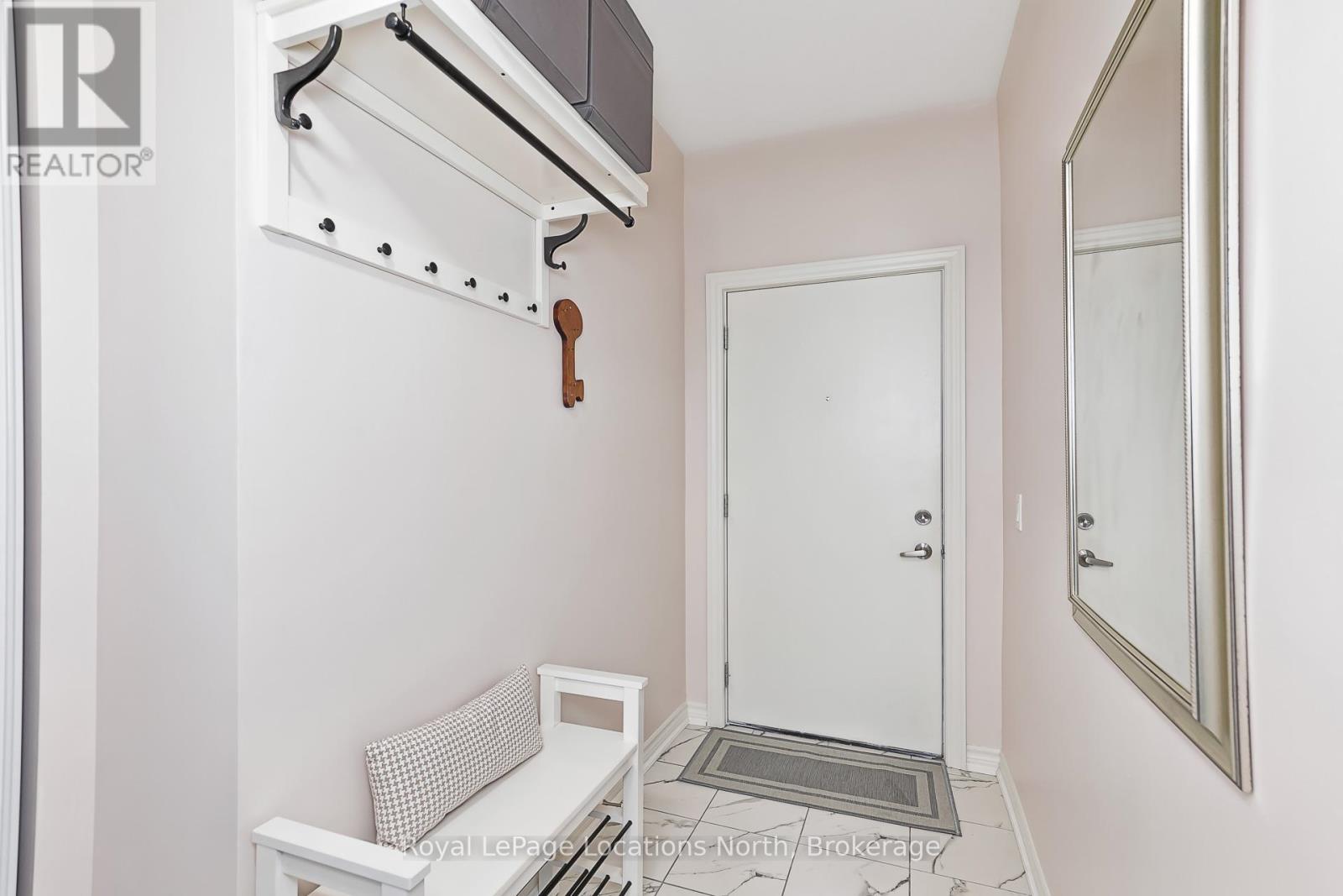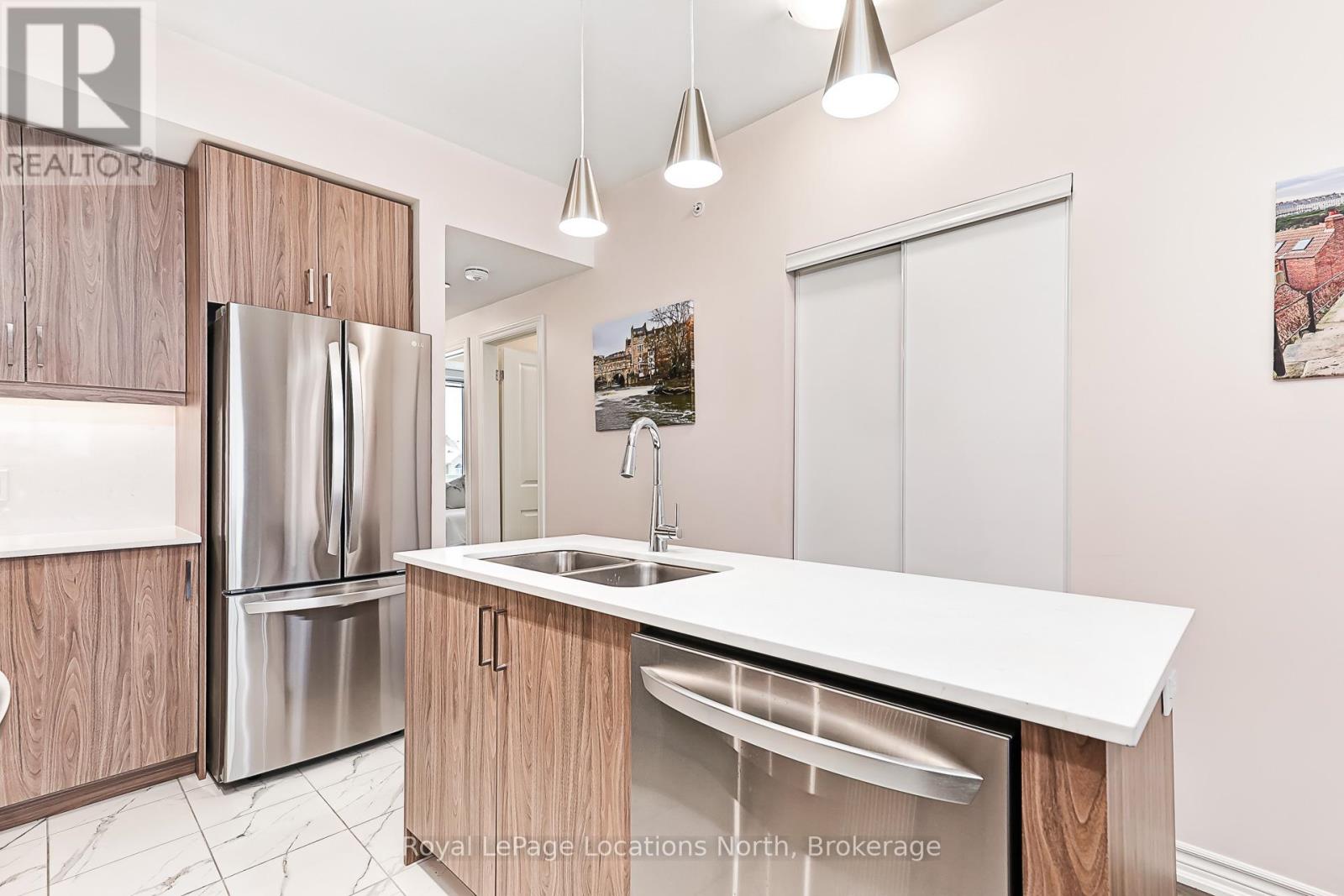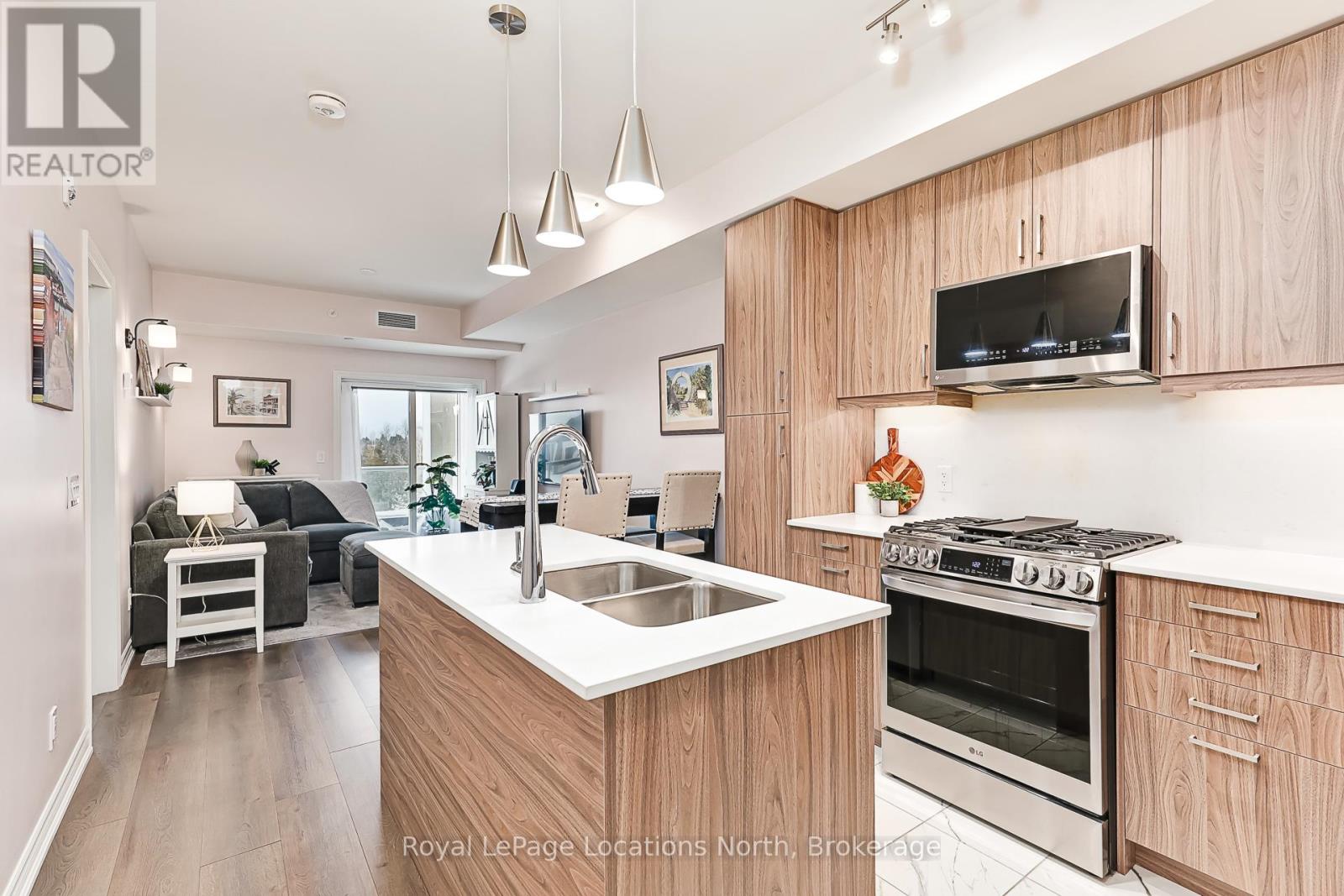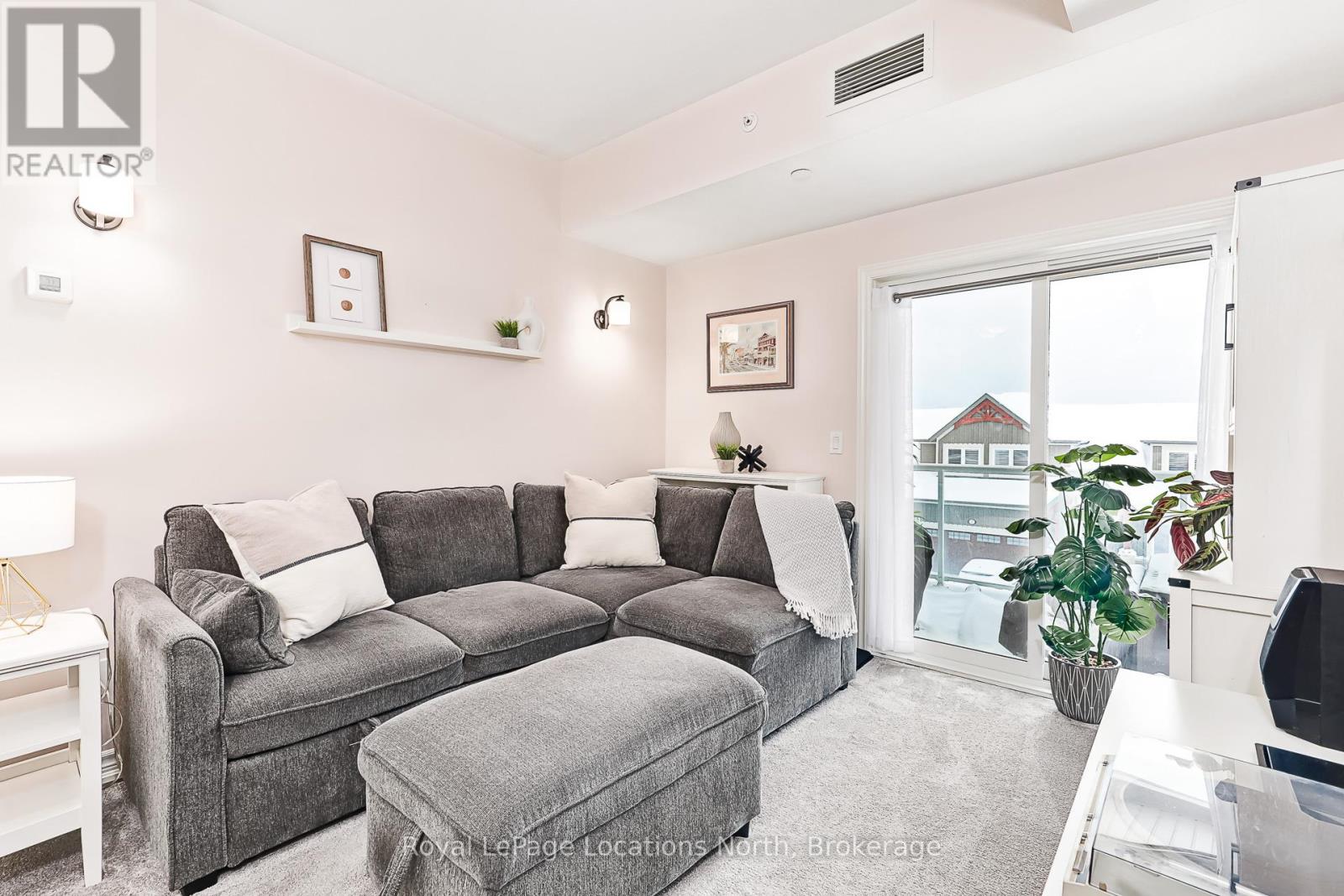 Welcome to The View at Blue Fairway. This Condor model offers 887 sq ft of thoughtfully designed living space. The beautifully upgraded suite features over $30,000 in upgrades (quartz backsplash, flooring, appliances, kitchen cabinetry, lighting, full glass shower, vanities, sinks, and fixtures), enhancing both style and functionality throughout. Enjoy a modern, open-concept layout filled with natural light, quality finishes, and attention to detail that sets this home apart. Additional features include in-suite laundry, secure underground parking with key-fob access, and a large storage closet conveniently located beside the unit. Residents enjoy access to builder amenities including a gym, outdoor pool, men's and women's change rooms, and a playground, enhancing the lifestyle appeal for families, guests, and year-round residents alike. Ideally located close to trails, golf, skiing, and downtown amenities, this exceptional condo offers modern comfort, low-maintenance living, and year-round enjoyment in one of Collingwood's most sought-after four-season destinations.This is a perfect opportunity for full-time living, weekend getaways, or investment. (id:64974)