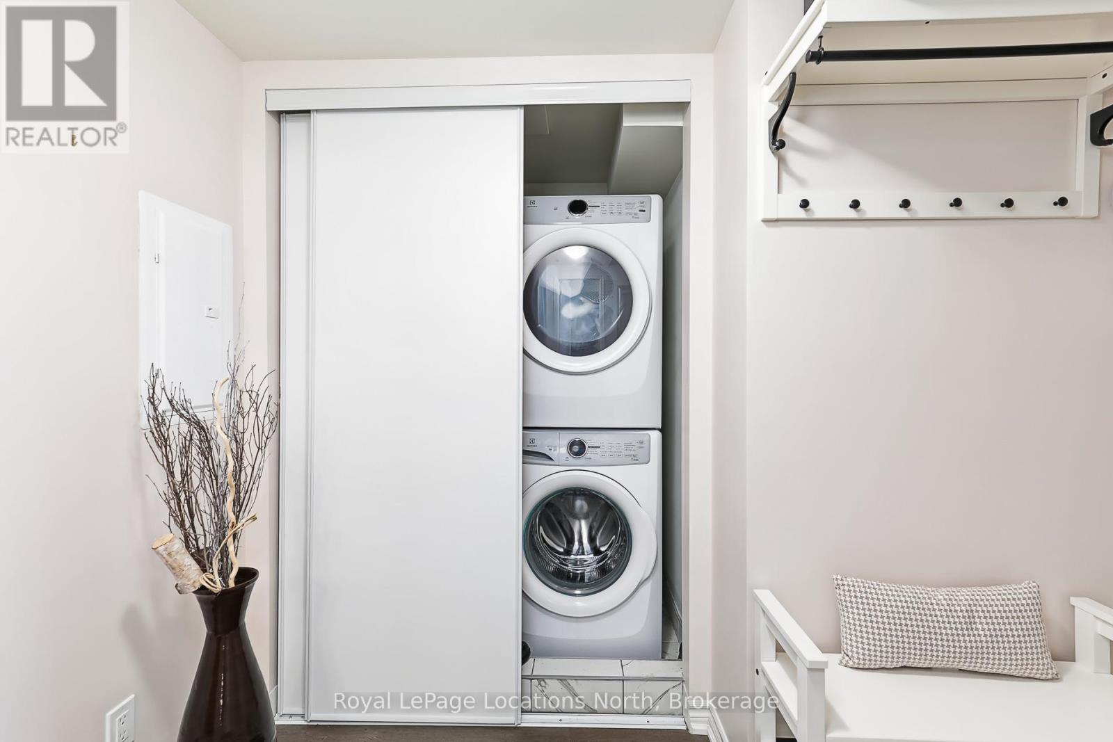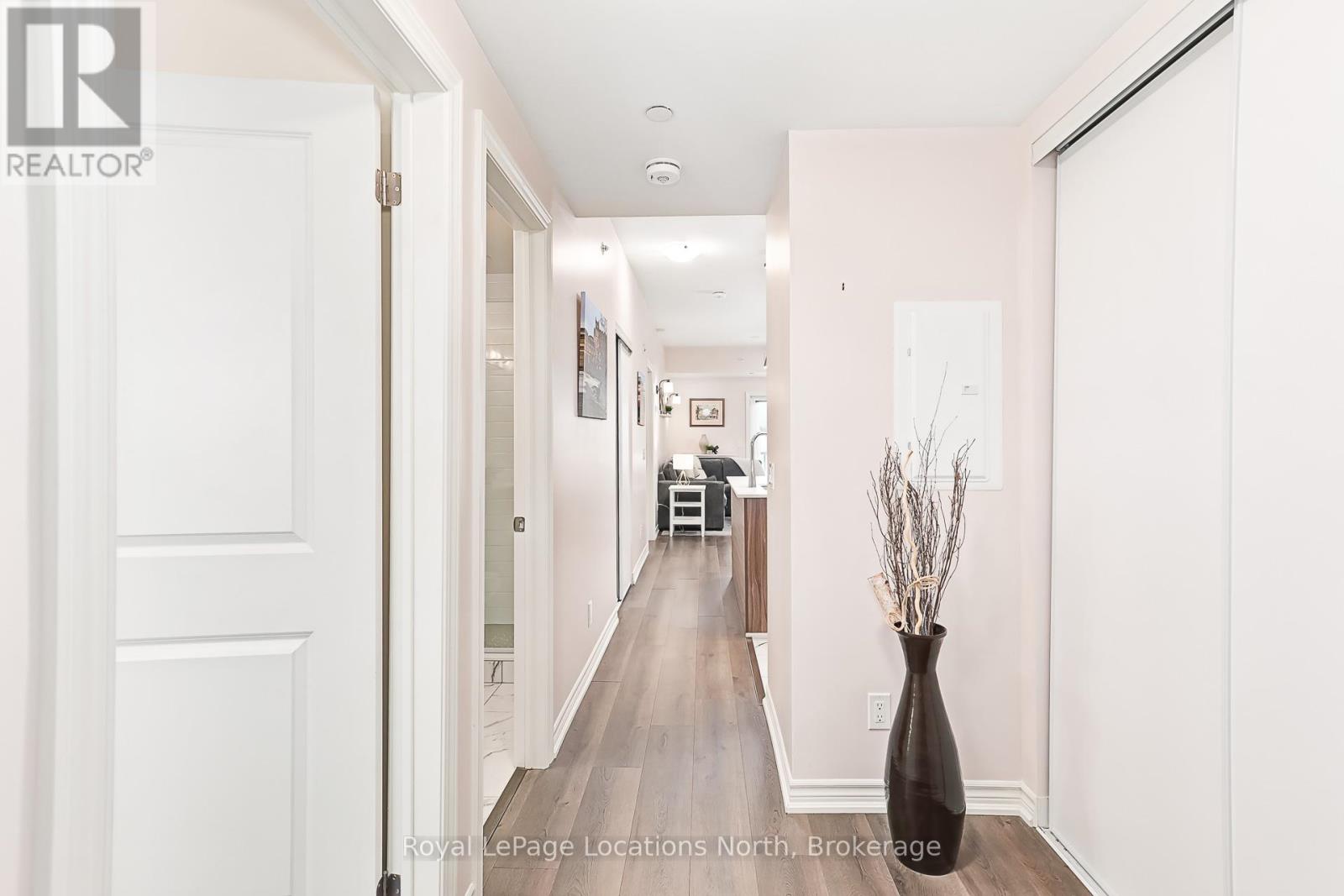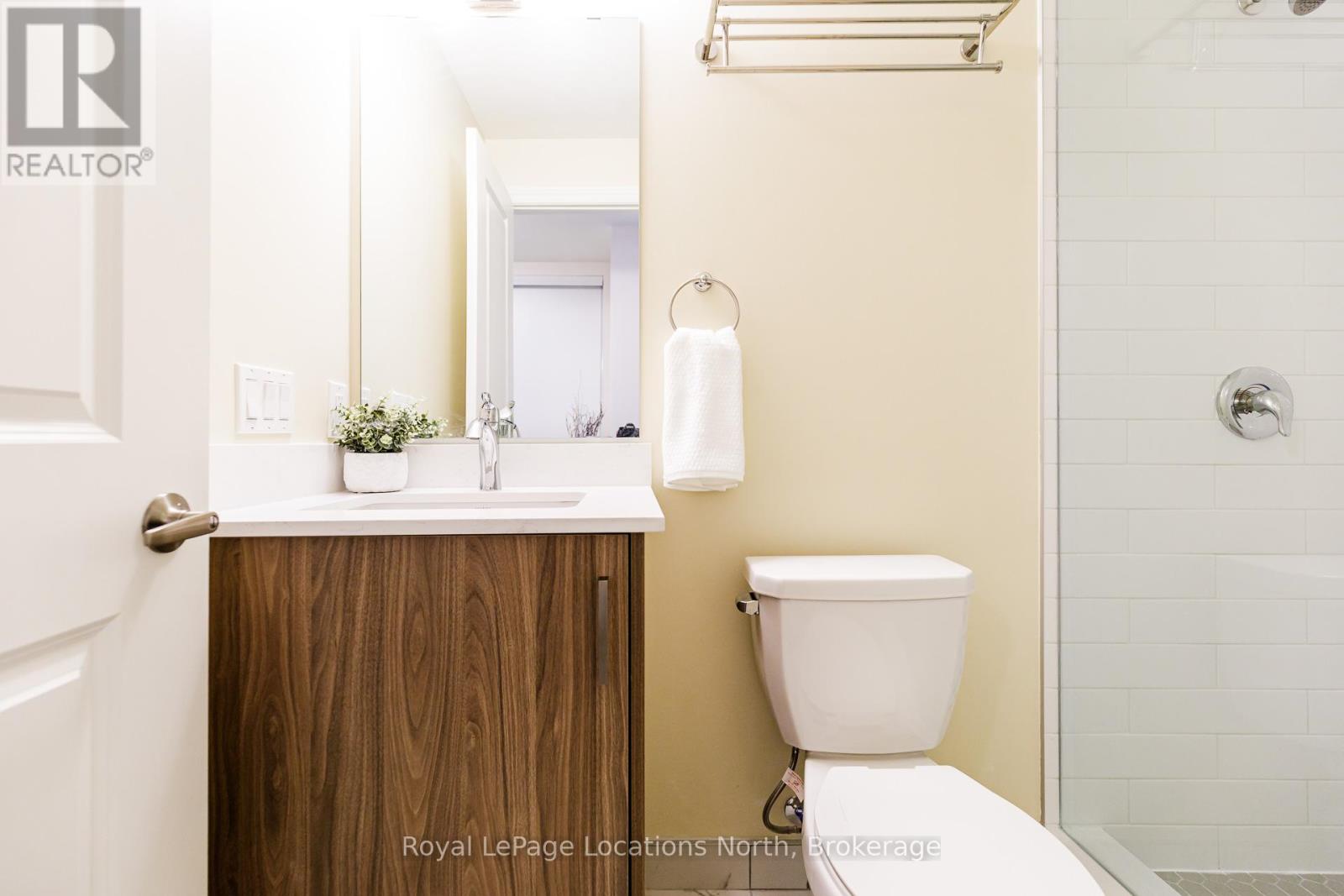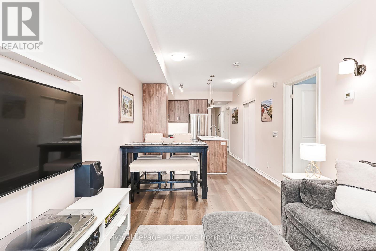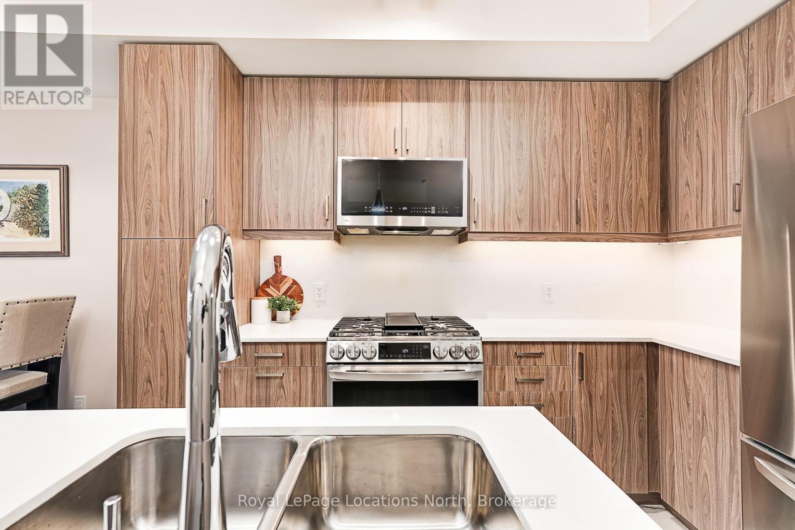 Welcome to The View at Blue Fairway. This Condor model offers 887 sq ft of thoughtfully designed living space. The beautifully upgraded suite features over $30,000 in upgrades (quartz backsplash, flooring, appliances, kitchen cabinetry, lighting, full glass shower, vanities, sinks, and fixtures), enhancing both style and functionality throughout. Enjoy a modern, open-concept layout filled with natural light, quality finishes, and attention to detail that sets this home apart. Additional features include in-suite laundry, secure underground parking with key-fob access, and a large storage closet conveniently located beside the unit. Residents enjoy access to builder amenities including a gym, outdoor pool, men's and women's change rooms, and a playground, enhancing the lifestyle appeal for families, guests, and year-round residents alike. Ideally located close to trails, golf, skiing, and downtown amenities, this exceptional condo offers modern comfort, low-maintenance living, and year-round enjoyment in one of Collingwood's most sought-after four-season destinations.This is a perfect opportunity for full-time living, weekend getaways, or investment. (id:64974)