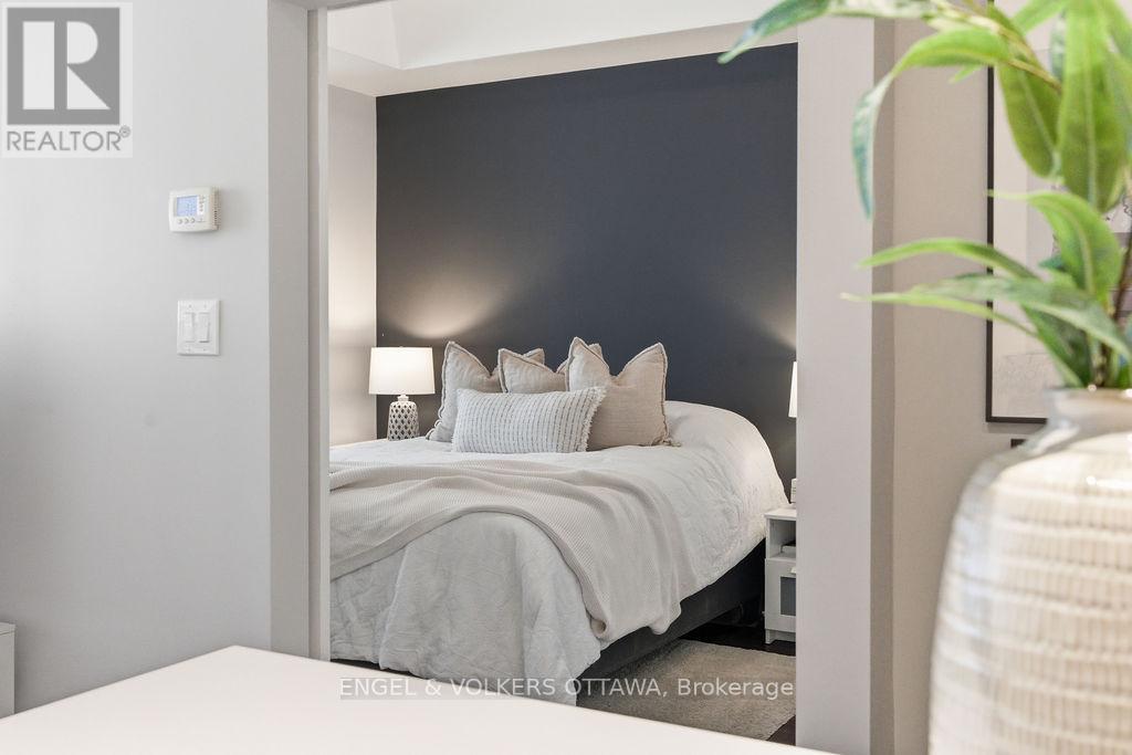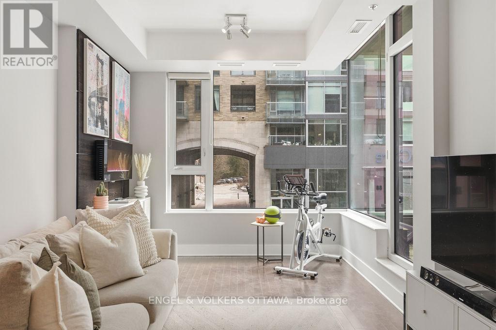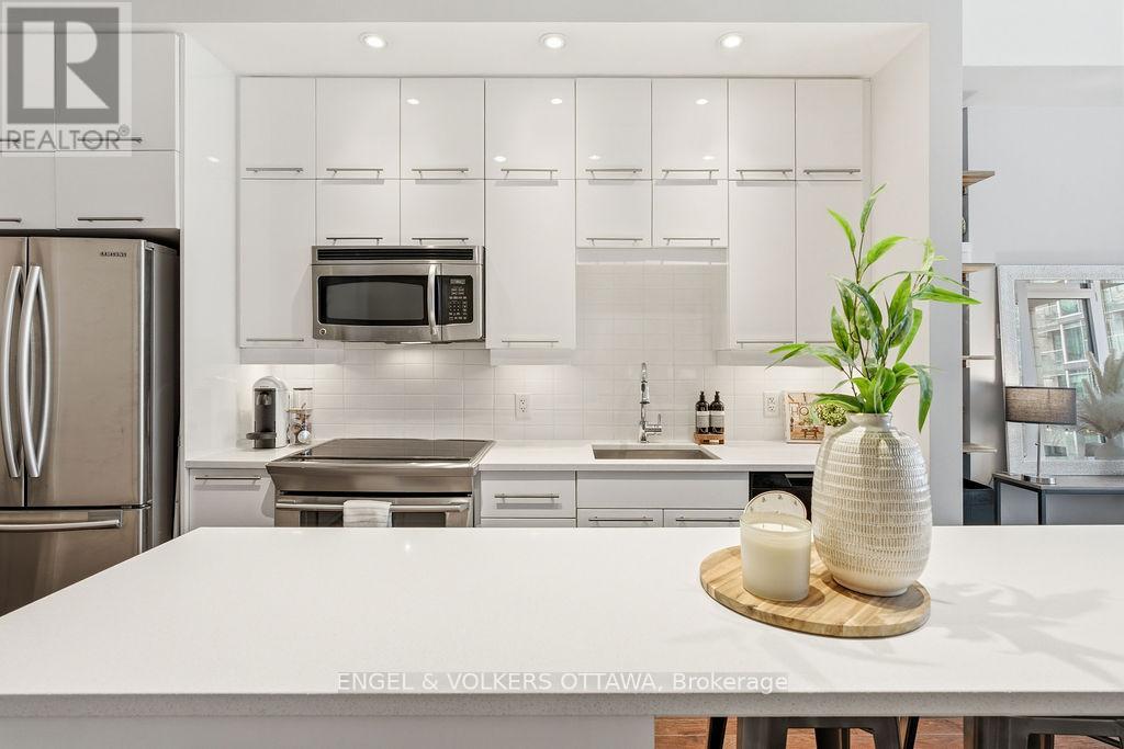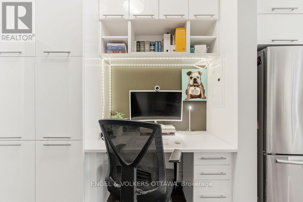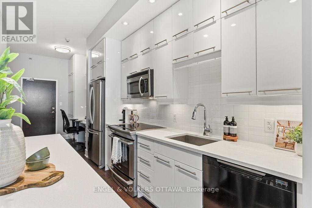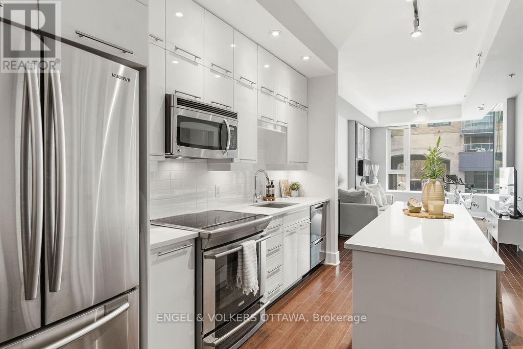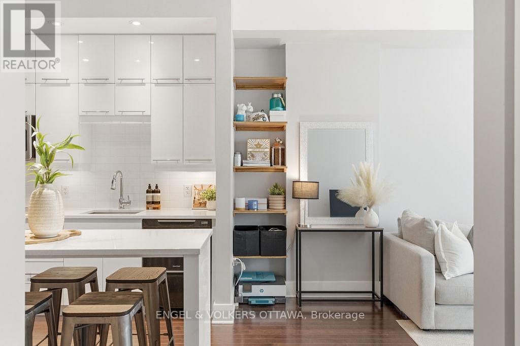 Rarely offered 1 bedroom + Study located just steps to Westboro and Wellington Village! This condo offers many coveted upgrades from soaring 9'8" ceilings, custom floor-to-ceiling built-in cabinets that span from the foyer to the kitchen, Hunter Douglas Blinds, and an oversized covered south-facing balcony. This 709sqft condo is perfect for those who work from home, but also love entertaining. With a dedicated workspace surrounded by ample storage that leads to an open concept layout. The gourmet kitchen impresses with all-white cabinetry, white quartz countertops, high end appliances including a Samsung Fridge, Fisher & Paykel Dishwasher, and Electrolux Stove. The 7'6" island offers seating for 4 - ideal for entertaining or casual meals. The living/dining is spacious with proper space for a couch and T.V, along with room for a 4-6 person dining table. Step outside onto the oversized, south-facing covered balcony (76sqft) to enjoy sunlight, fresh air, or 3-season entertaining. The primary bedroom has blackout Hunter Douglas blinds and custom built-in storage in the closet. The bathroom has an upgraded glass shower and a built-in cabinet. Amazing location - live just a 10 min walk to Lululemon, Equator Coffee, and top rated restaurants. Or, a 10 min stroll to the amenities along Wellington St. 1 underground parking (P3-114), 1 Storage Locker (P2-39) and 1 Bike Rack Included! Amenities include: Gym, Theatre Room, Party Room, Car Wash Bay, Pet Wash, and Rooftop Terrace with BBQs! Minutes from Bicycle Trails, Parks & Ottawa River Parkway. OPEN HOUSE, SUNDAY MARCH 15TH FROM 2-4PM. (id:64974)
