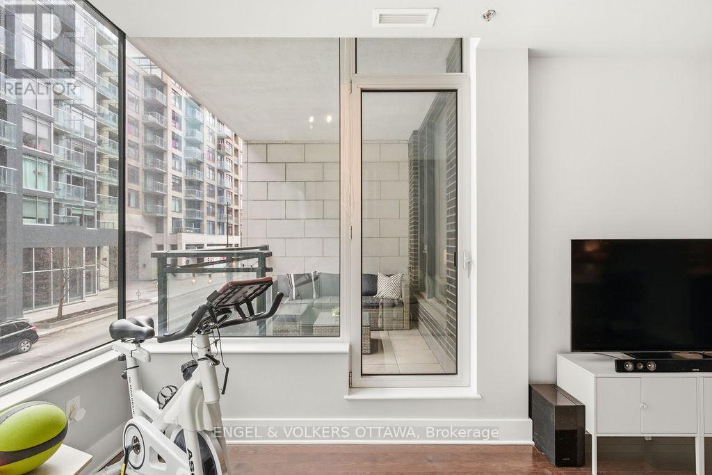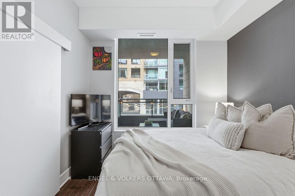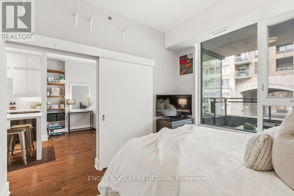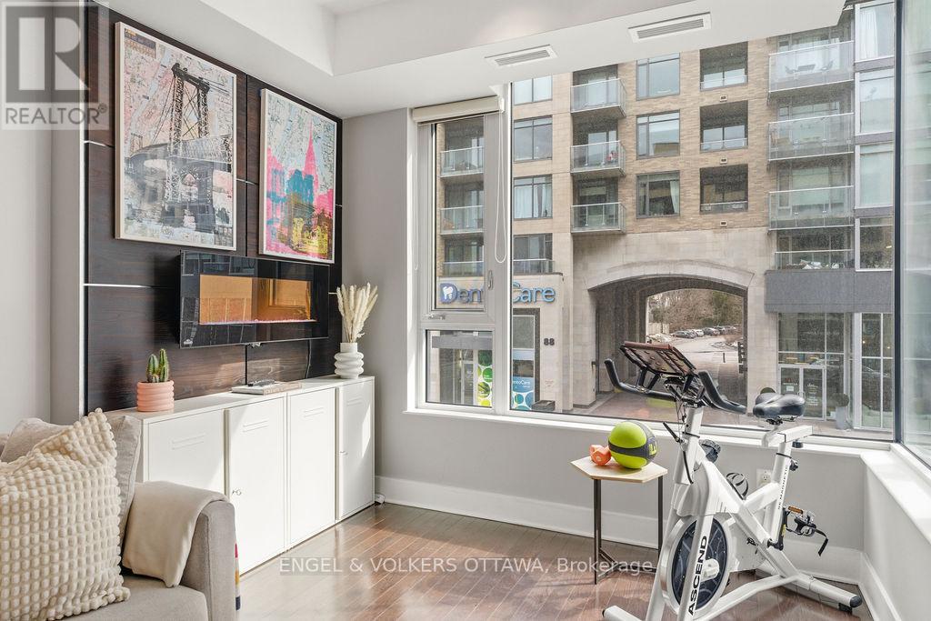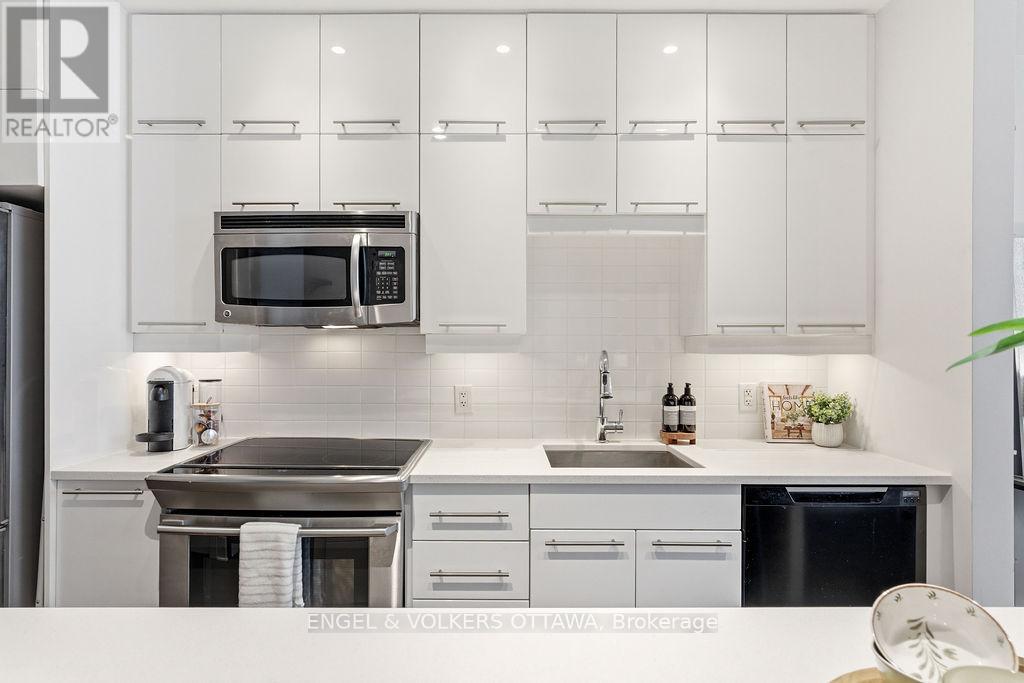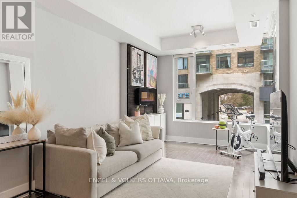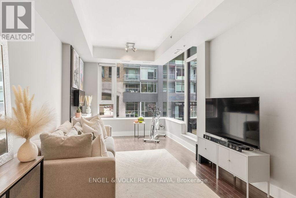 Rarely offered 1 bedroom + Study located just steps to Westboro and Wellington Village! This condo offers many coveted upgrades from soaring 9'8" ceilings, custom floor-to-ceiling built-in cabinets that span from the foyer to the kitchen, Hunter Douglas Blinds, and an oversized covered south-facing balcony. This 709sqft condo is perfect for those who work from home, but also love entertaining. With a dedicated workspace surrounded by ample storage that leads to an open concept layout. The gourmet kitchen impresses with all-white cabinetry, white quartz countertops, high end appliances including a Samsung Fridge, Fisher & Paykel Dishwasher, and Electrolux Stove. The 7'6" island offers seating for 4 - ideal for entertaining or casual meals. The living/dining is spacious with proper space for a couch and T.V, along with room for a 4-6 person dining table. Step outside onto the oversized, south-facing covered balcony (76sqft) to enjoy sunlight, fresh air, or 3-season entertaining. The primary bedroom has blackout Hunter Douglas blinds and custom built-in storage in the closet. The bathroom has an upgraded glass shower and a built-in cabinet. Amazing location - live just a 10 min walk to Lululemon, Equator Coffee, and top rated restaurants. Or, a 10 min stroll to the amenities along Wellington St. 1 underground parking (P3-114), 1 Storage Locker (P2-39) and 1 Bike Rack Included! Amenities include: Gym, Theatre Room, Party Room, Car Wash Bay, Pet Wash, and Rooftop Terrace with BBQs! Minutes from Bicycle Trails, Parks & Ottawa River Parkway. OPEN HOUSE, SUNDAY MARCH 15TH FROM 2-4PM. (id:64974)