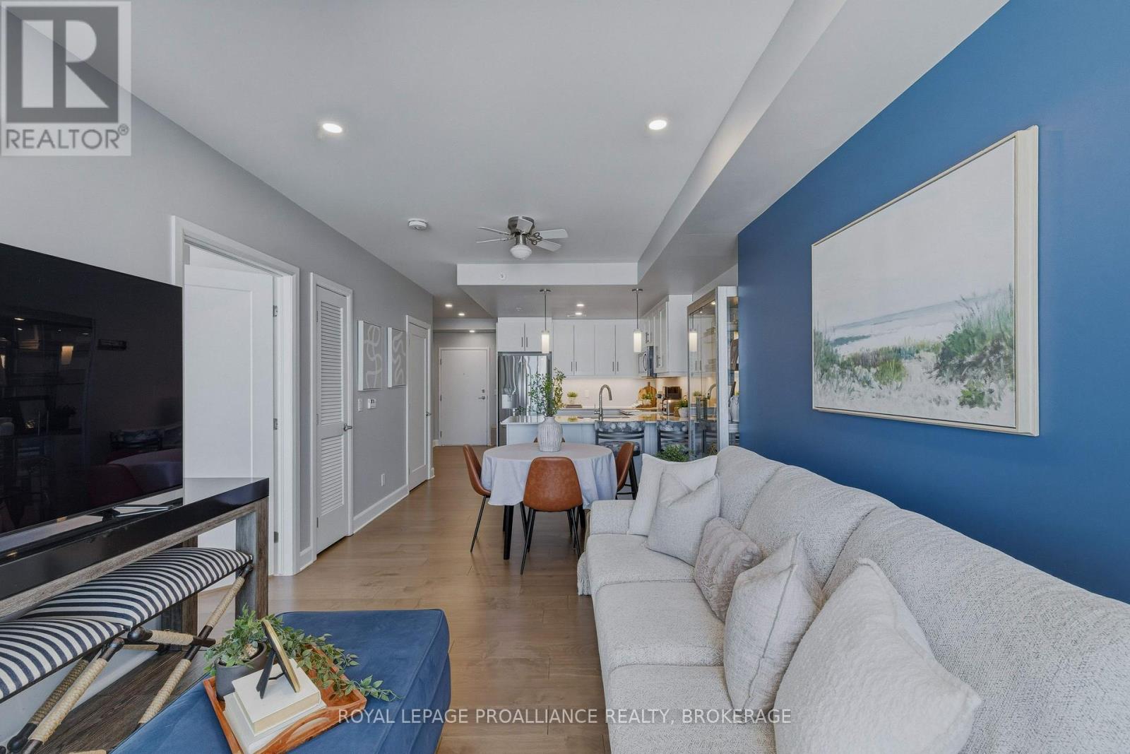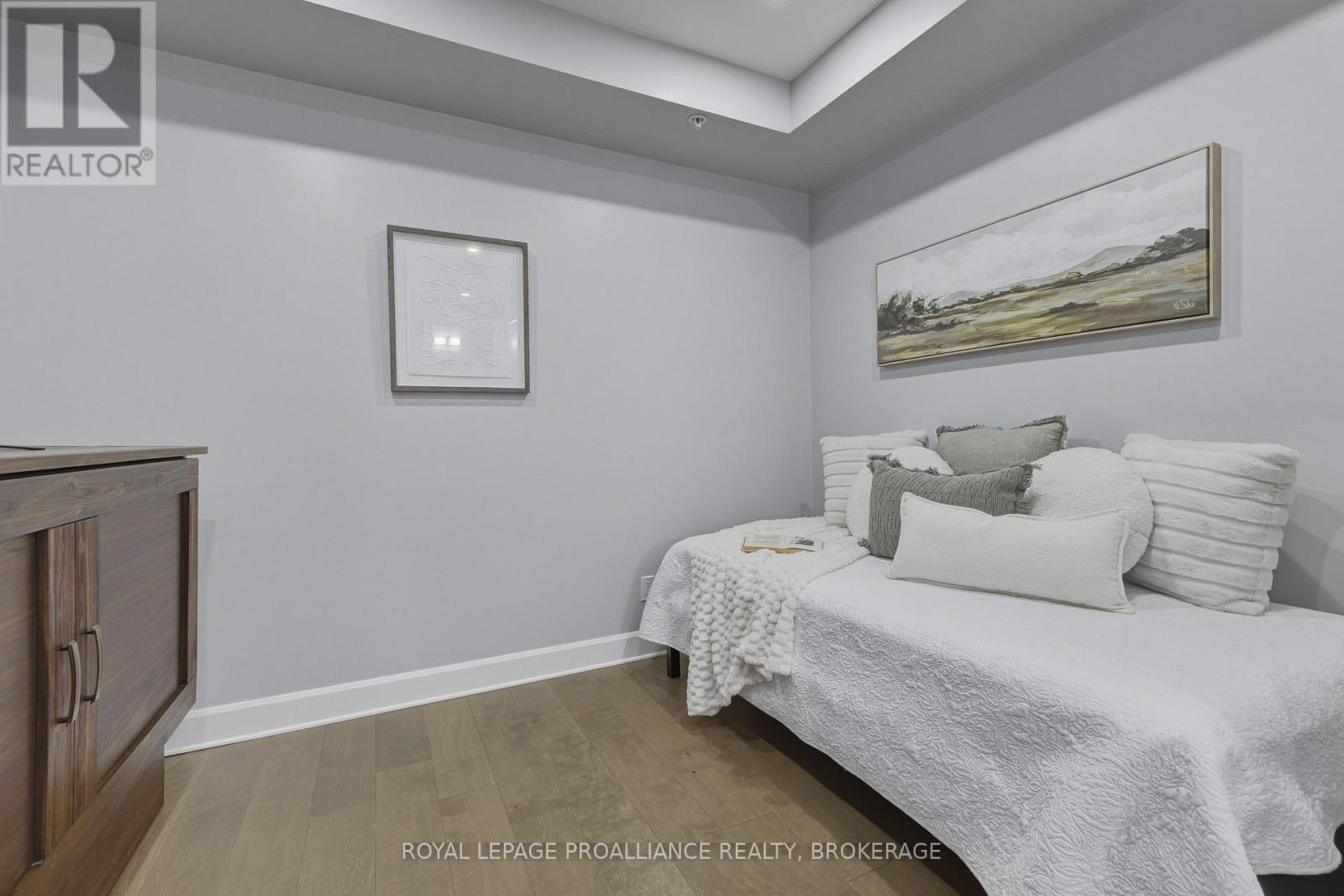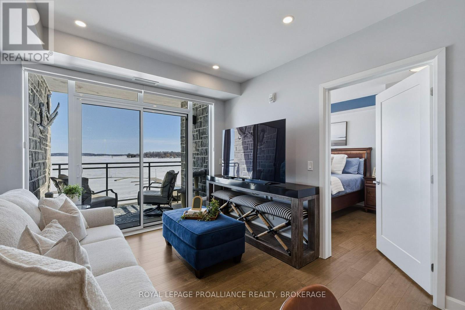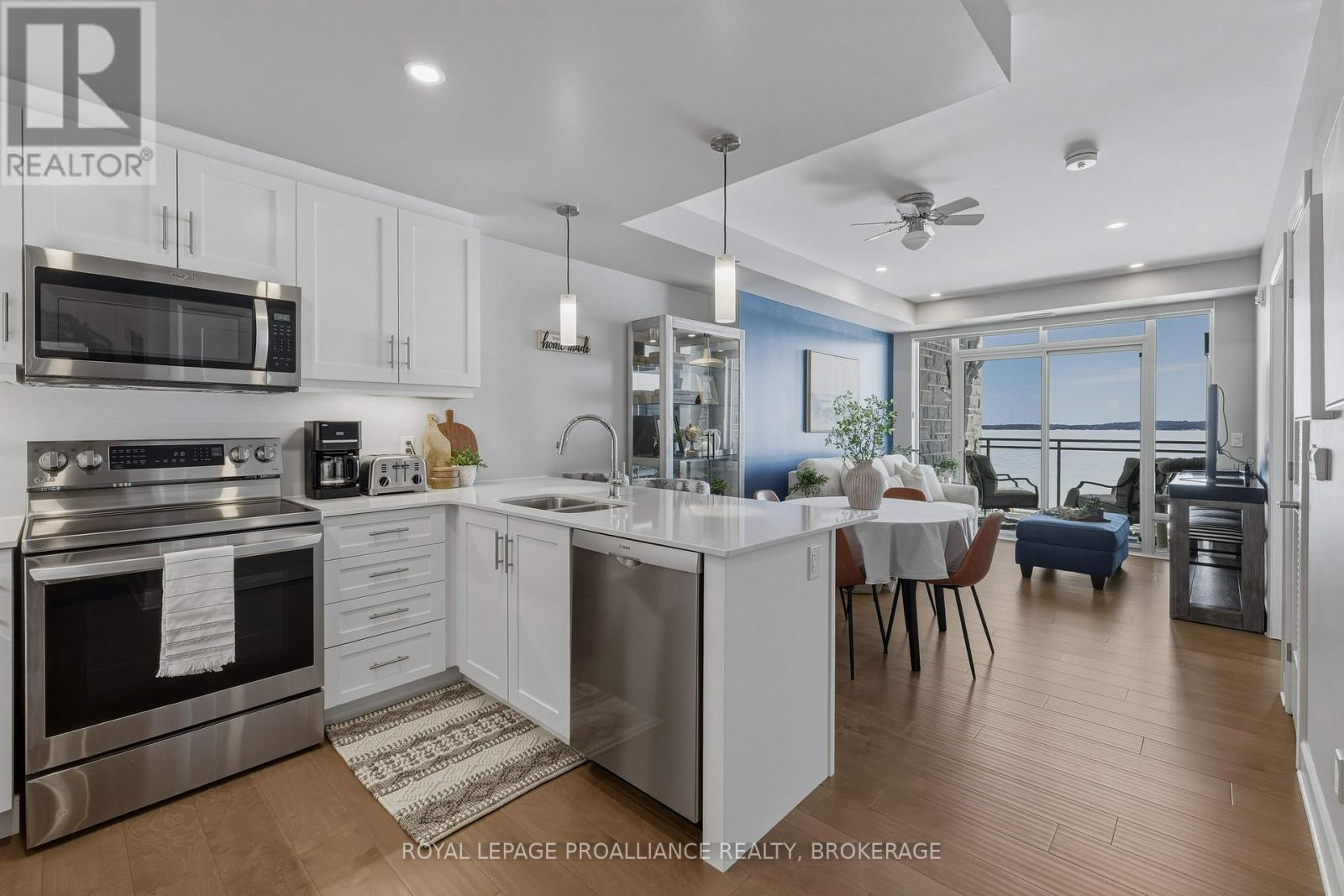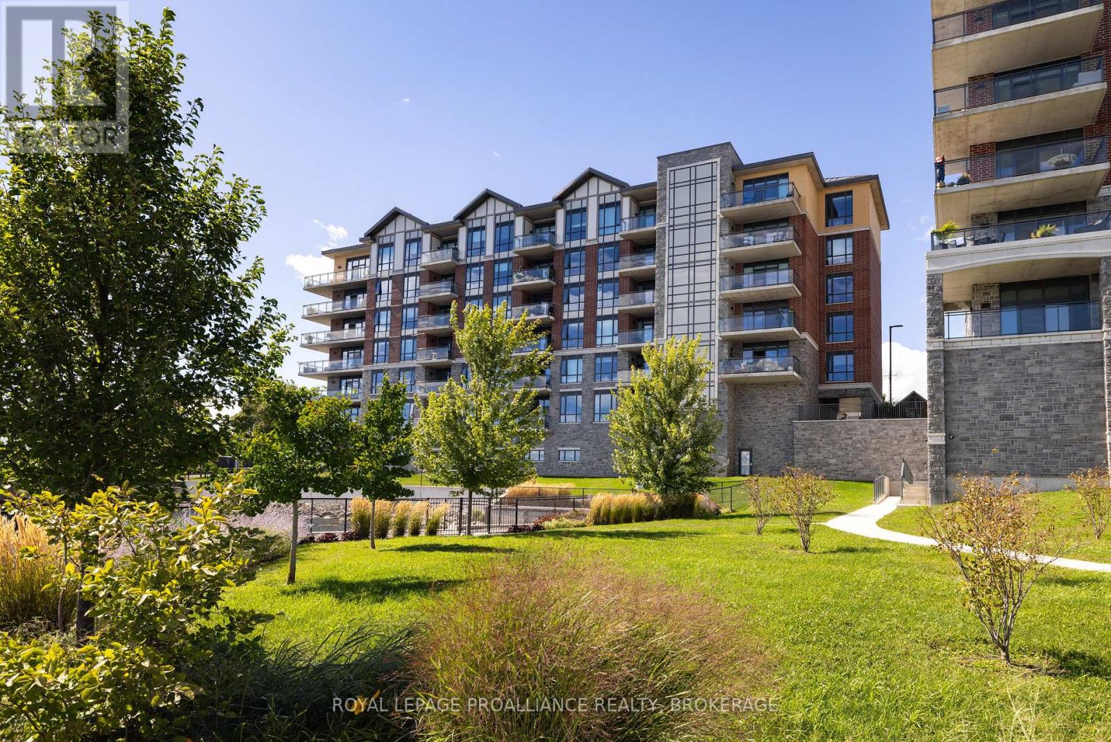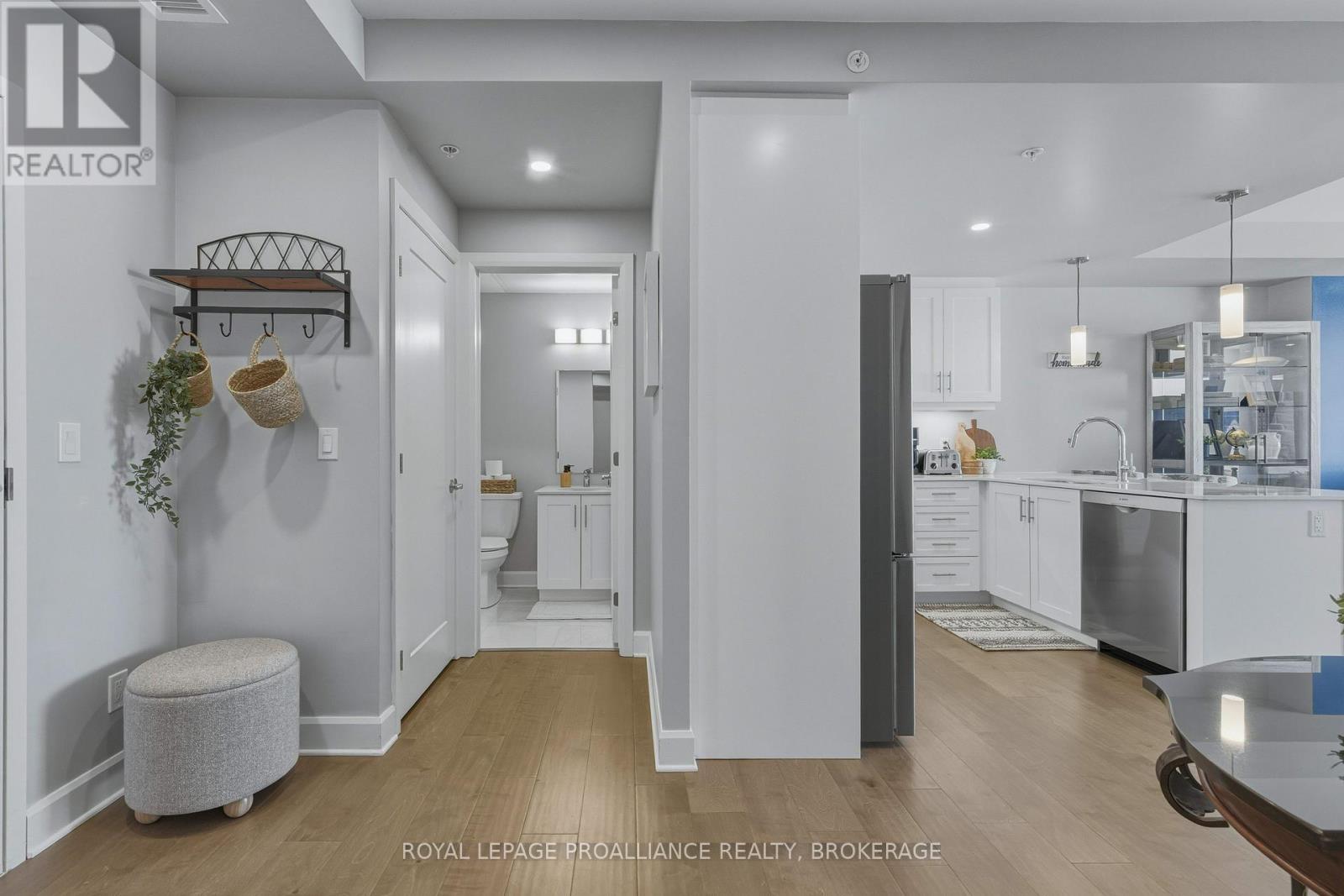 Welcome to carefree waterfront living Gananoque, nestled along the stunning St. Lawrence River. This beautifully appointed 1-bedroom plus den condo offers an exceptional lifestyle in a newer, upscale building just steps from the water.Designed with comfort and style in mind, the open-concept layout features an upgraded kitchen with quality finishes, seamlessly flowing into the bright living and dining areas. Engineered hardwood floors run throughout, creating a completely carpet-free space that is both elegant and easy to maintain. The spacious primary bedroom is complemented by a full ensuite bathroom, while a convenient powder room adds flexibility for guests. The den provides the perfect spot for a home office, reading nook, or overnight visitors.Residents enjoy outstanding amenities, including a waterfront park and scenic walking trail, a well-equipped gym, and a fantastic community party room complete with a pool table and full kitchen - ideal for entertaining. A communal BBQ area invites outdoor gatherings, and secured underground parking offers added convenience and peace of mind.All of this within walking distance to the waterfront, the renowned Thousand Islands Playhouse, as well as local restaurants and boutique shops.An exceptional opportunity to enjoy low-maintenance living in one of Eastern Ontario's most picturesque communities. Please note: property taxes are currently being reassessed and are expected to be reduced - contact the listing agent for further details. (id:64974)