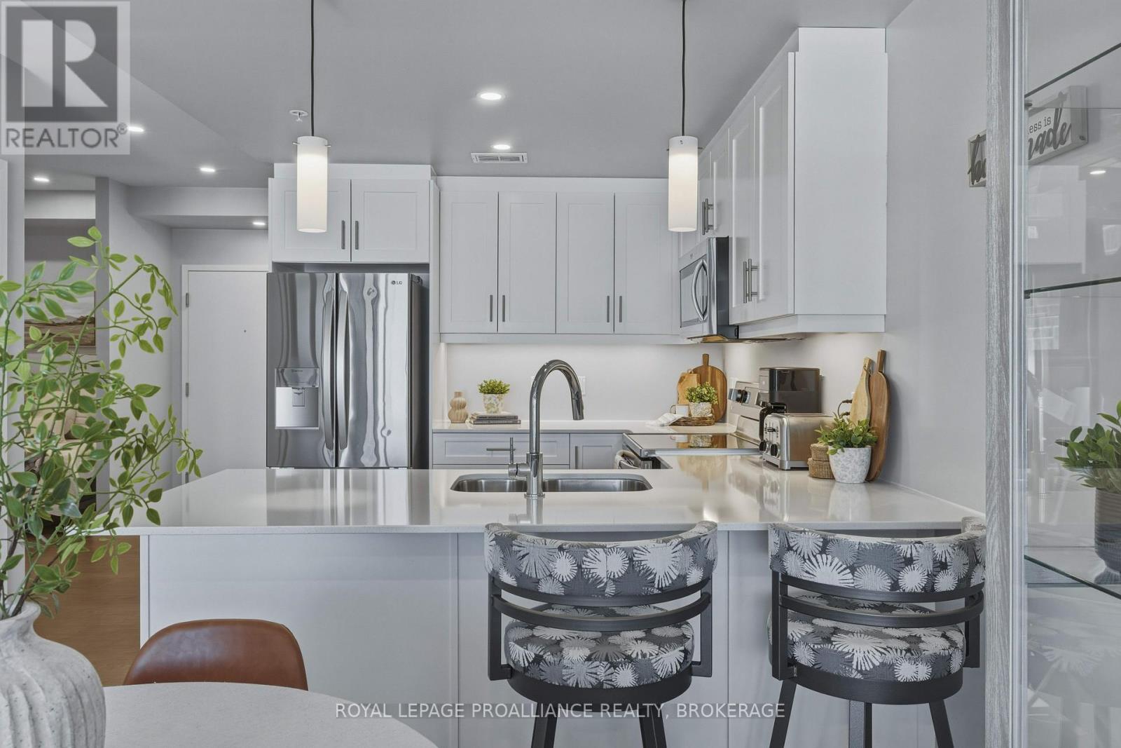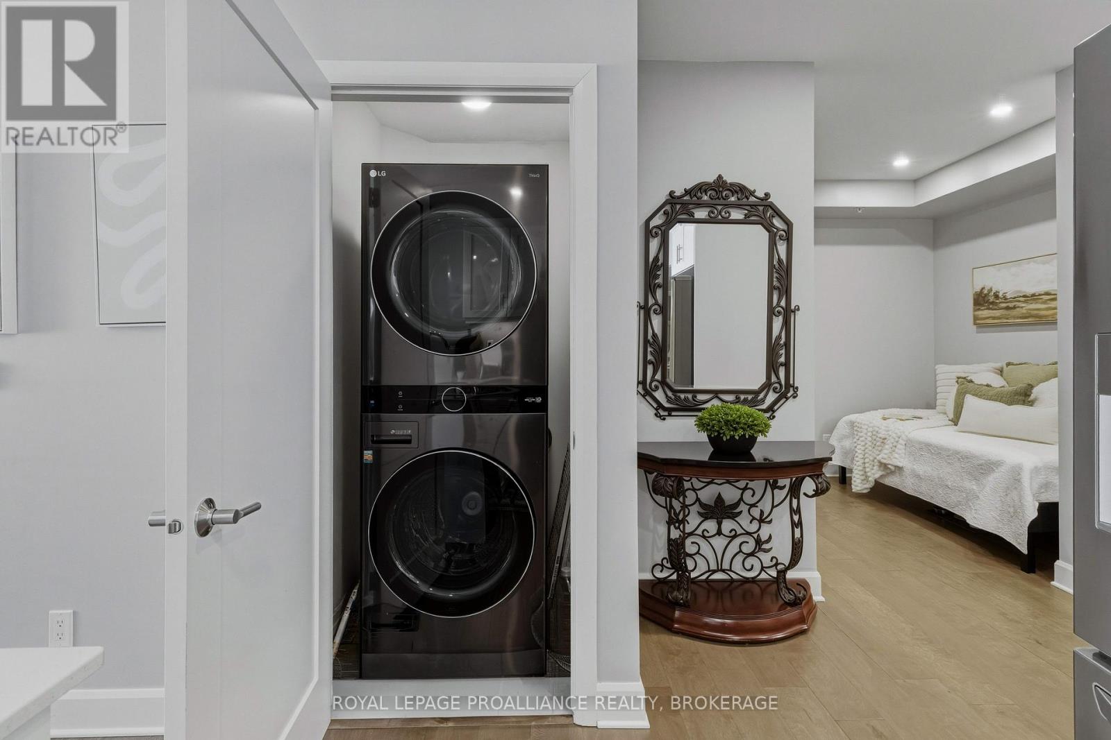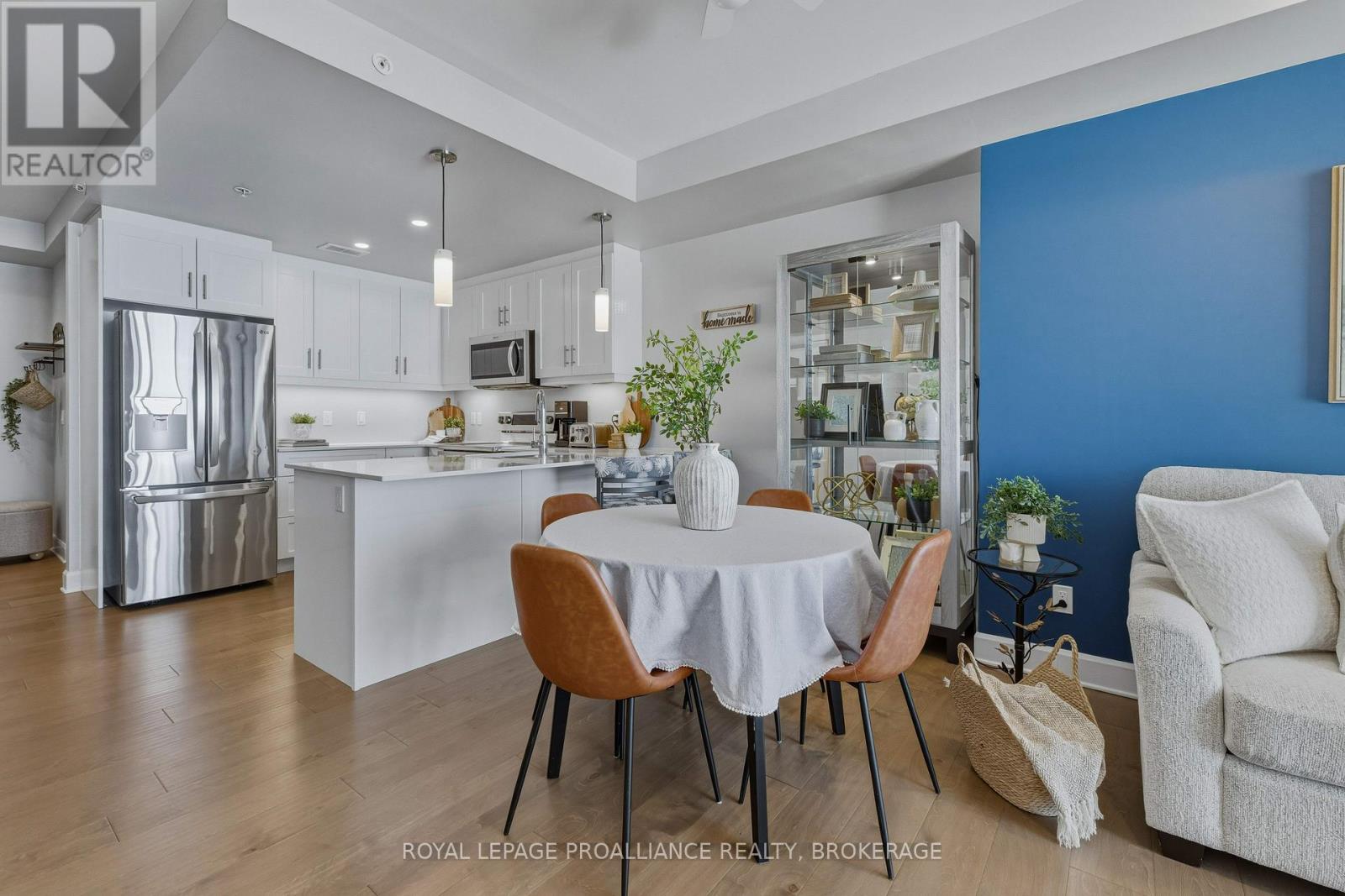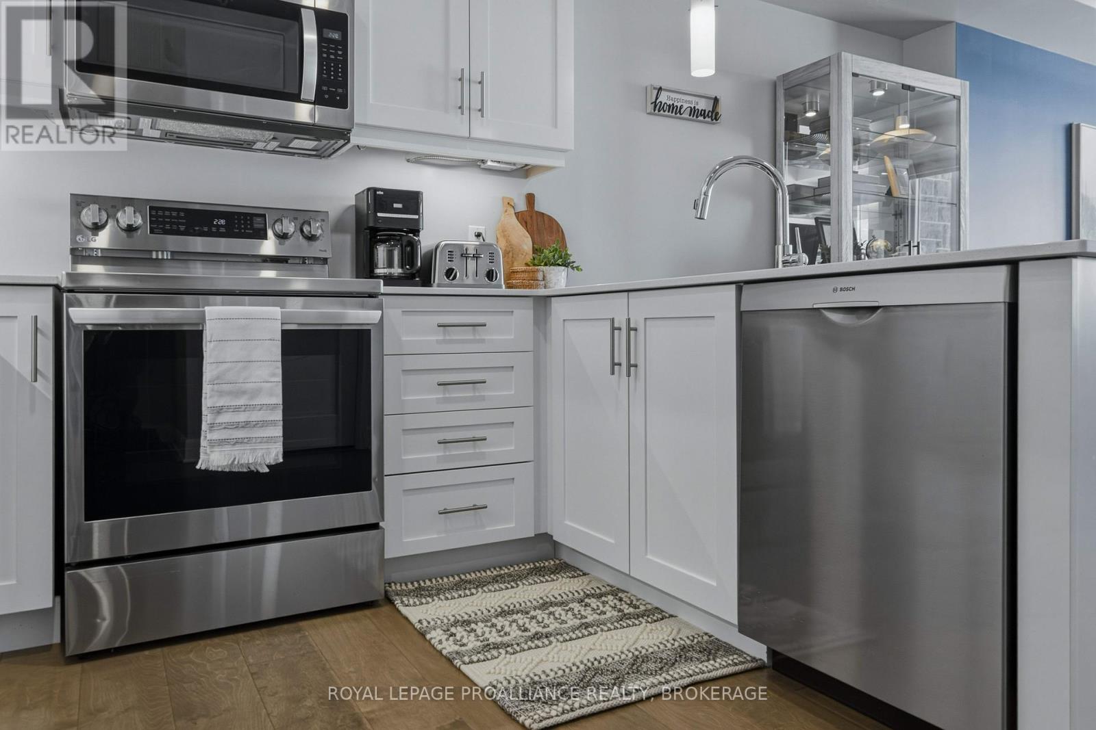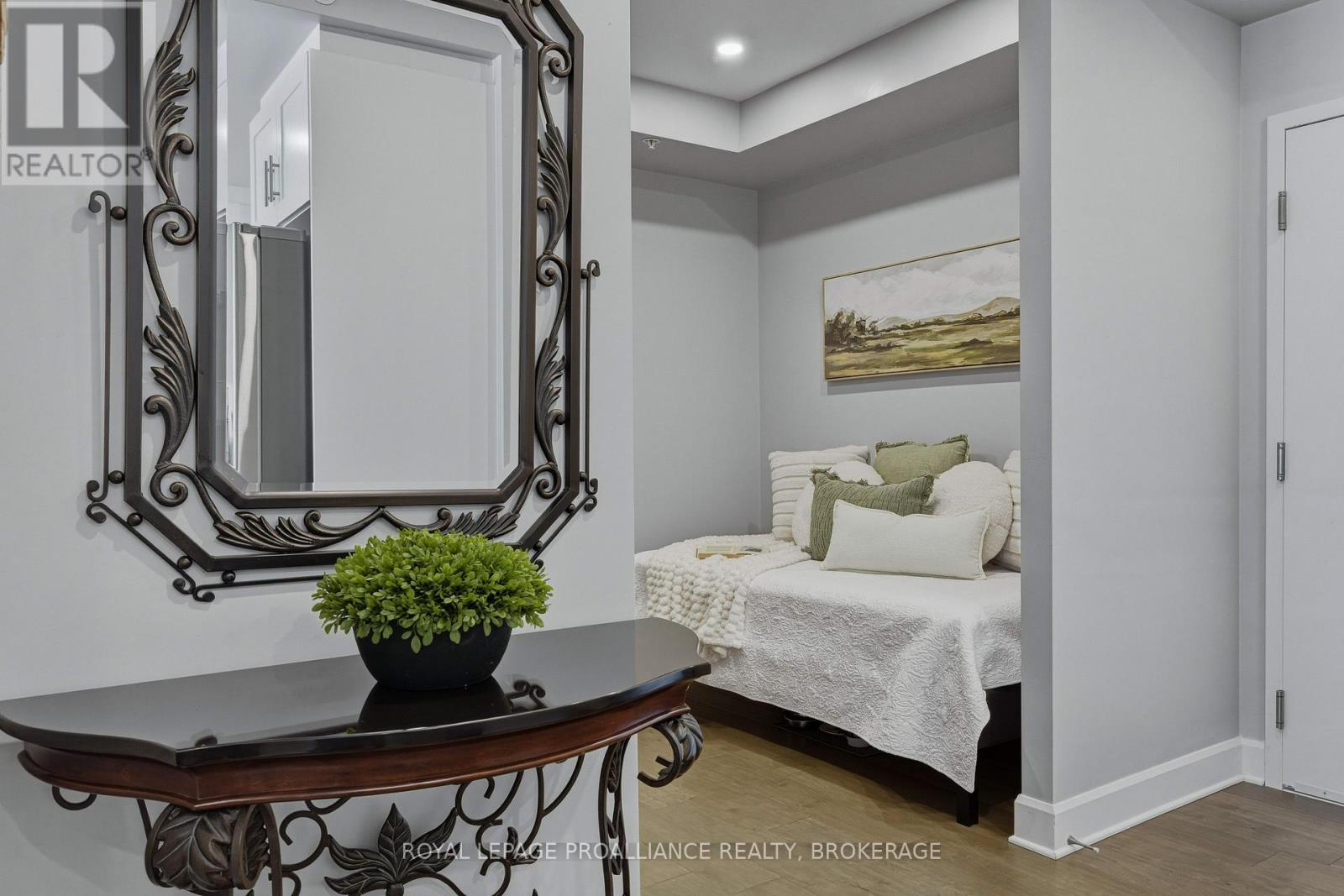 Welcome to carefree waterfront living Gananoque, nestled along the stunning St. Lawrence River. This beautifully appointed 1-bedroom plus den condo offers an exceptional lifestyle in a newer, upscale building just steps from the water.Designed with comfort and style in mind, the open-concept layout features an upgraded kitchen with quality finishes, seamlessly flowing into the bright living and dining areas. Engineered hardwood floors run throughout, creating a completely carpet-free space that is both elegant and easy to maintain. The spacious primary bedroom is complemented by a full ensuite bathroom, while a convenient powder room adds flexibility for guests. The den provides the perfect spot for a home office, reading nook, or overnight visitors.Residents enjoy outstanding amenities, including a waterfront park and scenic walking trail, a well-equipped gym, and a fantastic community party room complete with a pool table and full kitchen - ideal for entertaining. A communal BBQ area invites outdoor gatherings, and secured underground parking offers added convenience and peace of mind.All of this within walking distance to the waterfront, the renowned Thousand Islands Playhouse, as well as local restaurants and boutique shops.An exceptional opportunity to enjoy low-maintenance living in one of Eastern Ontario's most picturesque communities. Please note: property taxes are currently being reassessed and are expected to be reduced - contact the listing agent for further details. (id:64974)