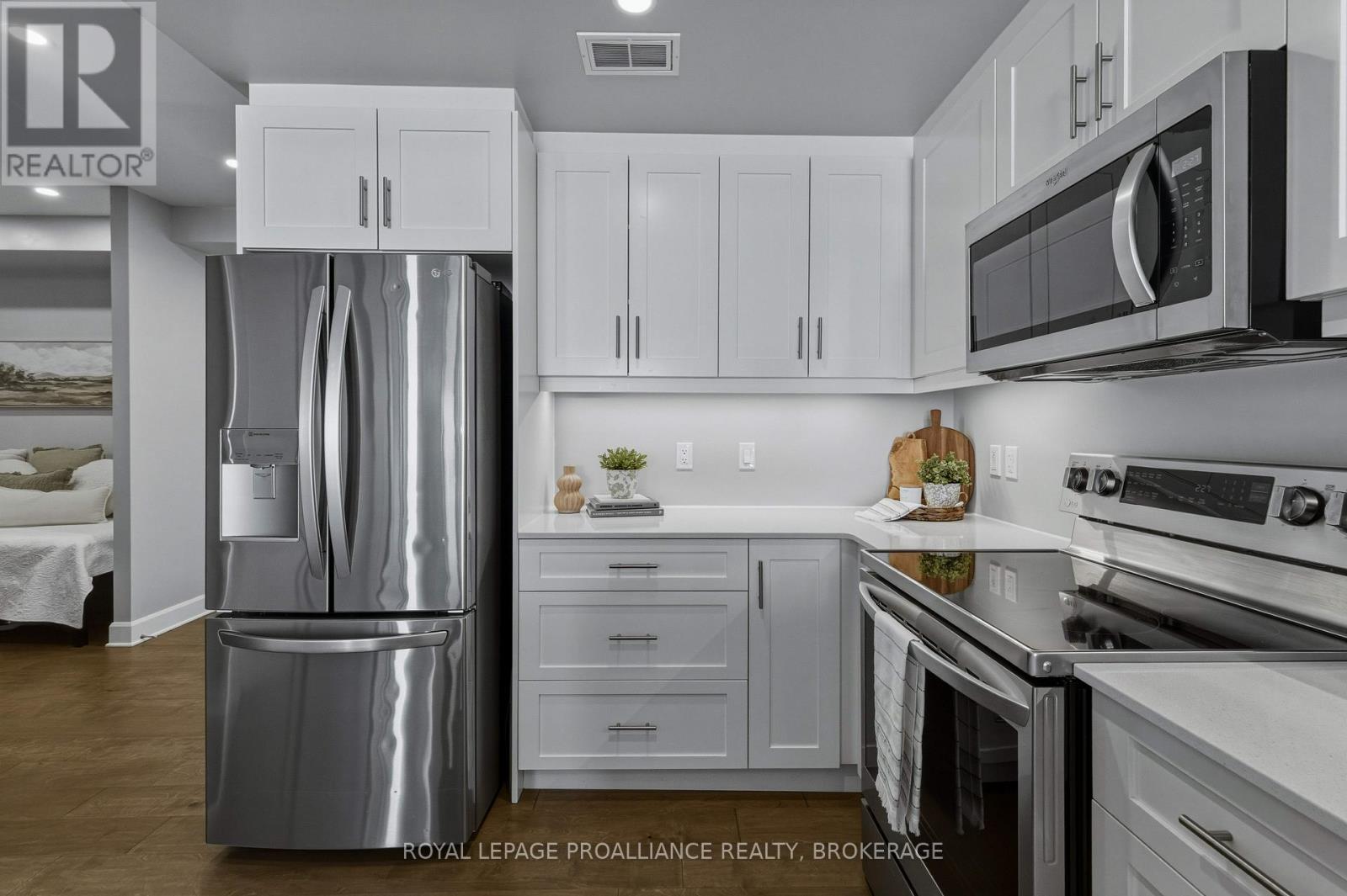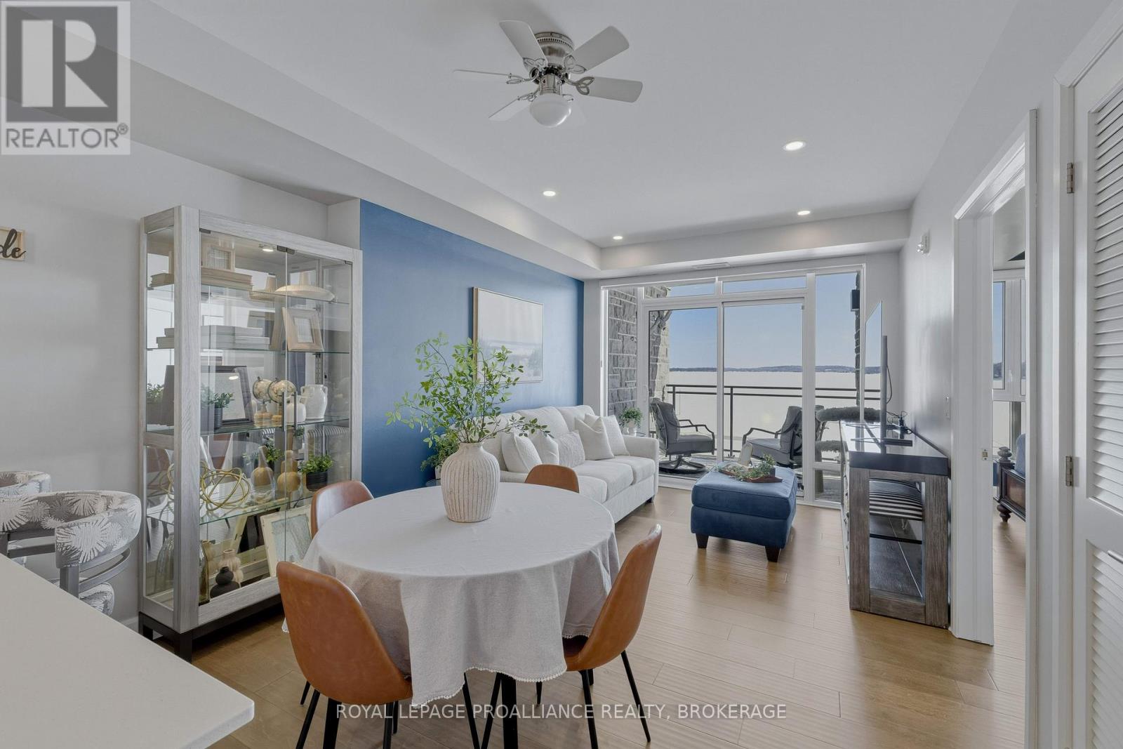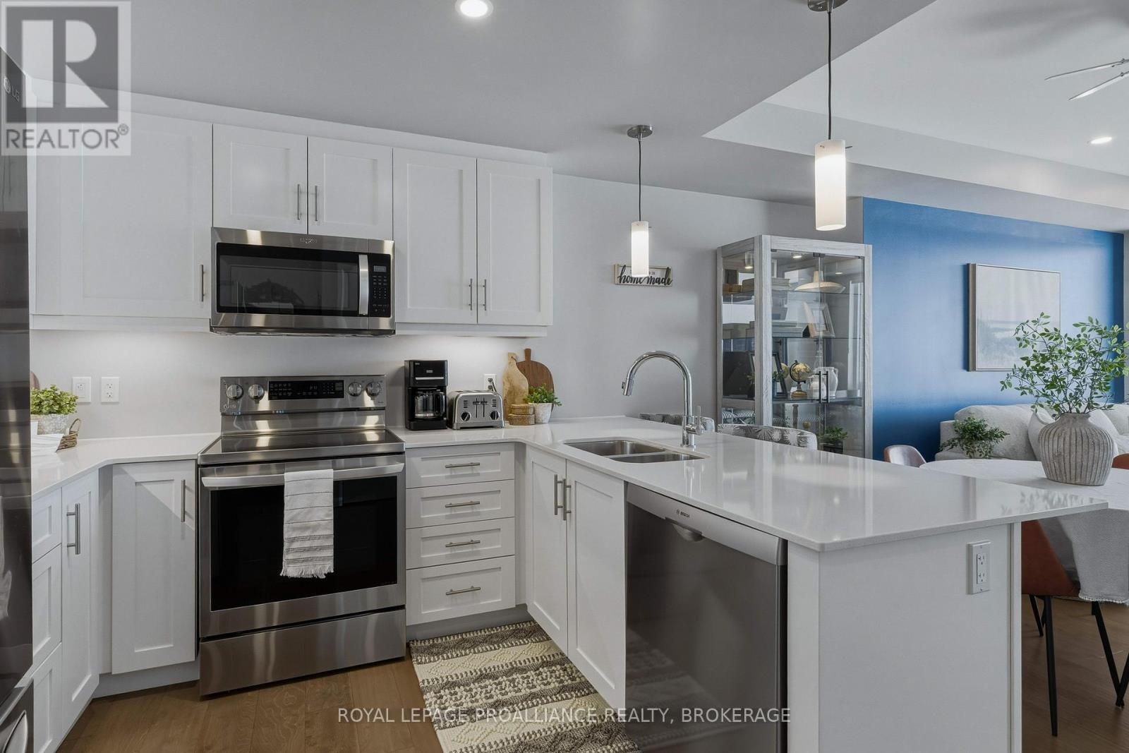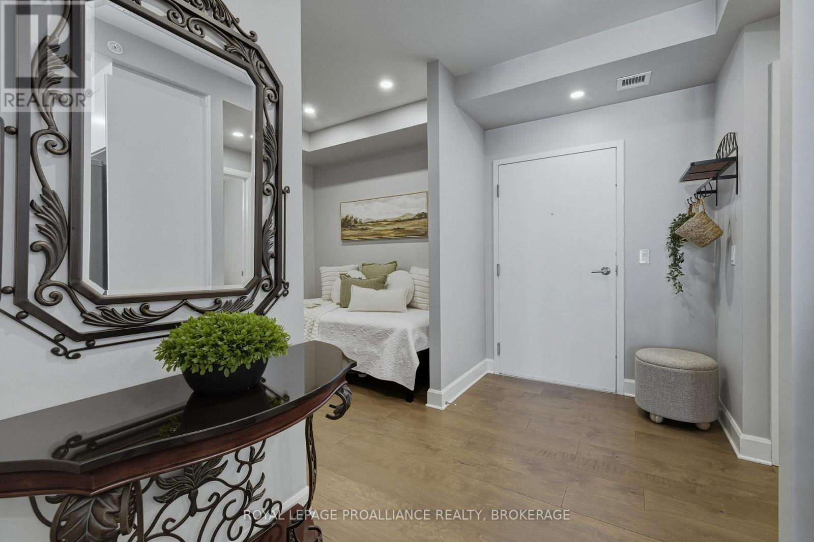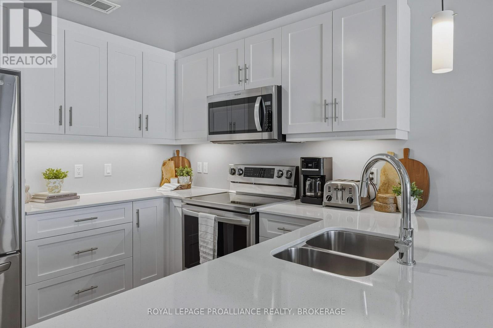 Welcome to carefree waterfront living Gananoque, nestled along the stunning St. Lawrence River. This beautifully appointed 1-bedroom plus den condo offers an exceptional lifestyle in a newer, upscale building just steps from the water.Designed with comfort and style in mind, the open-concept layout features an upgraded kitchen with quality finishes, seamlessly flowing into the bright living and dining areas. Engineered hardwood floors run throughout, creating a completely carpet-free space that is both elegant and easy to maintain. The spacious primary bedroom is complemented by a full ensuite bathroom, while a convenient powder room adds flexibility for guests. The den provides the perfect spot for a home office, reading nook, or overnight visitors.Residents enjoy outstanding amenities, including a waterfront park and scenic walking trail, a well-equipped gym, and a fantastic community party room complete with a pool table and full kitchen - ideal for entertaining. A communal BBQ area invites outdoor gatherings, and secured underground parking offers added convenience and peace of mind.All of this within walking distance to the waterfront, the renowned Thousand Islands Playhouse, as well as local restaurants and boutique shops.An exceptional opportunity to enjoy low-maintenance living in one of Eastern Ontario's most picturesque communities. Please note: property taxes are currently being reassessed and are expected to be reduced - contact the listing agent for further details. (id:64974)