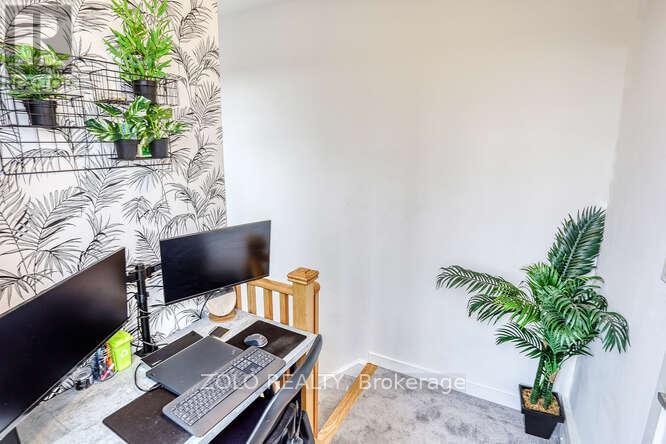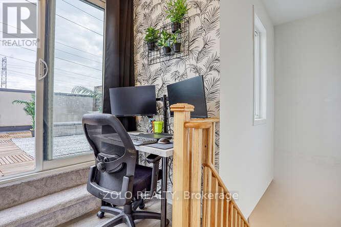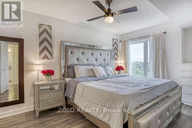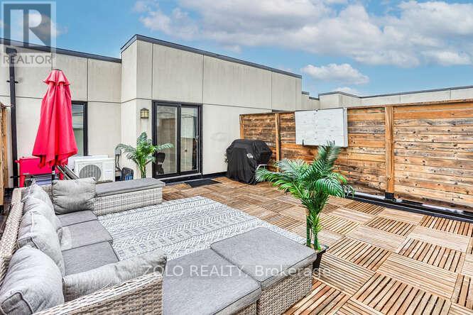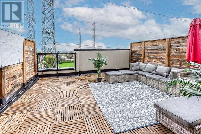Welcome to UNIT #218 a lovely stacked townhouse by Marshall Homes in Pickering's sought-after Center Point Towns community. This stylish home offers a bright open-concept layout featuring a modern bright kitchen with a center island, stainless steel appliances, and a double sink, flowing into a cozy living area with laminate flooring and a balcony with sunny east exposure. The upper level offers a spacious primary bedroom boasts his-and-hers closets and a 4-piece ensuite, while the second bedroom includes a large window & double-door closet. Enjoy the convenience of a second full bath and in-unit laundry. Step up to the large sun filled private rooftop terrace with gas BBQ hookup, privacy fencing, hose bib, and plenty of room to relax or entertain, you won't be missing a yard with a this space and low maintenance living. Close to GO Transit, Hwy 401, shopping, restaurants, and more. A perfect turnkey home in a vibrant location. (id:64974)