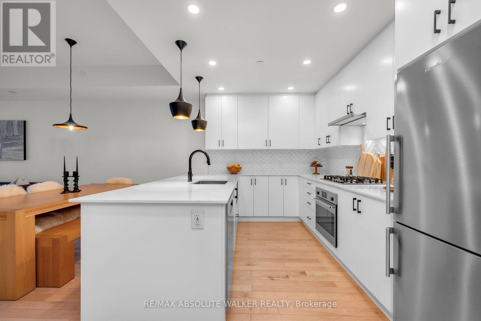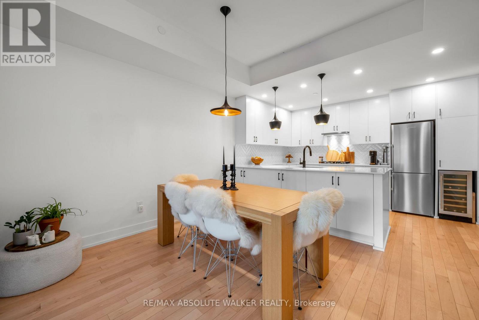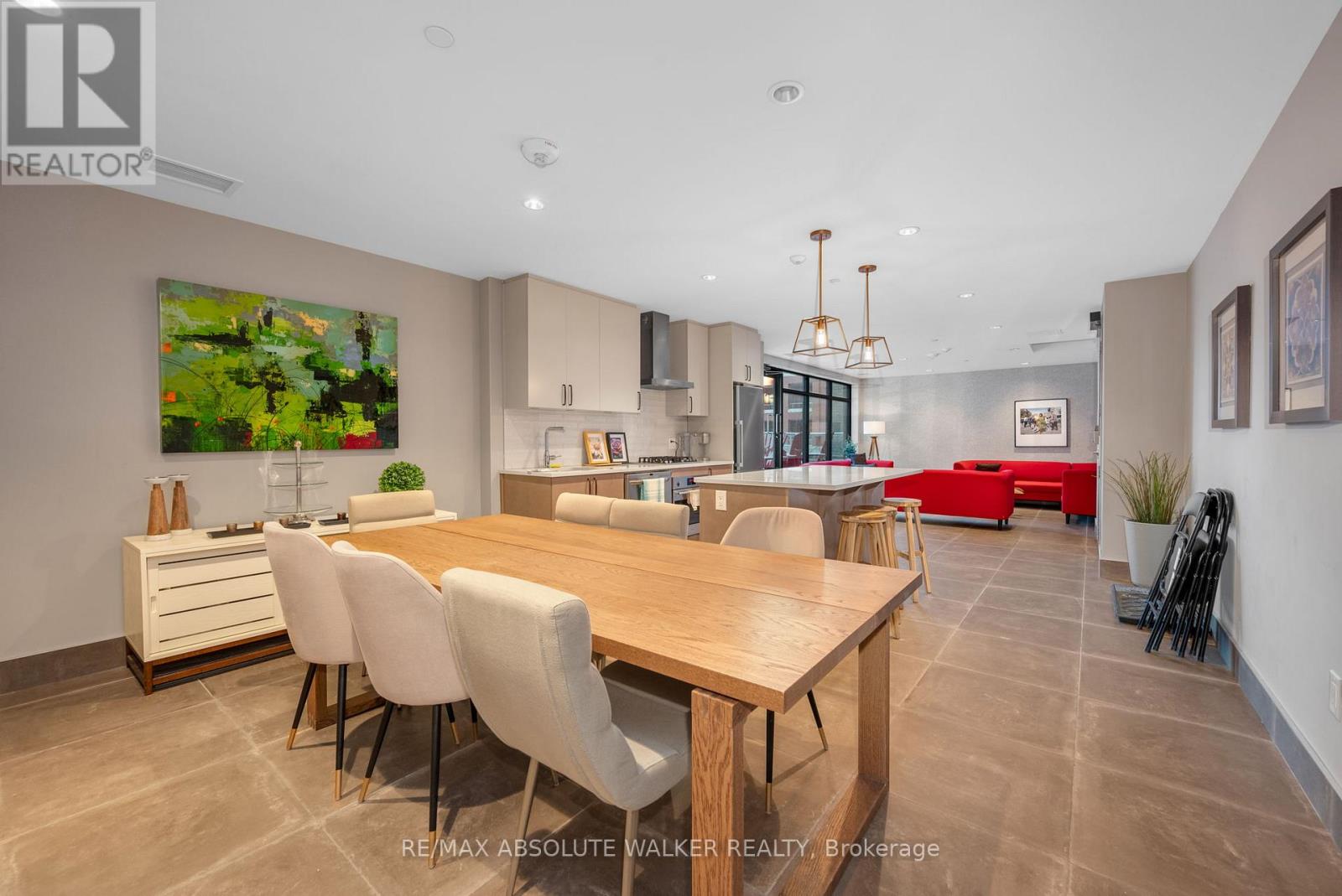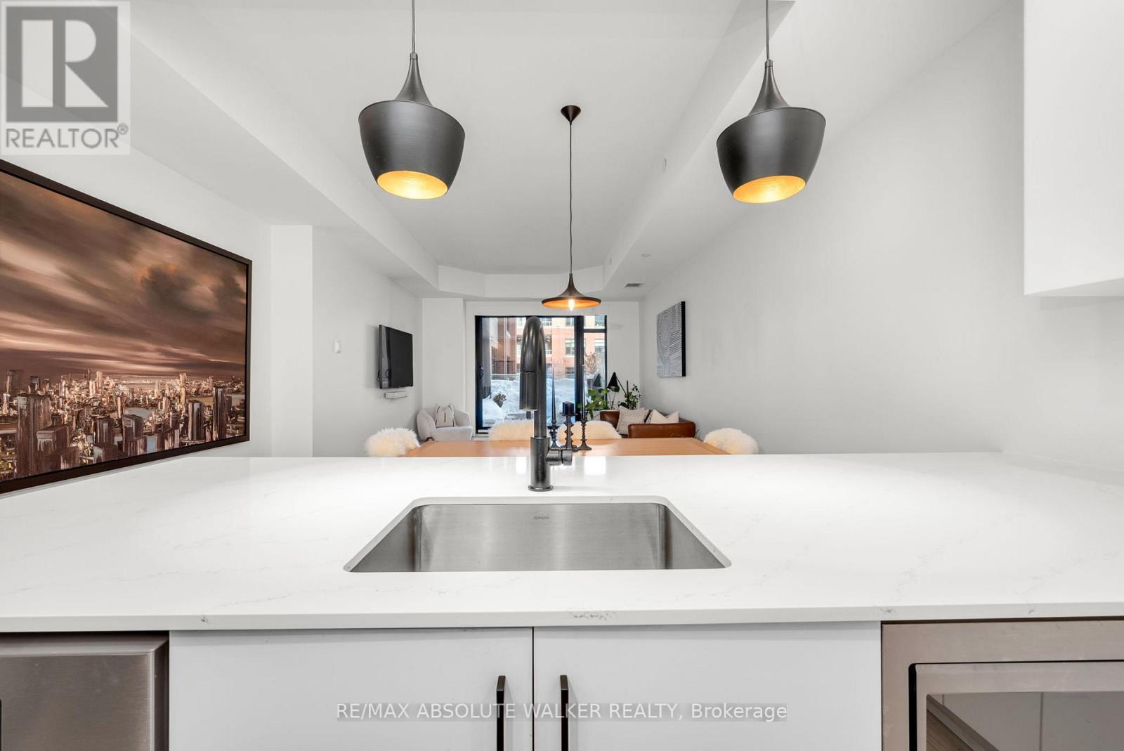 Live where convenience meets contemporary style at The Corners on Main. Built by Domicile, this bright and spacious 850 sq ft Harvey model offers one bedroom, two bathrooms, and thoughtfully curated upgrades throughout. High ceilings and oversized windows flood the space with natural light, while the upgraded kitchen steals the spotlight featuring quartz countertops, a chic herringbone backsplash, premium cabinetry with added storage at the island, and high-end appliances. A custom wine fridge seamlessly integrated into the pantry adds both function and flair. An extraordinary 400 sq ft private terrace is a standout feature, ideal for morning coffee, summer evenings, and entertaining under the stars. Convenience continues with exceptional amenities located on the same floor, including a fully equipped fitness room, stylish party room, guest suite, and a rooftop terrace. Underground parking and a storage locker provide added ease and practicality. All just steps from vibrant cafés, restaurants, green space, and the canal, this is urban living without compromise. Condo fees include building insurance, property management, maintenance, and reserve fund. (id:64974)