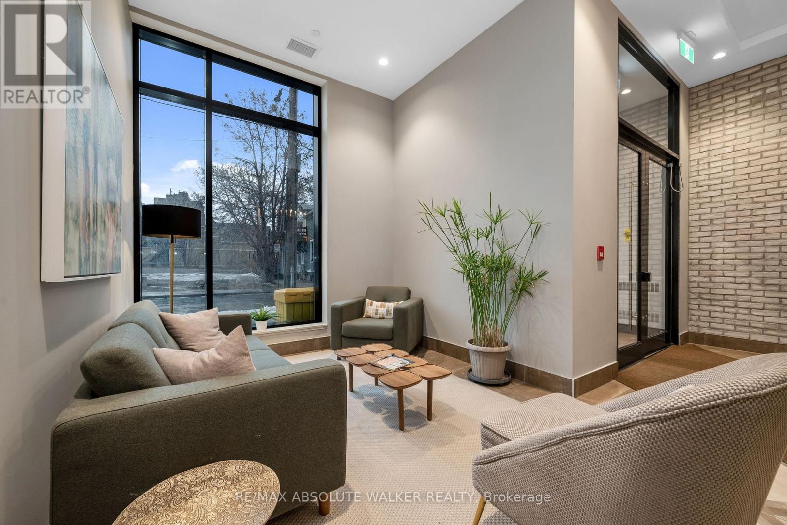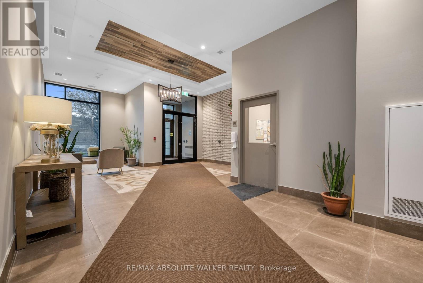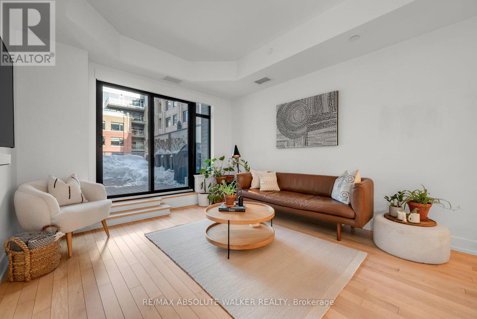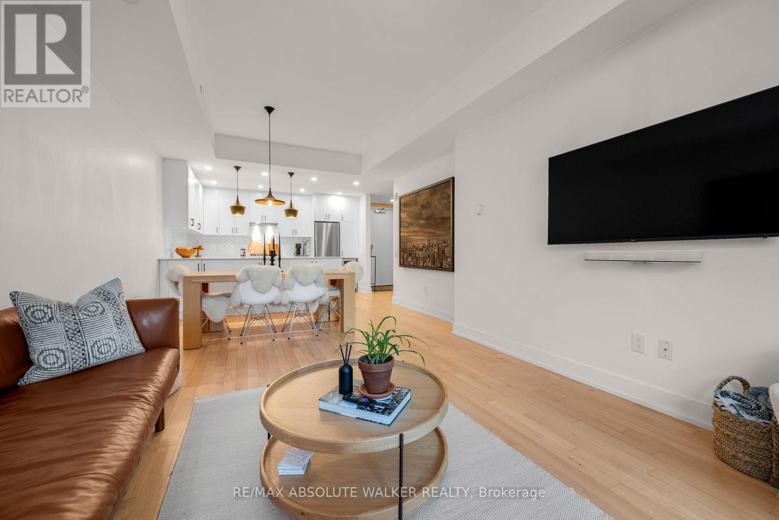 Live where convenience meets contemporary style at The Corners on Main. Built by Domicile, this bright and spacious 850 sq ft Harvey model offers one bedroom, two bathrooms, and thoughtfully curated upgrades throughout. High ceilings and oversized windows flood the space with natural light, while the upgraded kitchen steals the spotlight featuring quartz countertops, a chic herringbone backsplash, premium cabinetry with added storage at the island, and high-end appliances. A custom wine fridge seamlessly integrated into the pantry adds both function and flair. An extraordinary 400 sq ft private terrace is a standout feature, ideal for morning coffee, summer evenings, and entertaining under the stars. Convenience continues with exceptional amenities located on the same floor, including a fully equipped fitness room, stylish party room, guest suite, and a rooftop terrace. Underground parking and a storage locker provide added ease and practicality. All just steps from vibrant cafés, restaurants, green space, and the canal, this is urban living without compromise. Condo fees include building insurance, property management, maintenance, and reserve fund. (id:64974)