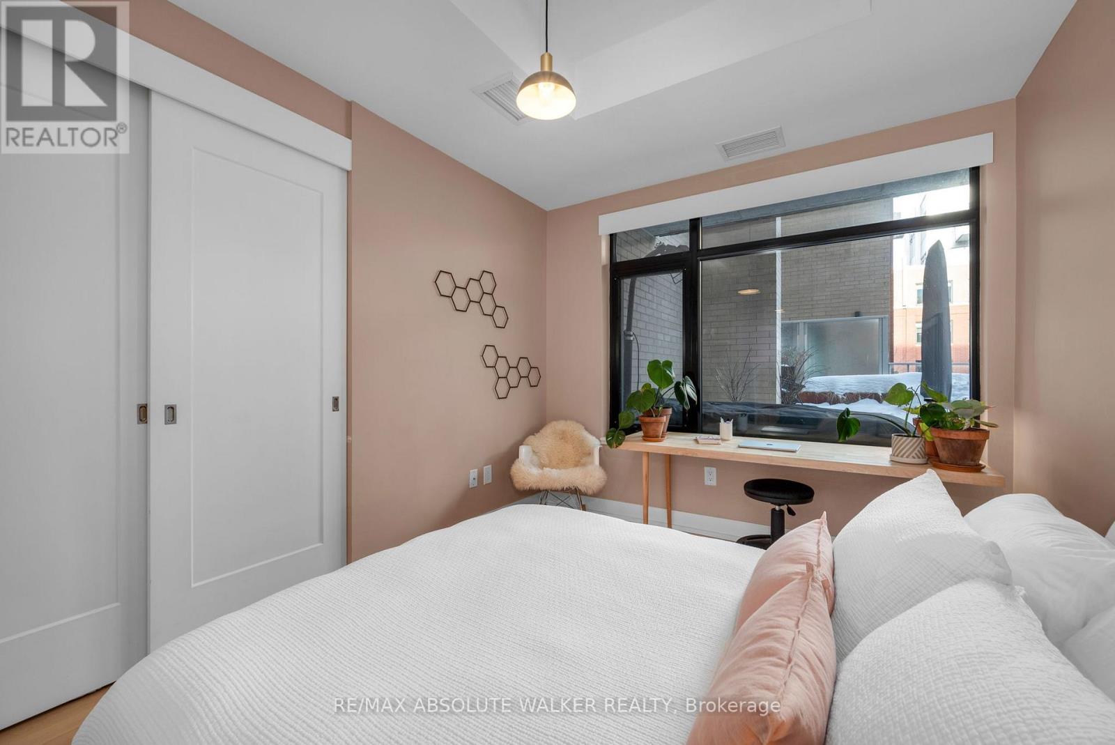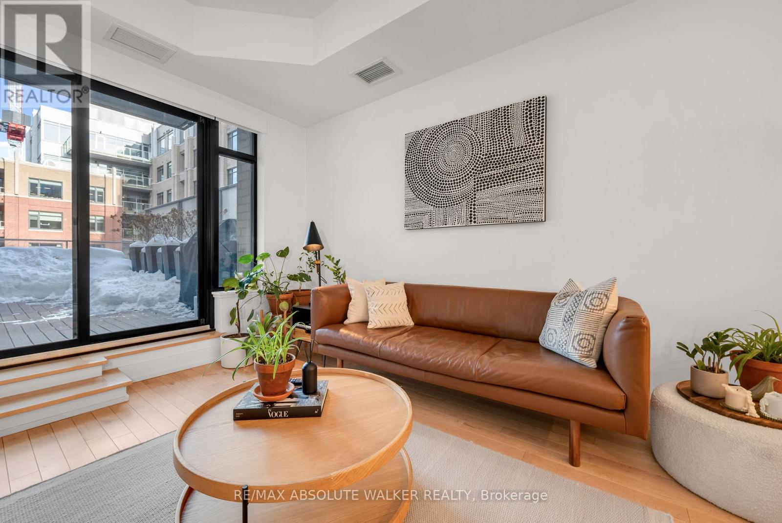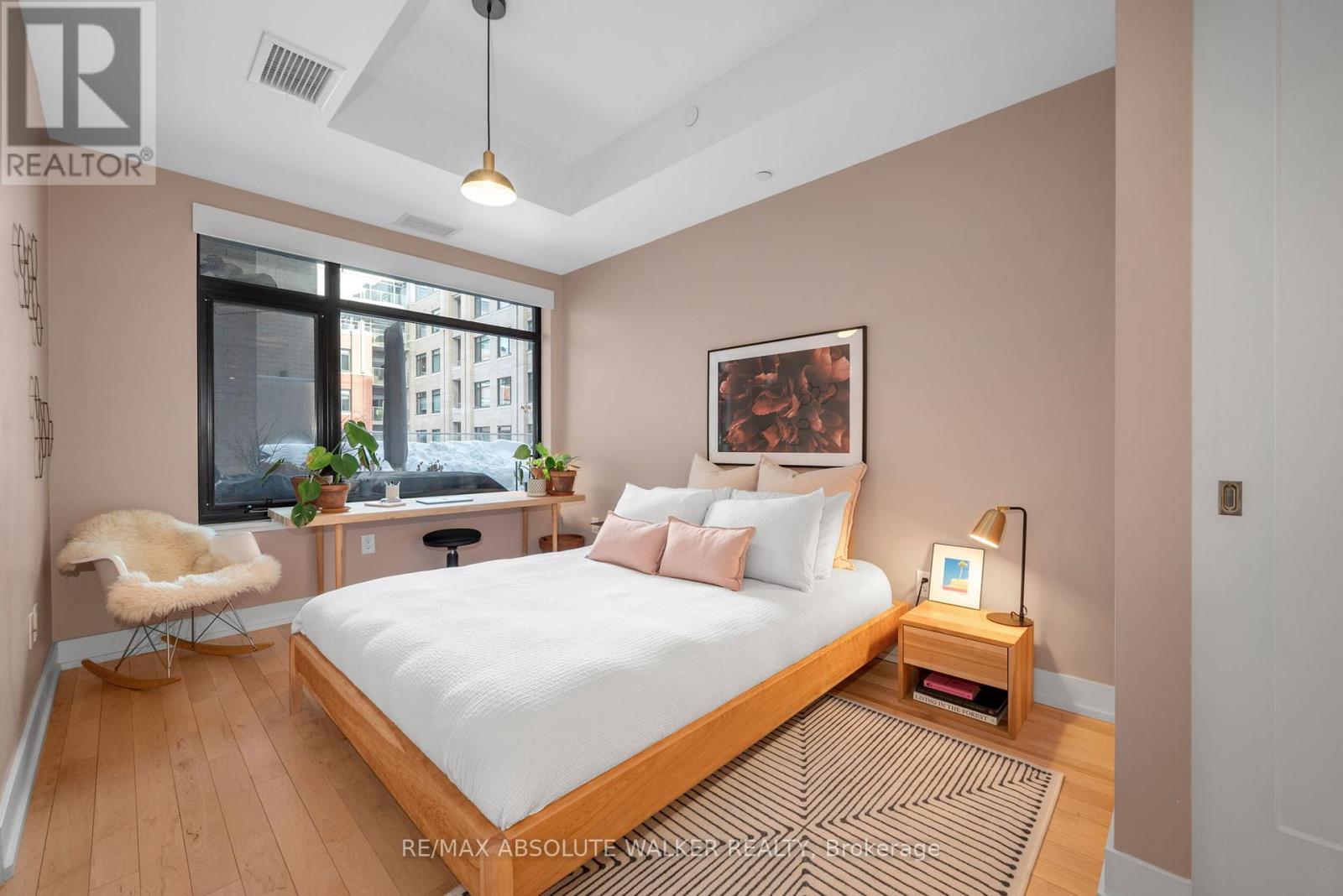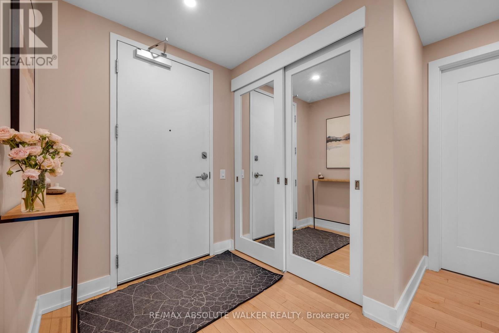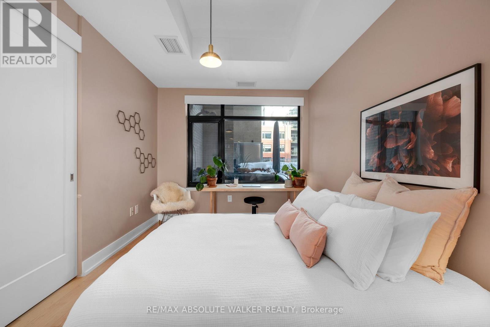 Live where convenience meets contemporary style at The Corners on Main. Built by Domicile, this bright and spacious 850 sq ft Harvey model offers one bedroom, two bathrooms, and thoughtfully curated upgrades throughout. High ceilings and oversized windows flood the space with natural light, while the upgraded kitchen steals the spotlight featuring quartz countertops, a chic herringbone backsplash, premium cabinetry with added storage at the island, and high-end appliances. A custom wine fridge seamlessly integrated into the pantry adds both function and flair. An extraordinary 400 sq ft private terrace is a standout feature, ideal for morning coffee, summer evenings, and entertaining under the stars. Convenience continues with exceptional amenities located on the same floor, including a fully equipped fitness room, stylish party room, guest suite, and a rooftop terrace. Underground parking and a storage locker provide added ease and practicality. All just steps from vibrant cafés, restaurants, green space, and the canal, this is urban living without compromise. Condo fees include building insurance, property management, maintenance, and reserve fund. (id:64974)