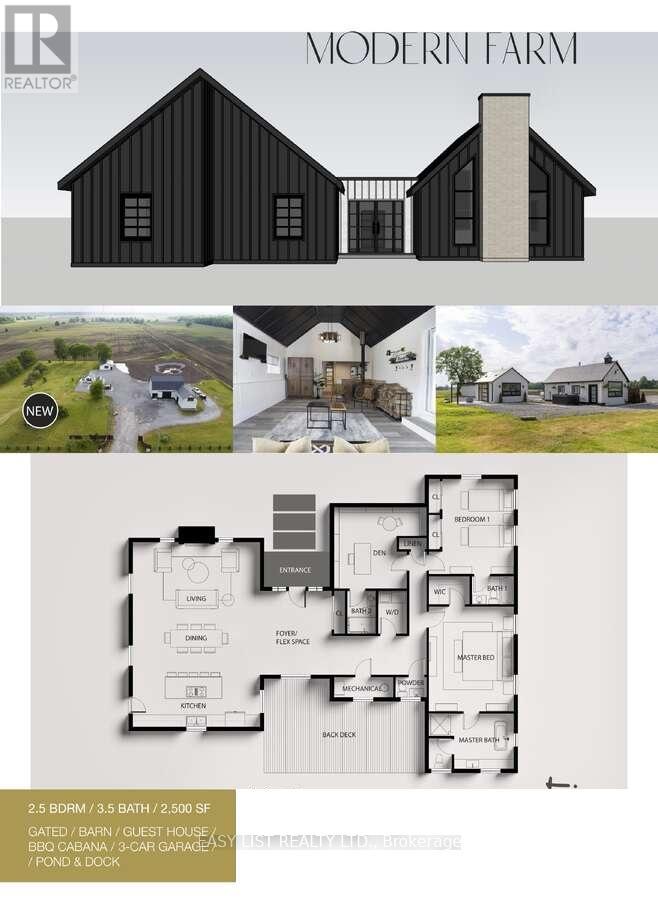 *** Visit the REALTOR website for further information about this Listing *** Welcome to a rare modern farmhouse estate on 4.5 fully approved acres, where refined design meets estate-scale versatility. Completely rebuilt and move-in ready, this private retreat offers a brand-new custom home, new 3-car garage, resort-style cabana, renovated legal guest house with loft, and an impressive approx. 6,500 sq ft two-storey post-and-beam barn that is insulated and heated, with concrete floors - each structure fully permitted and professionally finished. The main residence showcases bold black board-and-batten siding, modern rooflines, and oversized architectural windows. Inside, a vaulted great room anchors the home, seamlessly blending kitchen, dining, and living spaces for effortless entertaining. A flexible foyer/flex room, dedicated office/den, full laundry, and powder room enhance everyday function. The private bedroom wing features a serene primary suite with walk-in closet and spa-inspired 5-piece ensuite, plus a second bedroom with its own full ensuite. A sunlit rear deck overlooks peaceful greenery and leads to a picturesque bean-shaped pond with dock - an ideal setting for outdoor dining, fireside evenings, or quiet reflection. Designed for a true live-work lifestyle, the guest house and barn provide exceptional flexibility for studios, offices, creative work, consulting, storage, or income-generating uses (buyer to verify permitted uses). With acres to spread out, the property offers rare separation between living, working, and entertaining spaces. Additional highlights include a premium asphalt driveway, fully fenced grounds with custom gated entry, security monitoring, and upgraded utilities including a new 200 AMP service pole. Ideally located minutes to Port Colborne and Wainfleet, with easy access to beaches, golf, marinas, and under two hours from the GTA, this estate delivers privacy, luxury, and opportunity - without compromise. (id:64974)