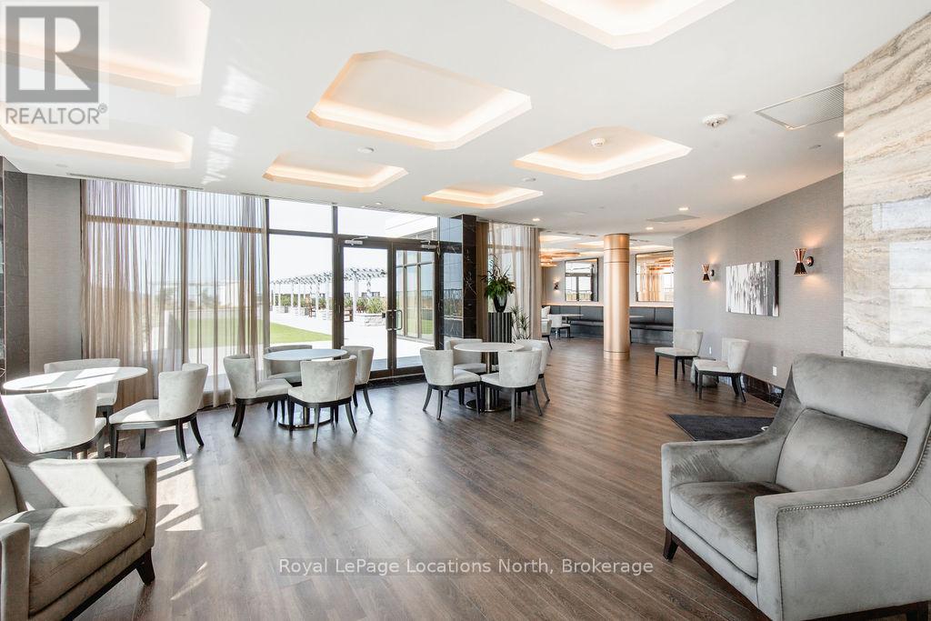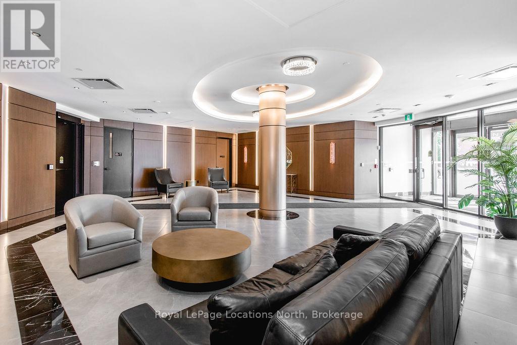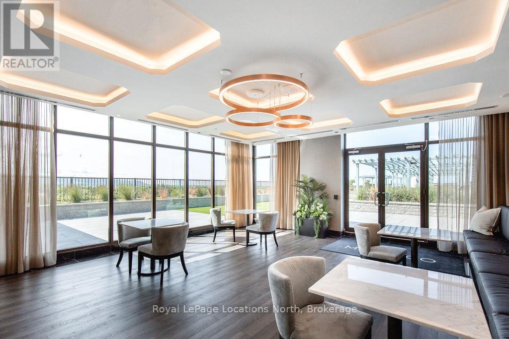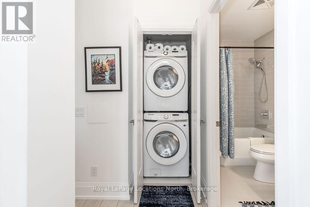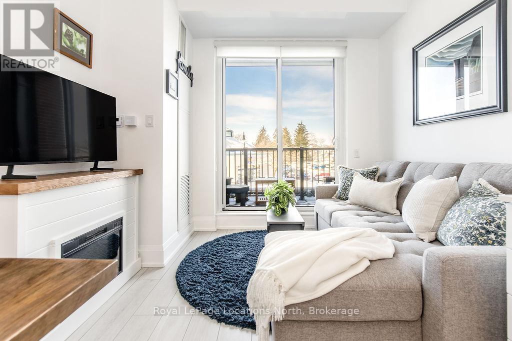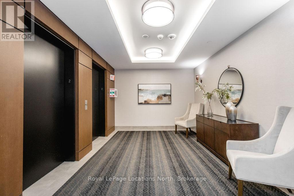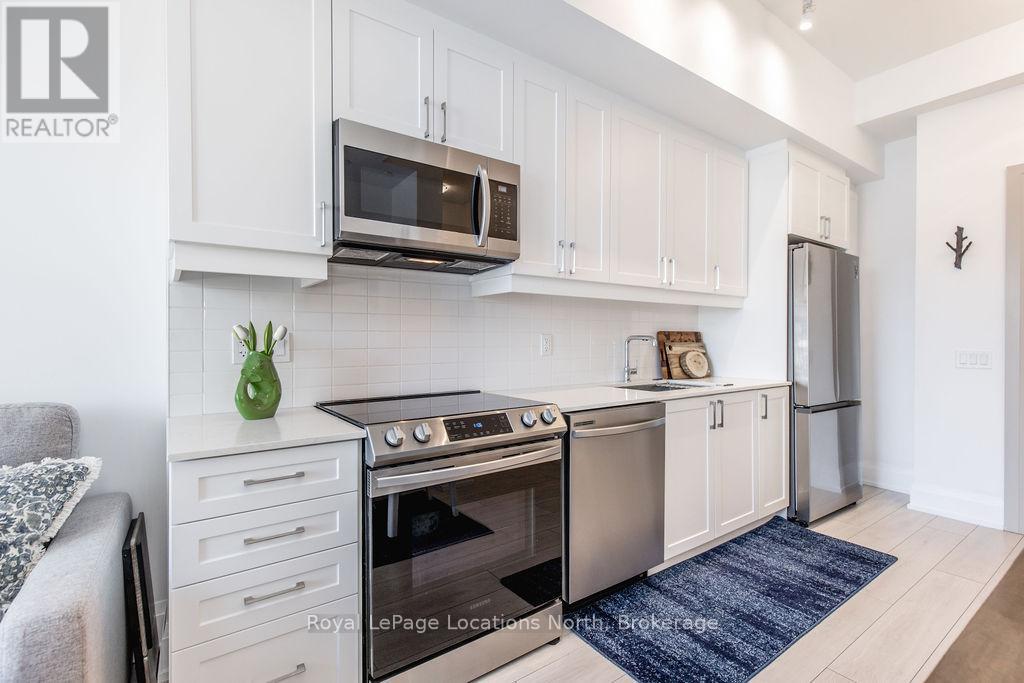 Welcome to Monaco, Collingwood's most prestigious address where modern luxury, security and effortless living come together. Designed with comfort and peace of mind, this residence is ideal for a single professional or downsizer seeking a safe, low-maintenance lifestyle in the heart of it all. This elegant condo features a bright open-concept layout with soaring 10' ceilings and west-facing natural light. The contemporary kitchen is both stylish and functional, offering quartz countertops, ceramic tile backsplash, stainless steel appliances and seamless flow into the living area. Step outside to a fabulous sunny balcony, perfectly positioned for morning coffee and great people-watching. The thoughtfully designed interior includes a spacious bedroom with a generous walk-in closet, a beautifully appointed full bathroom and in-suite laundry for everyday convenience. Monaco delivers exceptional security and lifestyle amenities, including secure FOB entry, underground parking with one dedicated space and Wi-Fi-enabled common areas, creating a safe and connected living environment. Residents enjoy access to a stunning rooftop terrace with alfresco dining and BBQs, an indoor social lounge with bar and a fully equipped fitness centre with panoramic views of Blue Mountain. With direct access to Collingwood's main street, you're just minutes from the waterfront, boutique shops and acclaimed dining. The on-site upscale market/café offers the perfect spot to meet friends, enjoy a coffee or pick up local artisan goods. Monaco offers a refined, secure and carefree lifestyle, ideal for those seeking modern luxury and exceptional living in downtown Collingwood. (id:64974)