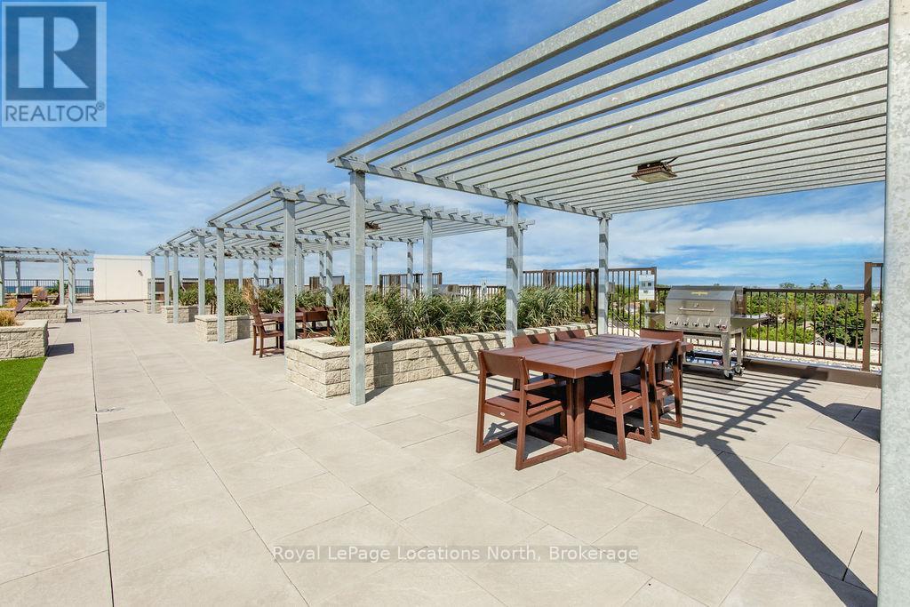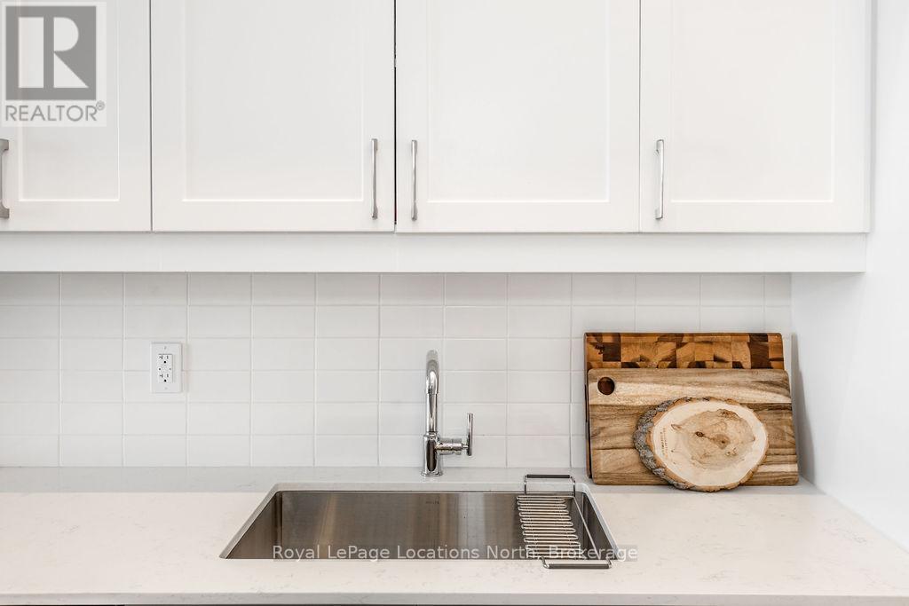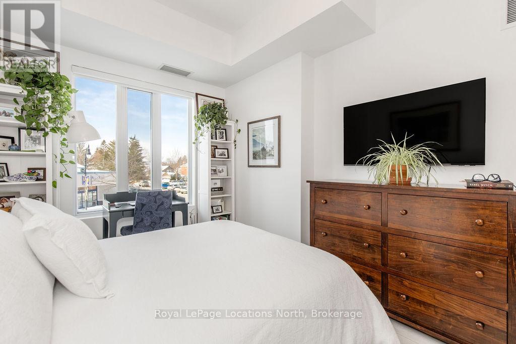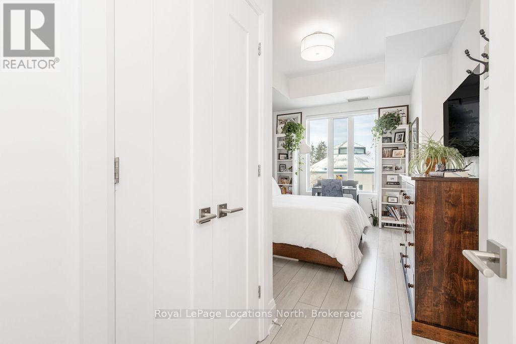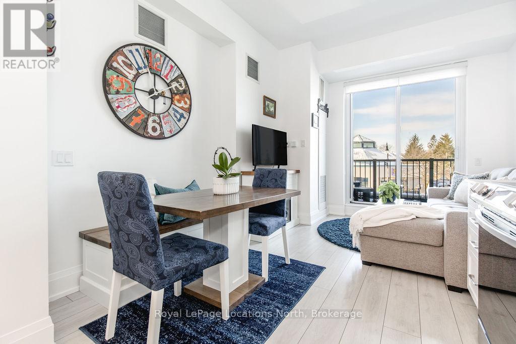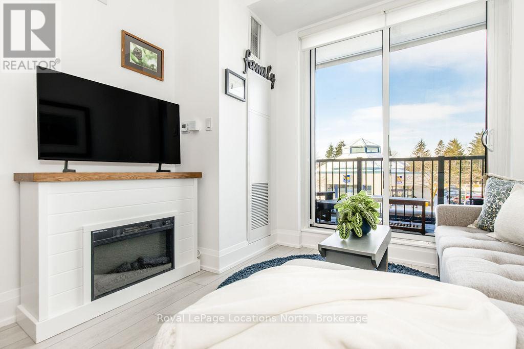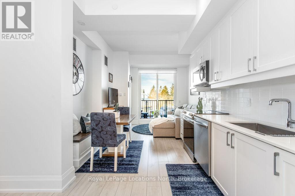 Welcome to Monaco, Collingwood's most prestigious address where modern luxury, security and effortless living come together. Designed with comfort and peace of mind, this residence is ideal for a single professional or downsizer seeking a safe, low-maintenance lifestyle in the heart of it all. This elegant condo features a bright open-concept layout with soaring 10' ceilings and west-facing natural light. The contemporary kitchen is both stylish and functional, offering quartz countertops, ceramic tile backsplash, stainless steel appliances and seamless flow into the living area. Step outside to a fabulous sunny balcony, perfectly positioned for morning coffee and great people-watching. The thoughtfully designed interior includes a spacious bedroom with a generous walk-in closet, a beautifully appointed full bathroom and in-suite laundry for everyday convenience. Monaco delivers exceptional security and lifestyle amenities, including secure FOB entry, underground parking with one dedicated space and Wi-Fi-enabled common areas, creating a safe and connected living environment. Residents enjoy access to a stunning rooftop terrace with alfresco dining and BBQs, an indoor social lounge with bar and a fully equipped fitness centre with panoramic views of Blue Mountain. With direct access to Collingwood's main street, you're just minutes from the waterfront, boutique shops and acclaimed dining. The on-site upscale market/café offers the perfect spot to meet friends, enjoy a coffee or pick up local artisan goods. Monaco offers a refined, secure and carefree lifestyle, ideal for those seeking modern luxury and exceptional living in downtown Collingwood. (id:64974)