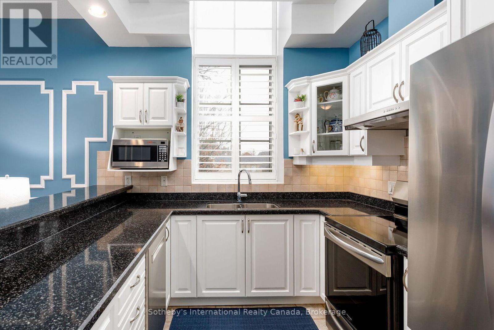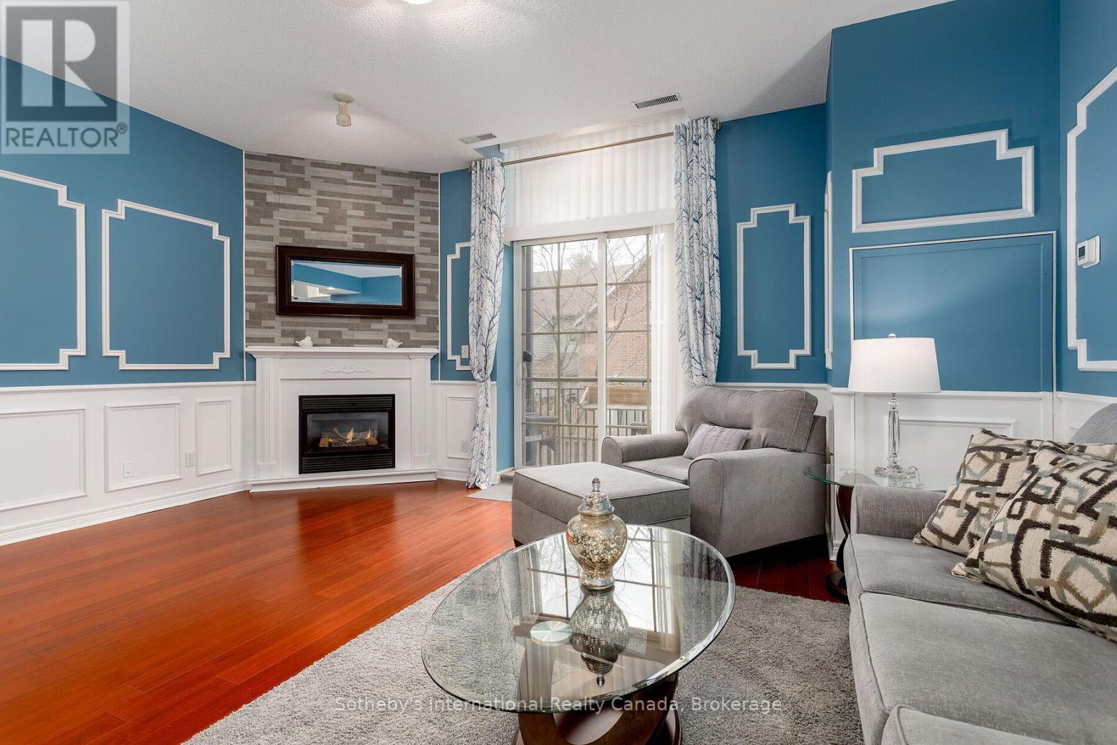 Welcome to this beautifully appointed end-unit condo in the heart of Waterdown, offering 1320 square feet of exceptional space, light, and flow. Soaring 10-foot ceilings, oversized windows, and abundant natural light create a bright, open feel throughout. The thoughtfully designed layout features two bedrooms and two bathrooms, a granite kitchen, and a natural gas fireplace anchoring the living space. Wainscoting throughout the main living areas, generous room proportions, and seamless flow make this home ideal for both everyday living and entertaining. This unit includes two parking spaces; one underground and one convenient main-level spot. Additional highlights include in-suite laundry and a prime location just steps to shops, restaurants, trails, and all amenities Waterdown has to offer. A truly rare opportunity to own a spacious, light-filled condo in this sought-after community. (42060632) (id:64974)