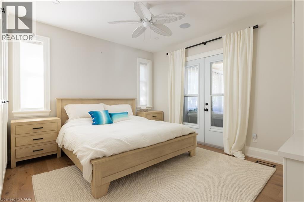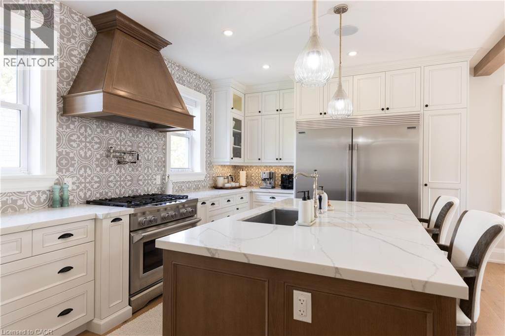 CUSTOM RENOVATION BUNGALOW. This exceptional residence is the perfect blend of modern luxury, thoughtful design, and everyday comfort. The open-concept main floor is bathed in natural light, showcasing high ceilings, wide-plank hardwood floors, and refined designer finishes throughout. The Great Room focal point is the gas fireplace and detailed surround open to the dining room area for easy entertaining. The chef’s kitchen is a true showpiece, featuring quartz countertops, a 6-burner gas range, premium stainless-steel appliances, and a cleverly concealed walk-in pantry — a seamless balance of beauty and function. The primary suite is a private retreat with a custom PAX closet system and a spainspired 3-piece semi-ensuite complete with a glass shower and heated floors. A second bedroom can also be used as a main floor office. From either the primary bedroom or the mudroom, step outside to a 400 sq. ft. covered porch where a fireplace and built-in TV space create a 3 season indoor-outdoor haven. The lower level offers an expansive extension of living space with a welcoming family/games room, a 4-piece bathroom, gym area, laundry room, and two additional bedrooms — perfect for guests, hobbies, or a growing family. Outdoors, the fully fenced and landscaped backyard sets the stage for effortless entertaining and relaxation. Additional highlights include 9 ft. ceilings, hardwood flooring throughout, a heated detached double-car garage with easy access to attic storage, and a whole-home integrated security system with cameras and sound system. Every detail has been carefully curated in this exquisitely designed home, offering a move-in-ready lifestyle with upgrades too numerous to list. This is a property you’ll want to experience firsthand. Located a short stroll to shops and restaurants of downtown Burlington and close proximity to highway access. (id:64974)