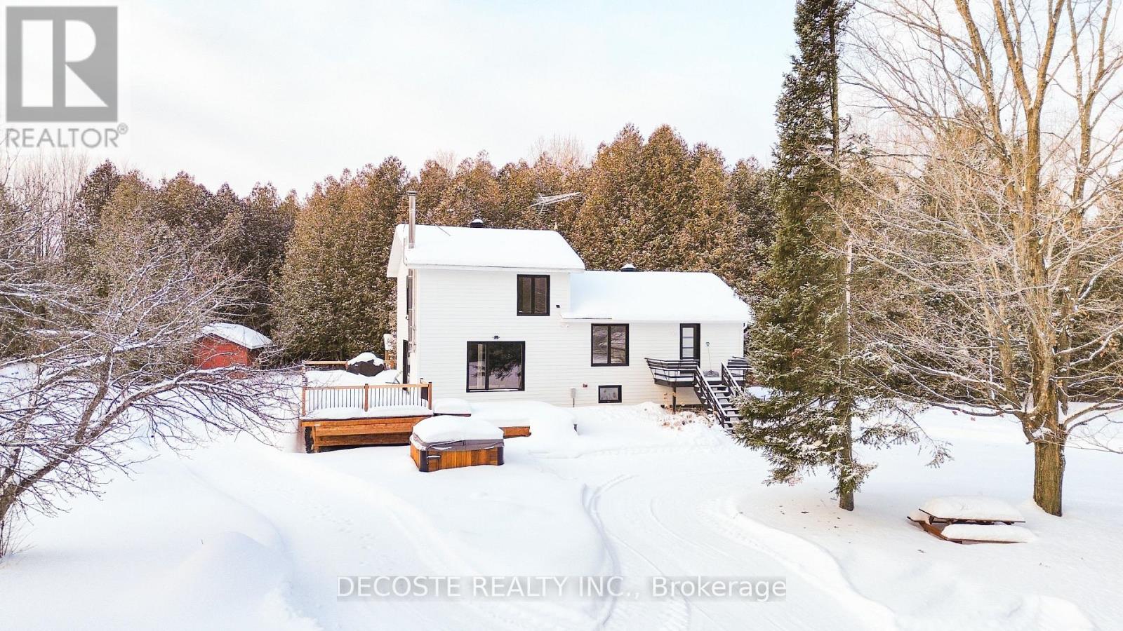 If serenity and privacy are what you've been searching for, look no further! This charming split-level home with a detached garage and garden sheds sits on approximately 24.5 acres of beautiful countryside. A private driveway leads you to this secluded gem, surrounded by mature apple trees, gardens, and a peaceful mixed bush setting. The home offers 3 bedrooms on two levels and 1 fully renovated bathroom. The compact yet highly functional kitchen is conveniently located next to the dining area. Just off the kitchen, you'll find the spacious primary bedroom and a modern 4-piece bathroom. Adjacent to the dining room is the bright lower-level living room, featuring a cozy wood-burning stove and large windows that fill the space with natural light. The upper level includes two additional generously sized bedrooms. Recent renovations and upgrades include new windows and doors, new siding with added insulation, a new heat pump, new flooring throughout, a beautifully updated kitchen with new cabinets and appliances, and a completely renovated bathroom. Step outside to enjoy the impressive two-level wraparound deck with patio door access from the living room-perfect for relaxing or entertaining while taking in the surrounding nature. This property offers abundant space, privacy, and wildlife for the whole family to enjoy - a true country paradise! (id:64974)
