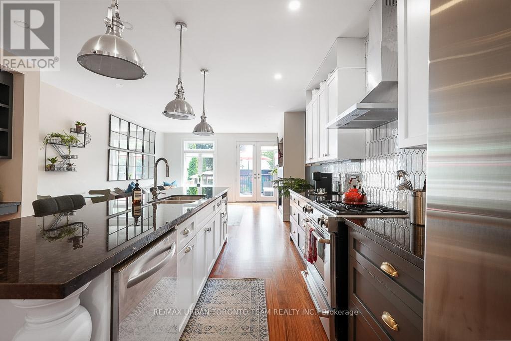 Stunning Modern Victorian just steps from the energy of Trinity Bellwoods Park, tucked away on a quiet, tree-lined street in one of Toronto's most sought-after neighbourhoods.This beautifully designed home offers approximately 3,000 sq ft of thoughtfully curated living space, featuring soaring ceilings and an abundance of natural light throughout. Enjoy 9-ft ceilings on the main and third floors, 8-ft on the second, and a finished lower level with 7.5-ft ceilings-creating an airy, spacious feel on every level.The open-concept main floor is ideal for both everyday living and entertaining, anchored by a stunning 12-ft chef's island in the kitchen. A cozy family room with a gas fireplace sits just off the kitchen, while the dining area comfortably accommodates large gatherings.Step outside to your private backyard oasis, complete with a deck, patio, and green space-perfect for relaxing or hosting.Upstairs, the primary retreat features two closets and a spa-like ensuite. The third-floor loft offers incredible flexibility-ideal as a home office, gym, or creative studio. The fully finished walkout basement provides excellent additional living space, perfectly suited for a nanny or in-law suite.Additional features include separate garage parking. Offered fully furnished, this turnkey home is perfect for those seeking comfort, style, and convenience in a prime Toronto location.A rare opportunity to live just moments from Trinity Bellwoods, surrounded by top restaurants, cafés, and vibrant city life-while still enjoying the peace of a quiet residential street. (id:64974)