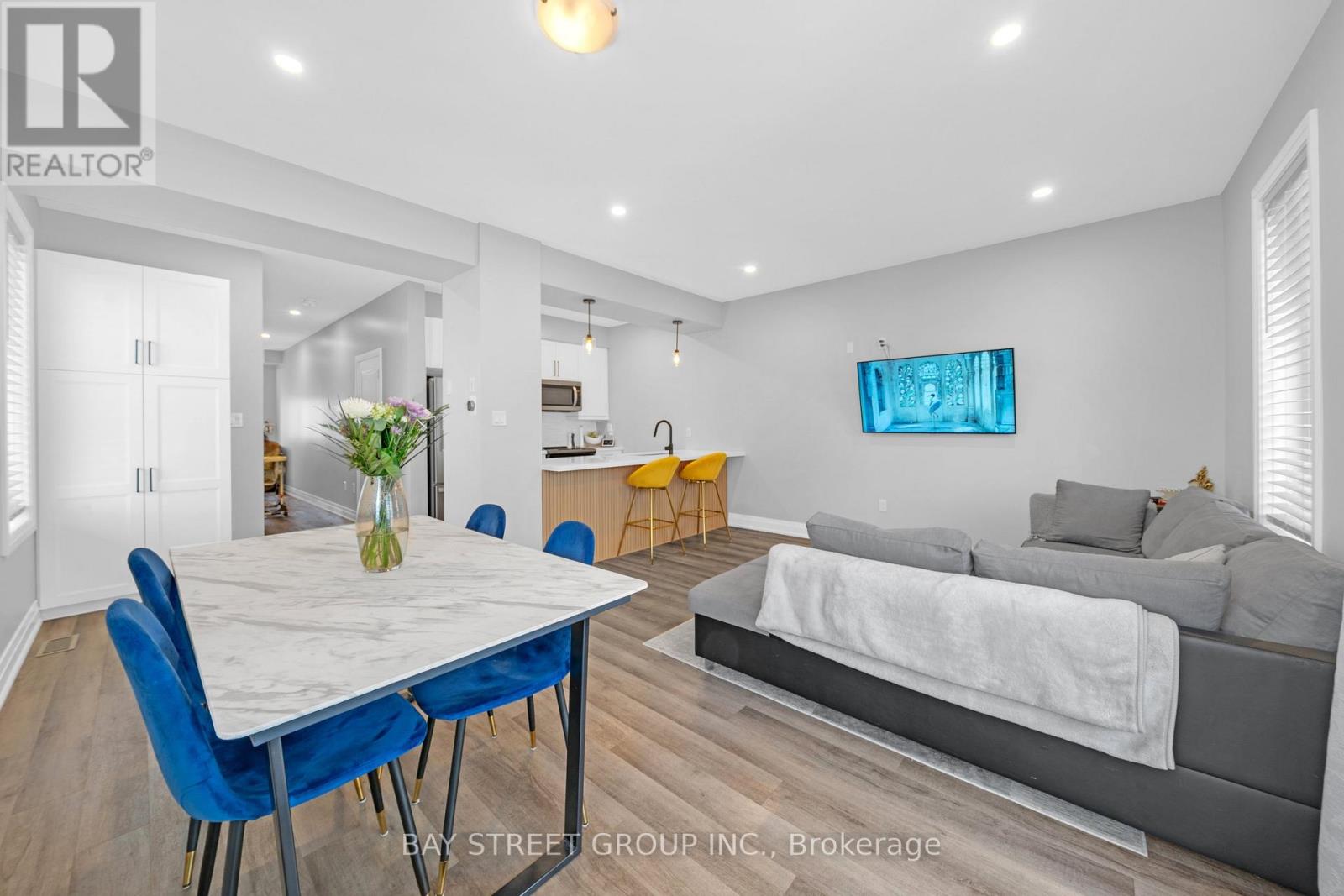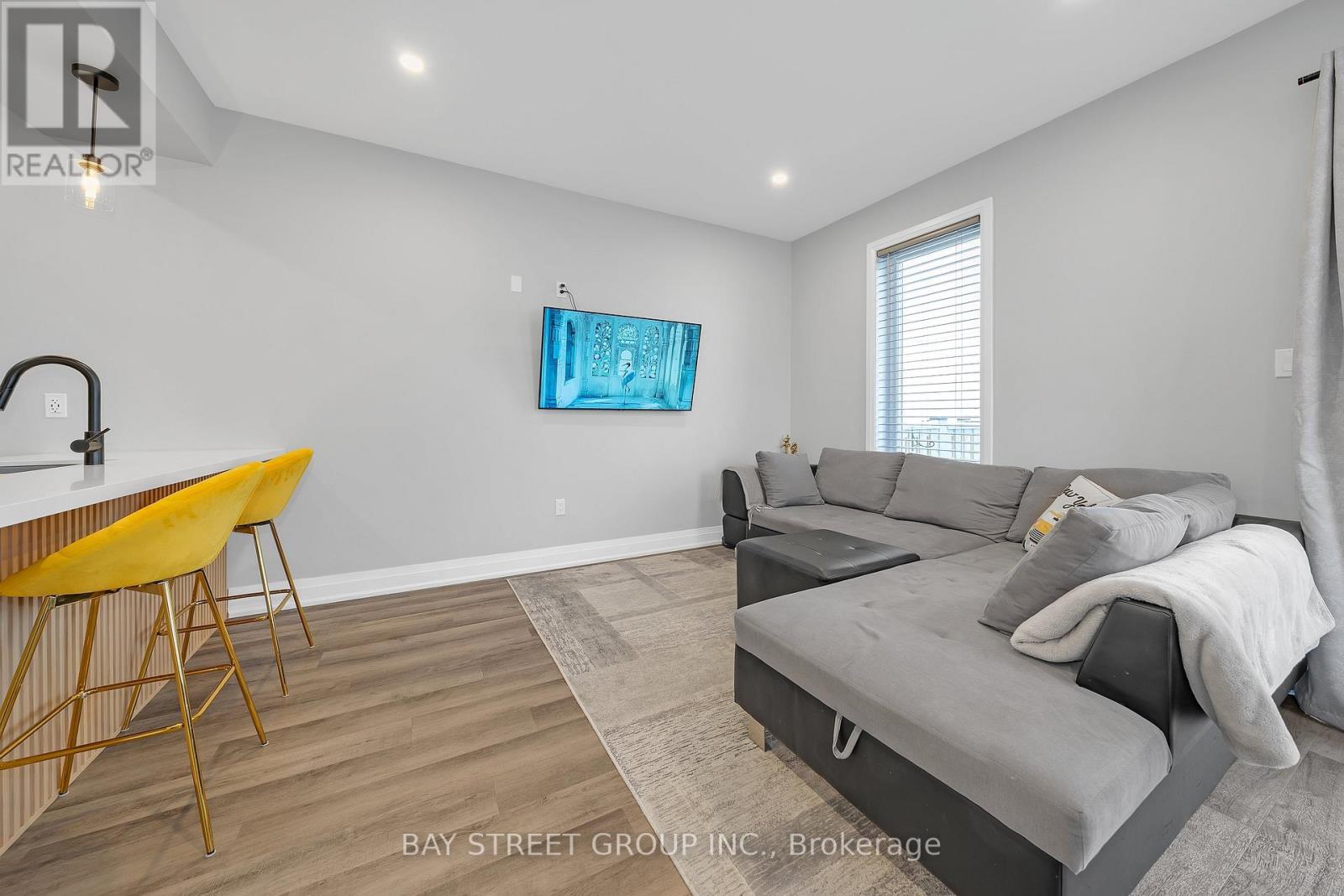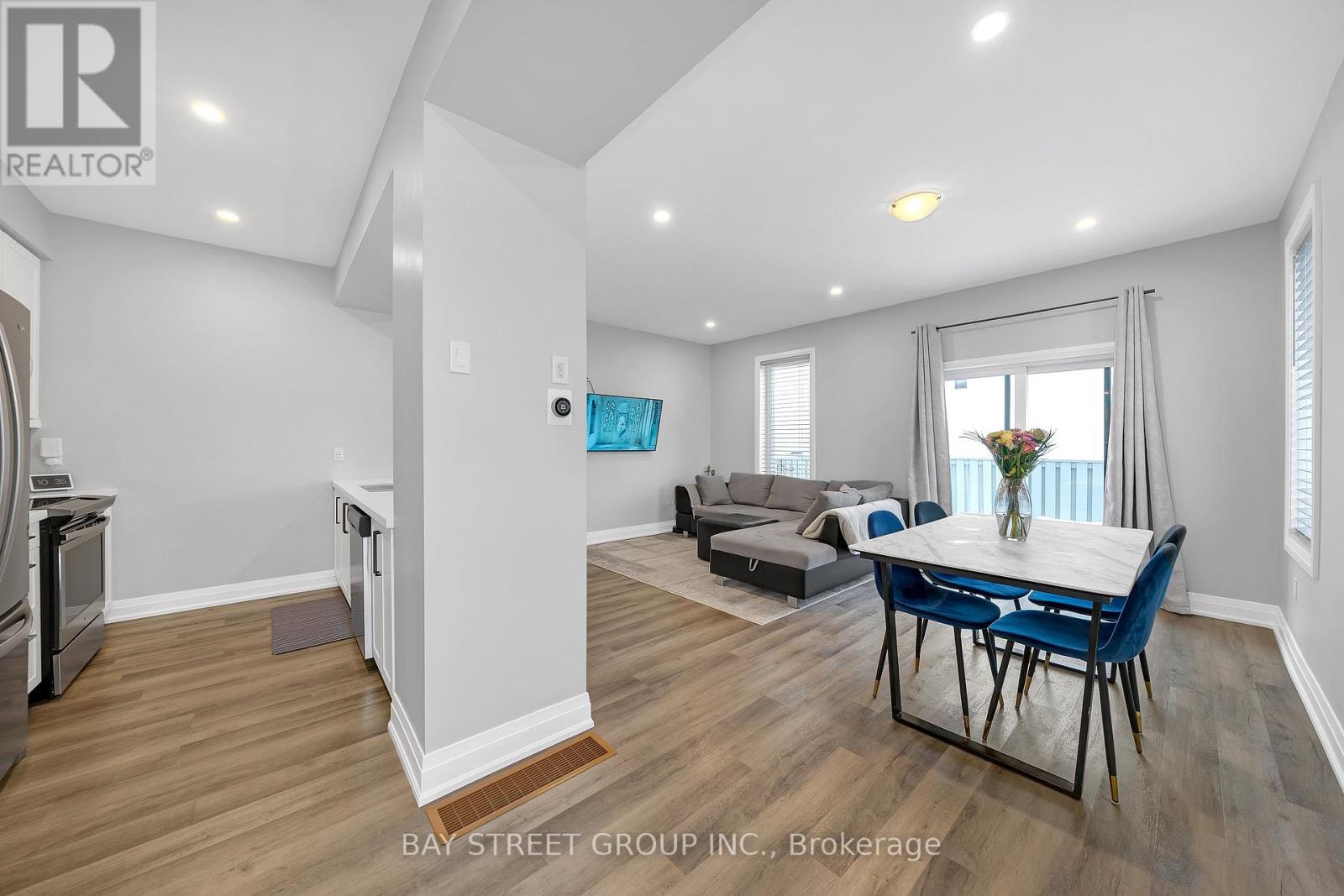5-year-old executive end-unit townhome with 3 bdrm and 4 baths. Finished basement. Central Barrie location, close to top-rated schools, Georgian Mall, recreation centre, shopping, restaurants, and transit. Quality-built home with open-concept layout and 9-ft ceilings on the main floor. Kitchen features upgraded cabinetry, quartz countertops, backsplash, stainless steel appliances, and large centre island. Walkout to private interlocked backyard. Triple-pane windows, hardwood staircase, and upgraded light fixtures. Second floor offers three bedrooms, two bathrooms, and upper-floor laundry. Primary bedroom with walk-in closet, ensuite, and custom built-in wall unit with desk and storage drawers.Finished basement with a large recreation room and a 3-piece bathroom. Well-maintained home in a family-friendly neighbourhood. Pride of ownership. Shows like new. Move-in ready home in a convenient Barrie location close to schools, parks, shopping, and everyday amenities. Freehold townhome with POTL fee covering snow removal and common elements maintenance. (id:64974)