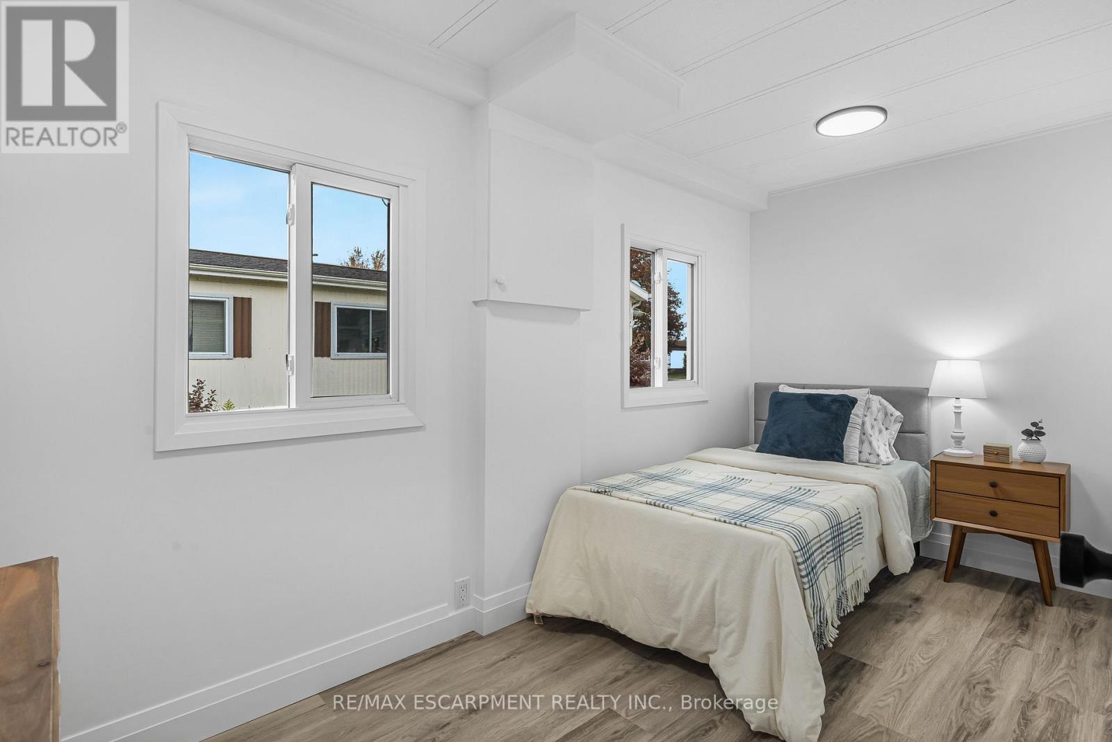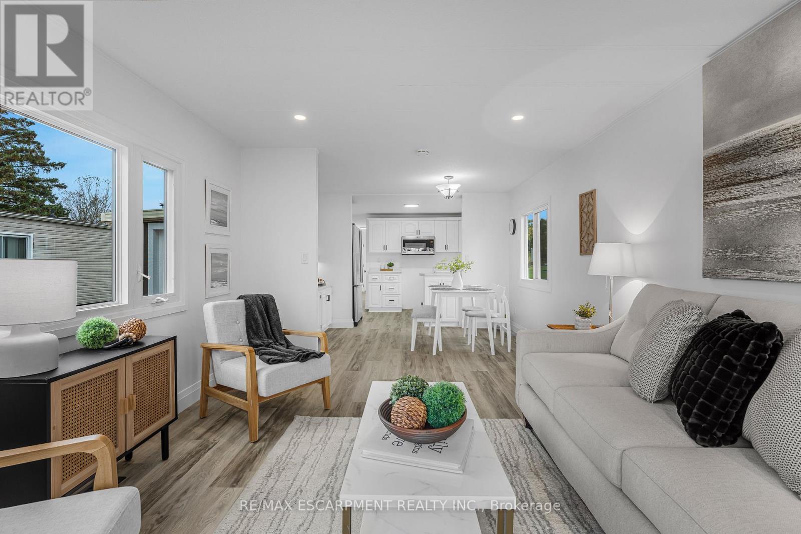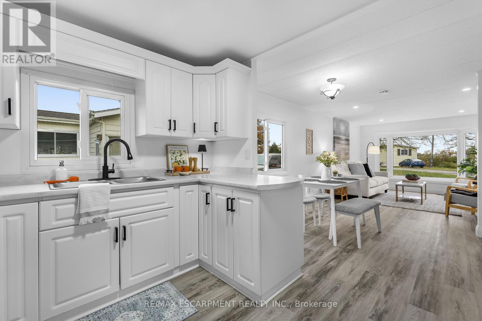 Welcome to Ellsworth Acres Mobile Home Community in Wainfleet! This beautifully updated mobile home has been extensively renovated and is move-in ready. The spacious, modern kitchen boasts stainless steel appliances, stylish flooring, new drywall with vapor barrier, and sleek pot lighting. The open-concept kitchen, living, and dining area is bright and inviting, featuring large vinyl/thermal windows and a charming coffee bar. The home includes two bedrooms plus a generous office-perfect for hosting guests or working from home. The fully updated bathroom features a brand-new walk-in shower, ideal for those with mobility needs. Additional improvements include new PEX water lines, doors, trim, and a brand-new deck for outdoor enjoyment. With parking for two vehicles and a 10' x 10' storage shed, this move-in-ready home checks all the boxes. Monthly fees cover land lease, property taxes, garbage and snow removal, water, and septic services. Ideally situated just a short drive from Dunnville, Welland, and Smithville, this home offers the perfect blend of modern comfort and small-town charm. Note: some photos have been virtually staged. (id:64974)