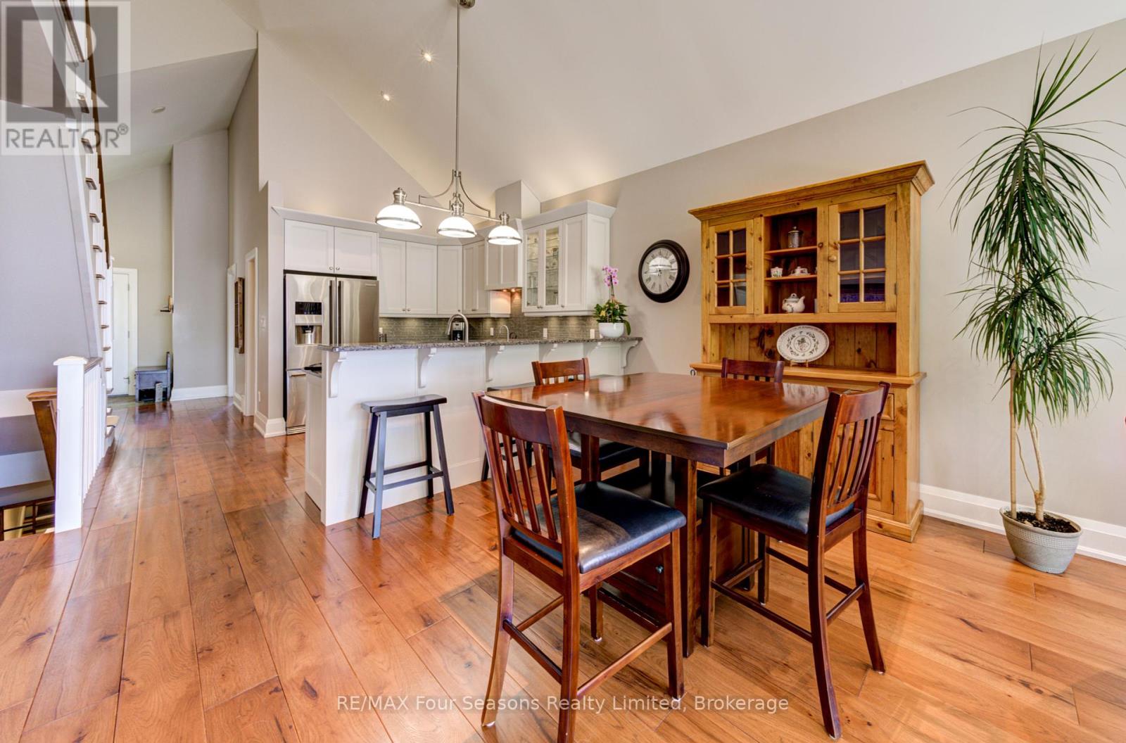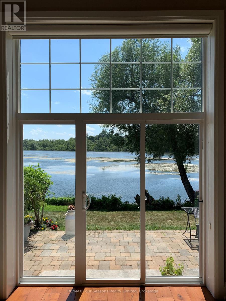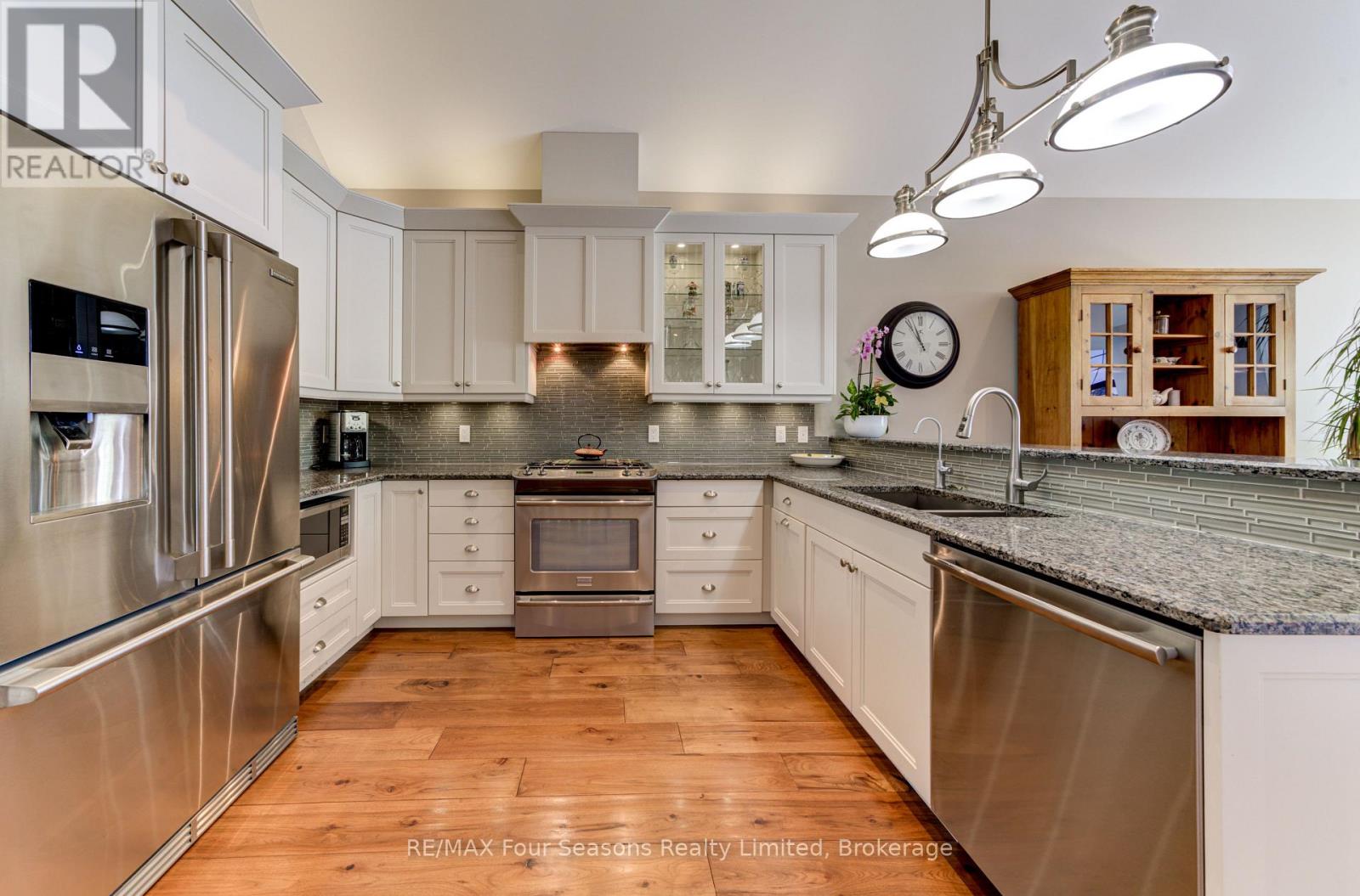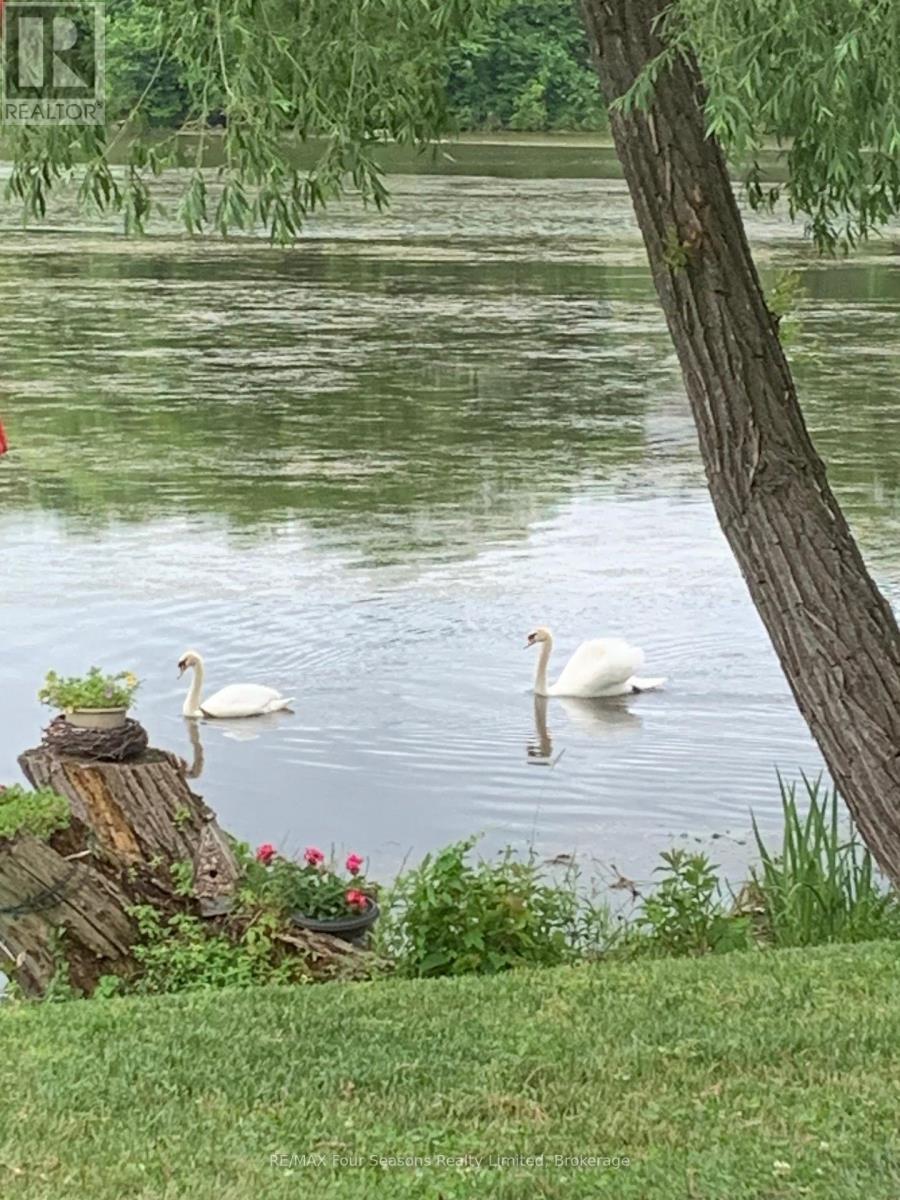THE MILL POND in the heart of Thornbury presents a great waterfront opportunity. This 4 bedroom bungaloft home is the best location in this small enclave of homes where nature meets peaceful contemporary living. This million dollar unobstructed WATERFRONT VIEW offers peace and tranquility while watching the activities of swans, ducks, egrets, beaver, otters and more. Yet only a few minutes walk to the main street of Thornbury with it's boutique shops, art galleries and restaurants. Stroll down to the marina and Bayview Park or the fish ladder on the damn. For skiers it's only a 5 minute drive to Georgian Peaks and 15 minutes to Blue Mountain and other private ski clubs. This end unit bungaloft boasts the best location on the MILLPOND and the largest floorplan with a double car garage. MAIN FLOOR PRIMARY bedroom with ensuite and heated floors has large windows to take in the view of the water. A further bedroom on the main level can be an office or den. Open plan main floor living with beautiful hemlock flooring, a custom kitchen with granite counters, stainless steel appliances and island bar. Dining area and living room share soaring cathedral ceilings and a gas fireplace for those cold winter evenings. French doors open to the patio area with beautifully landscaped gardens. The lofted second level offers two further bedrooms, a large four piece bathroom and a sitting area overlooking the main level. Thoughtfully planned and constructed with extra insulation in the living room and master bedroom walls, energy efficient windows, HRV system, on demand hot water heater, The attached double car garage is insulated and has inside entry door. A shared dock offers you a place to watch beautiful s a place sunrises as well as access for your kayaks/canoes. On site rack for your canoes/kayaks. (id:64974)