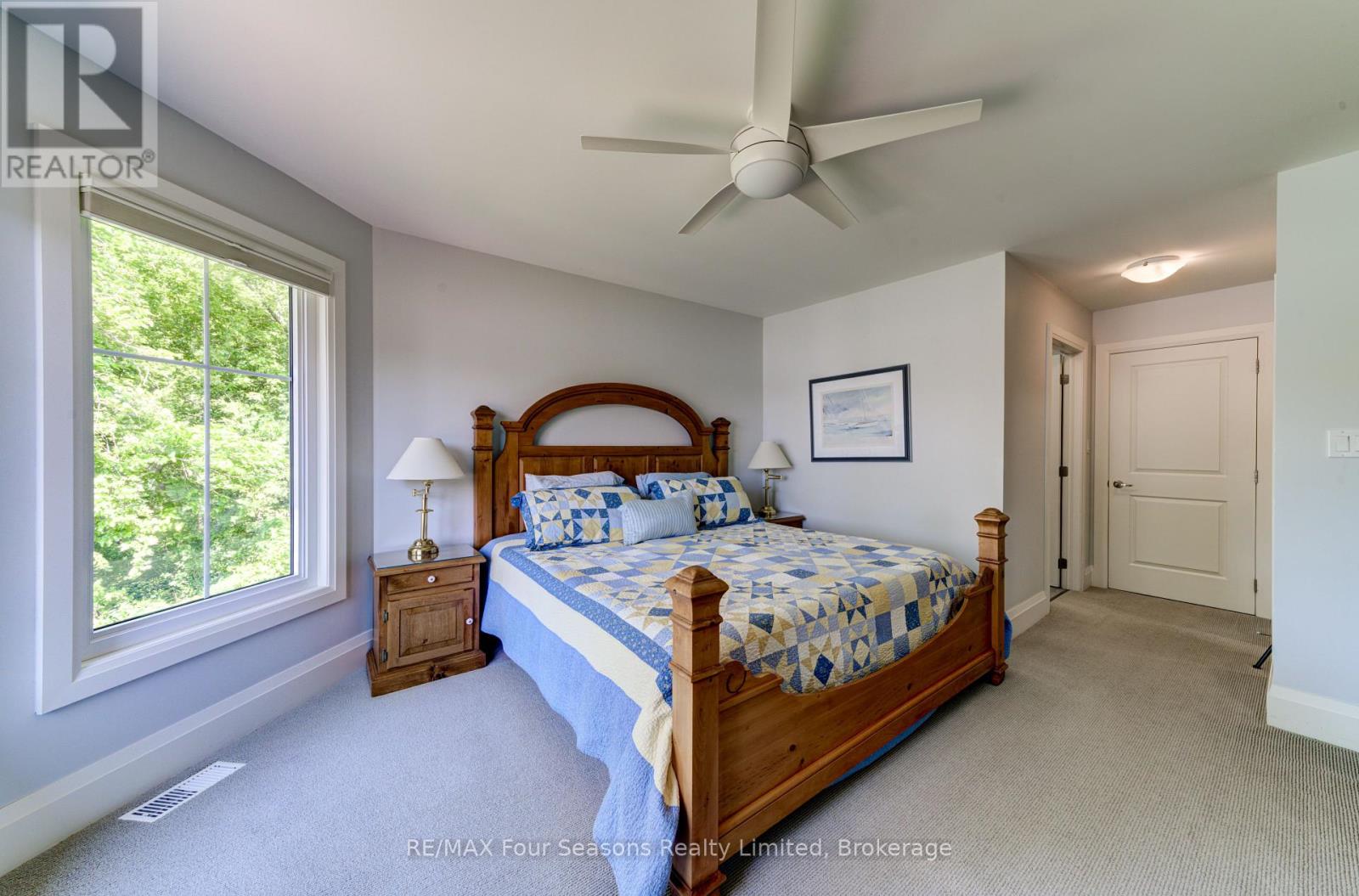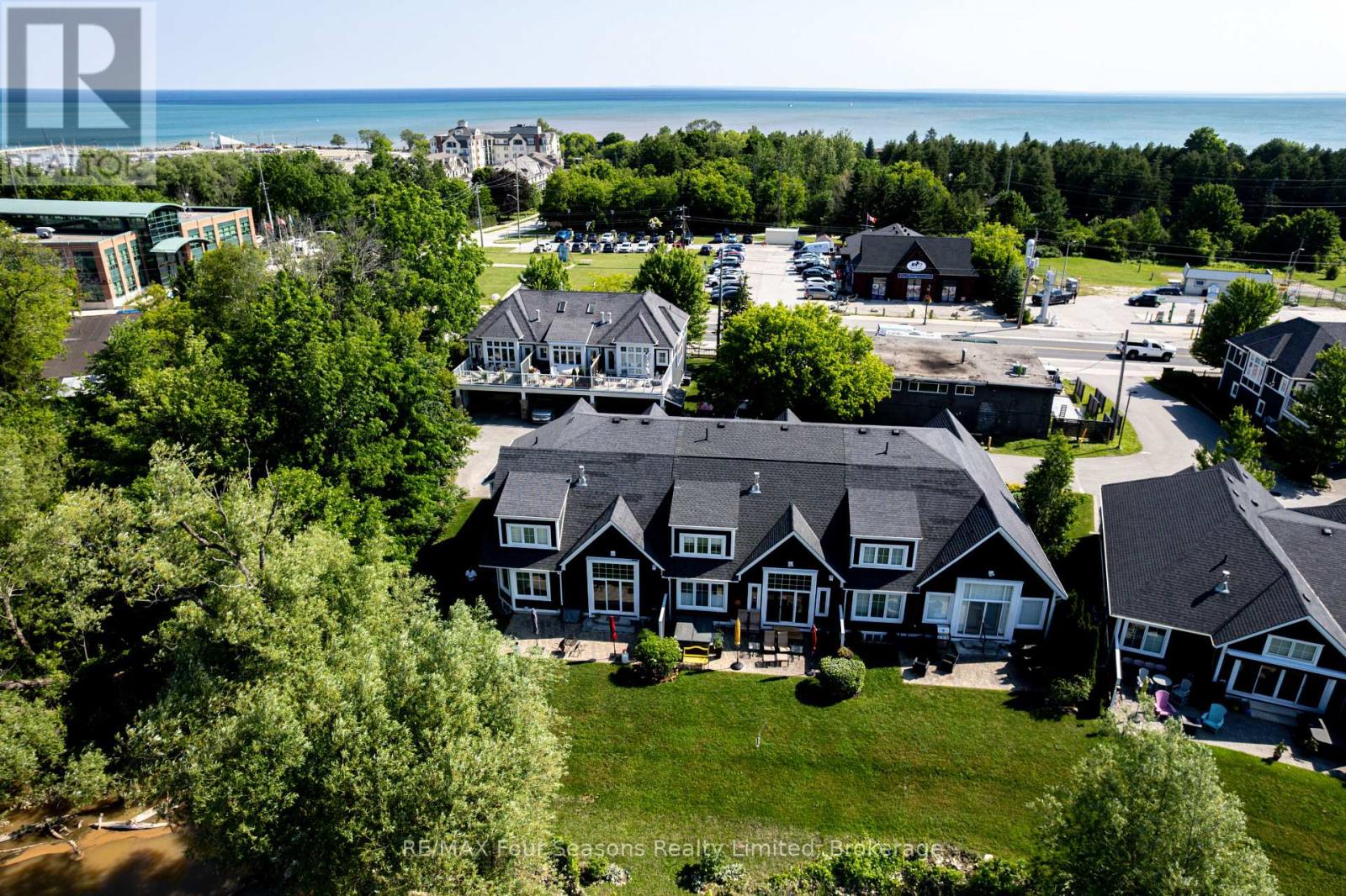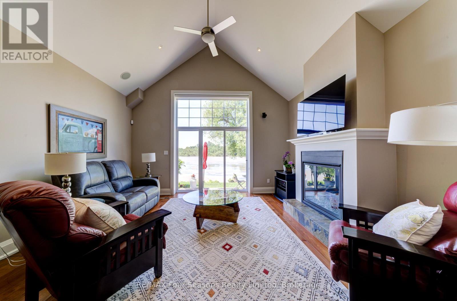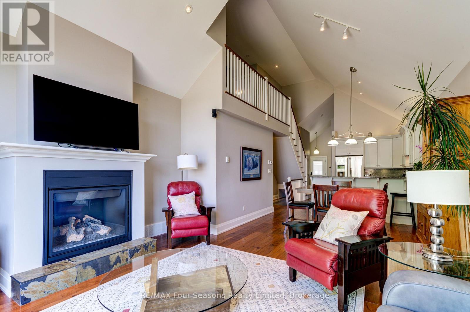 THE MILL POND in the heart of Thornbury presents a great waterfront opportunity. This 4 bedroom bungaloft home is the best location in this small enclave of homes where nature meets peaceful contemporary living. This million dollar unobstructed WATERFRONT VIEW offers peace and tranquility while watching the activities of swans, ducks, egrets, beaver, otters and more. Yet only a few minutes walk to the main street of Thornbury with it's boutique shops, art galleries and restaurants. Stroll down to the marina and Bayview Park or the fish ladder on the damn. For skiers it's only a 5 minute drive to Georgian Peaks and 15 minutes to Blue Mountain and other private ski clubs. This end unit bungaloft boasts the best location on the MILLPOND and the largest floorplan with a double car garage. MAIN FLOOR PRIMARY bedroom with ensuite and heated floors has large windows to take in the view of the water. A further bedroom on the main level can be an office or den. Open plan main floor living with beautiful hemlock flooring, a custom kitchen with granite counters, stainless steel appliances and island bar. Dining area and living room share soaring cathedral ceilings and a gas fireplace for those cold winter evenings. French doors open to the patio area with beautifully landscaped gardens. The lofted second level offers two further bedrooms, a large four piece bathroom and a sitting area overlooking the main level. Thoughtfully planned and constructed with extra insulation in the living room and master bedroom walls, energy efficient windows, HRV system, on demand hot water heater, The attached double car garage is insulated and has inside entry door. A shared dock offers you a place to watch beautiful s a place sunrises as well as access for your kayaks/canoes. On site rack for your canoes/kayaks. (id:64974)