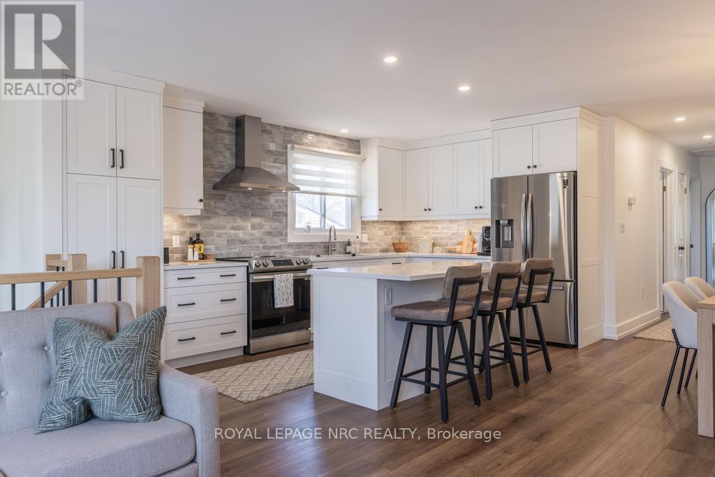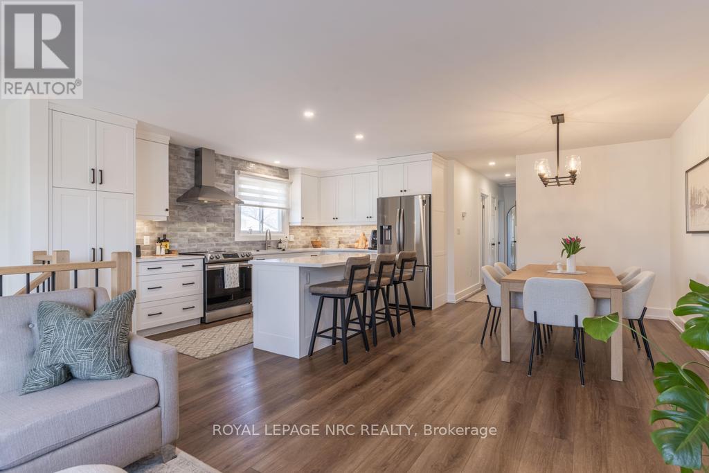 Welcome to 22 Fox Trail Drive, located in one of St. Catharines most desirable, family friendly neighbourhoods. This recently renovated semi-detached has been customized both inside and out and is sure to impress! As you enter this wonderful raised bungalow you are greeted with an inviting foyer offering views to the stunning open concept upper level main floor. Renovated in 2023, the superb layout offers bright windows, luxury wide plank vinyl floors, and a dream kitchen complete with custom Del Priore cabinets, a handsome backsplash, stainless steel appliances, an oversized centre island and beautiful Calcutta Quartz countertops. Enjoy hosting your family and friends in the spacious dining room and charming living room, allowing for both the perfect get togethers and quiet nights in. Down the hallway are 3 generously sized bedrooms all with new carpets and a full 4pc bathroom. The lower level has a separate entrance providing access to the fully fenced backyard and garden shed and features above grade windows, a huge rec room, updated 3 pc bath with a beautiful walk-in shower, and a large 4th bedroom that is currently used as a home office. The laundry room is located towards the backdoor which provides the opportunity for income potential should one wish to do the necessary modifications. The handsome modernized exterior, poured concrete parking space, easily maintained private flag stone patio and tasteful hardscaping were all completed in 2022. This neighbourhood is in an extremely convenient location, close to great schools, parks, public transit, the Hospital, grocery stores, the LCBO, restaurants and shopping plazas, Brock University, in and outdoor activities and the highway for easy commuting. Perfect for a growing family or as an investment opportunity. Whether you're up, down, inside, or out, you will be proud to call this lovely turn-key home yours! (id:64974)