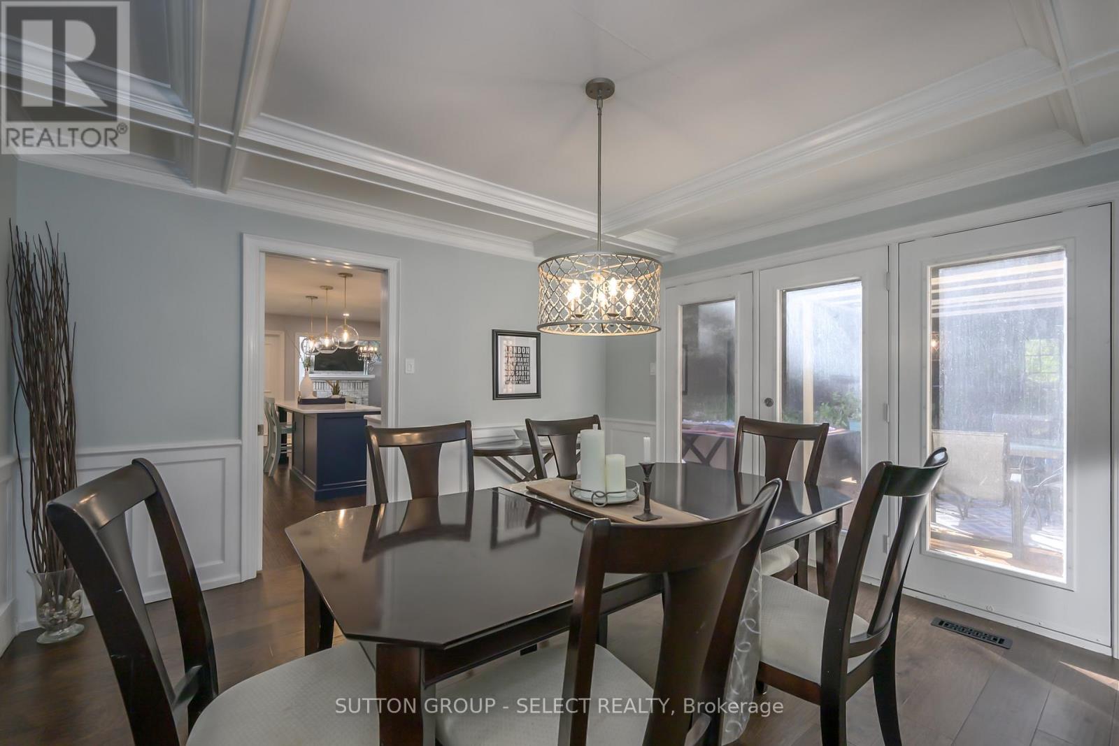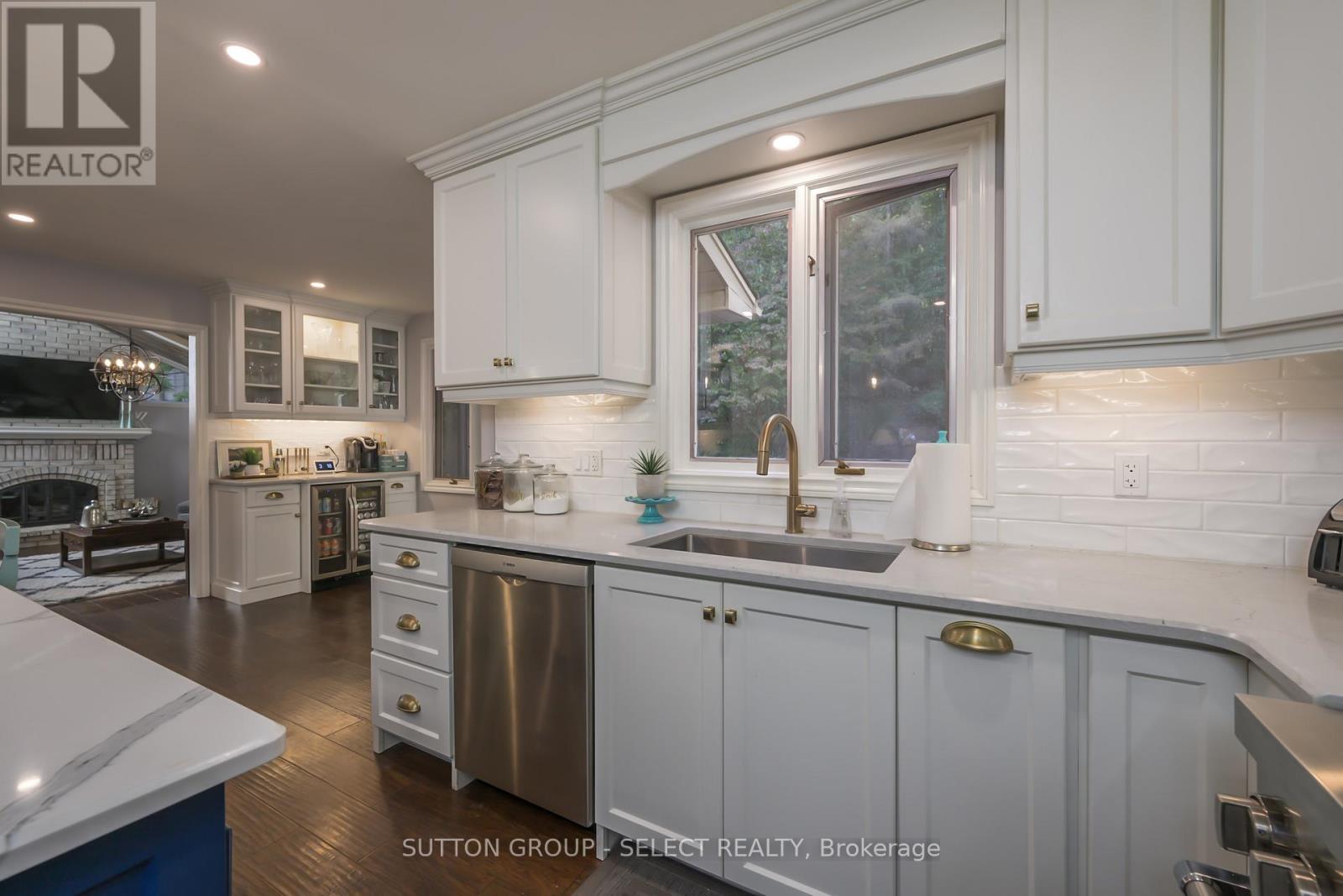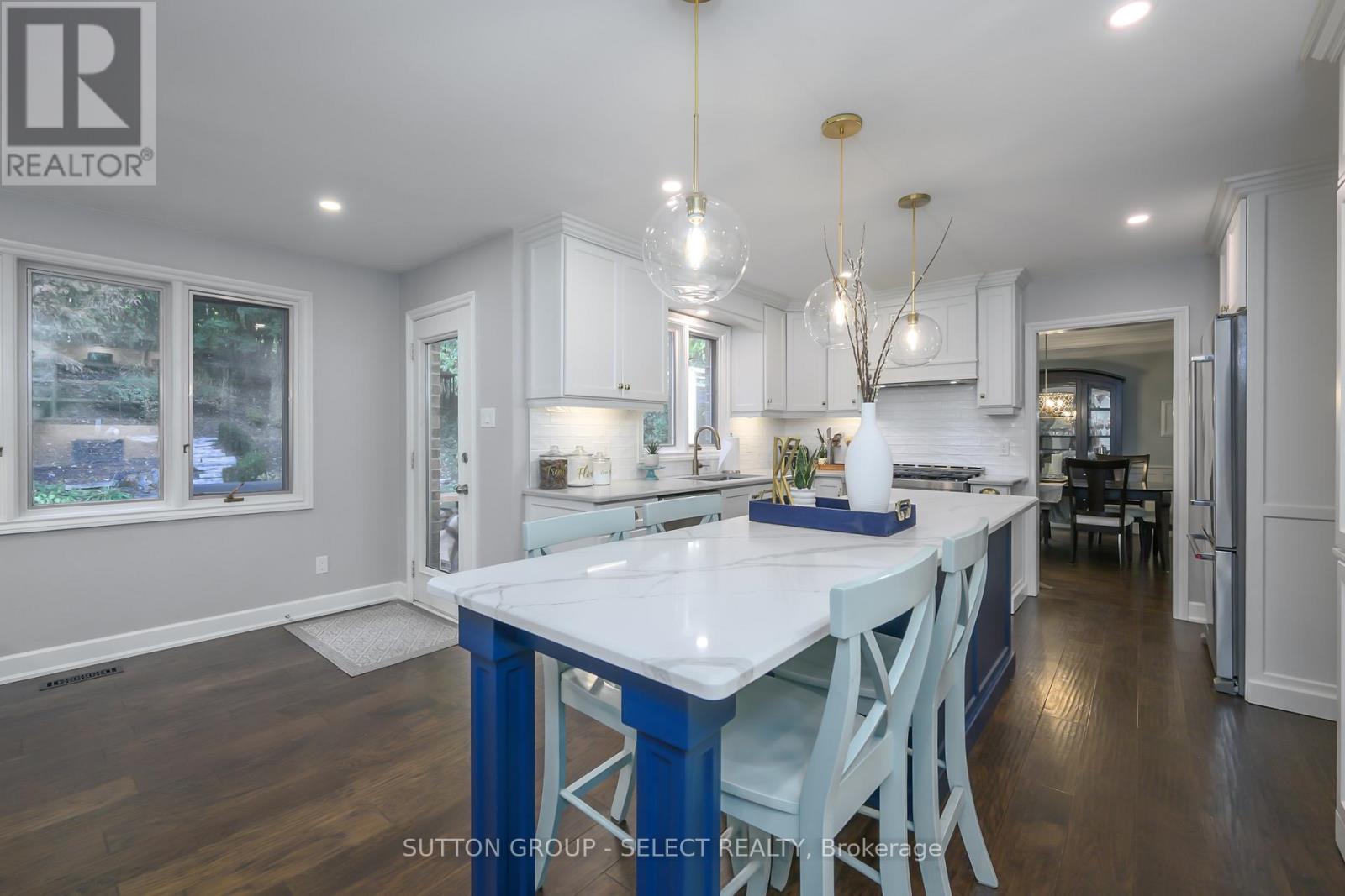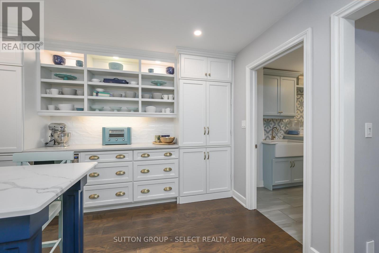 Offered for only the second time since its completion in 1986, 22 Mapleton Place is a once in a lifetime property. Situated in one of London's most desirable enclaves, this 4+1 bed home, with separate entry and in-law suite potential, has been fully renovated to the highest standard. Throughout the home, you will find extensive custom millwork, including crown moulding, wainscoting and several built-in units on each floor. Embracing the classic centre hall plan, you will find the office and formal living room off of the grand foyer. In the dining room, there is a coffered ceiling and doors leading to the rear deck. Pocket doors lead you into the expansive custom kitchen with quartz countertops, gas range, custom counter deep fridge as well as 2 dishwashers (one hidden integrated drawer system), hidden pantry and coffee/ bar station. The laundry is complete with convenient chute, quartz counters and built in mudroom cabinetry. Completing the main floor is a great room with cozy gas fireplace, clad in grass cloth wallpaper, and reclaimed 120 year old barn board ceilings from a farm in Huron County. On the second level, there are 4 good sized bedrooms, including the primary, with features an updated 5-piece bathroom and walk-in closet. The other 3 bedrooms share a guest bath with marble and subway tile, and frameless glass shower. In the lower level there are an additional 2 bonus rooms (including a bar room with sink) and an additional renovated bath with frameless glass and marble flooring. Private stairwell and separate entrance. All of this backing onto Warbler Woods with the absolute privacy of landscaping, new deck and massive pond with waterfall and mature Japanese maple tree. Upgrades include roof (2022), garage doors (2022), Kitchen (2022), all baths (2018-2022) engineered hickory and maple flooring throughout, custom millwork and built-ins, reclaimed ceiling in great room, updated electrical and plumbing (id:64974)