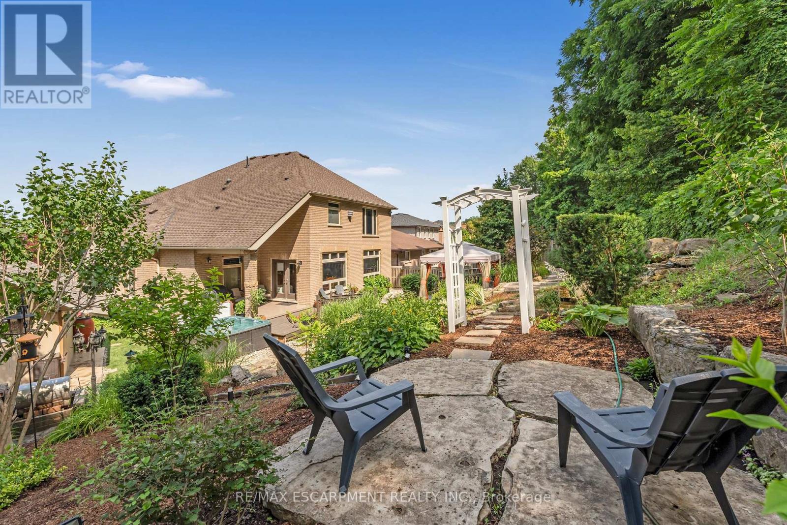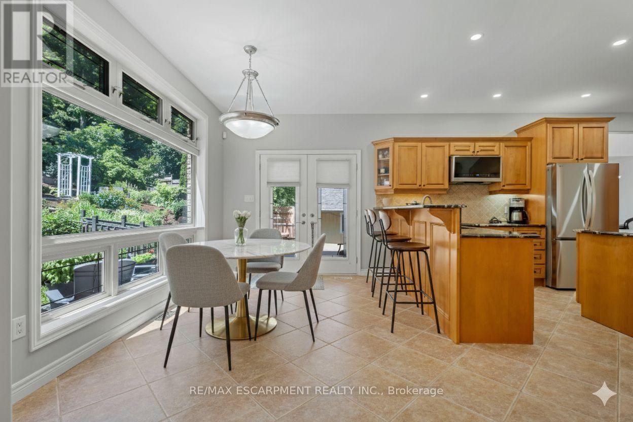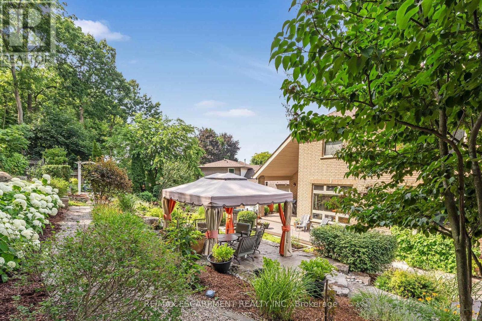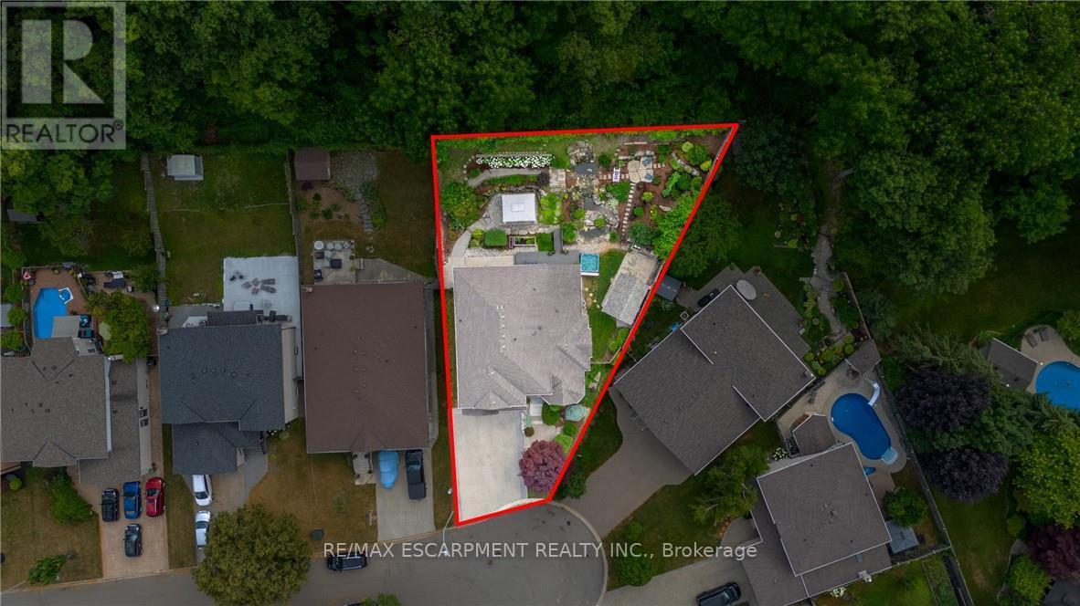 Escape the hectic pace of the modern world and step into your own private cottage retreat. Nestled gracefully beneath the Niagara Escarpment on a quiet crescent, this custom-built (2003) home sits on a premium pie-shaped lot backing onto lush, protected green space. This isn't just a backyard; it's a lifestyle. Imagine trading screen time for real-world adventures-watching your kids catch frogs by your private, multi-tiered waterfall or chase fireflies as the sun goes down. Spend your evenings soaking in the hot tub, letting the stresses of the day melt away to the tranquil sounds of trickling water and a gentle symphony of cicadas and grasshoppers. It is a true piece of calm in a busy world. Inside, that connection to nature continues. Oversized windows flood the meticulously maintained 4+1 bedroom home with natural light, complementing the soaring ceilings and elegant rounded corners. The freshly painted interior features a kitchen equipped with brand-new appliances (including a gas cooktop option) protected by a 4-year warranty, plus reverse osmosis water at every sink. When it's time to unwind, the spacious primary suite serves as the ultimate sanctuary, featuring a two-sided gas fireplace shared with a luxurious, spa-like ensuite. Family living is made easy with walk-in closets in every single bedroom, central vac, and two fruit cellars. The fully finished basement offers fantastic in-law or income potential, boasting rare 9-foot ceilings, a separate entrance, and a roughed-in kitchen. Complete with an oversized exposed aggregate driveway parking six cars, this move-in-ready home perfectly balances the tranquility of nature with modern luxury. (id:64974)
