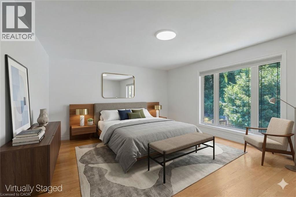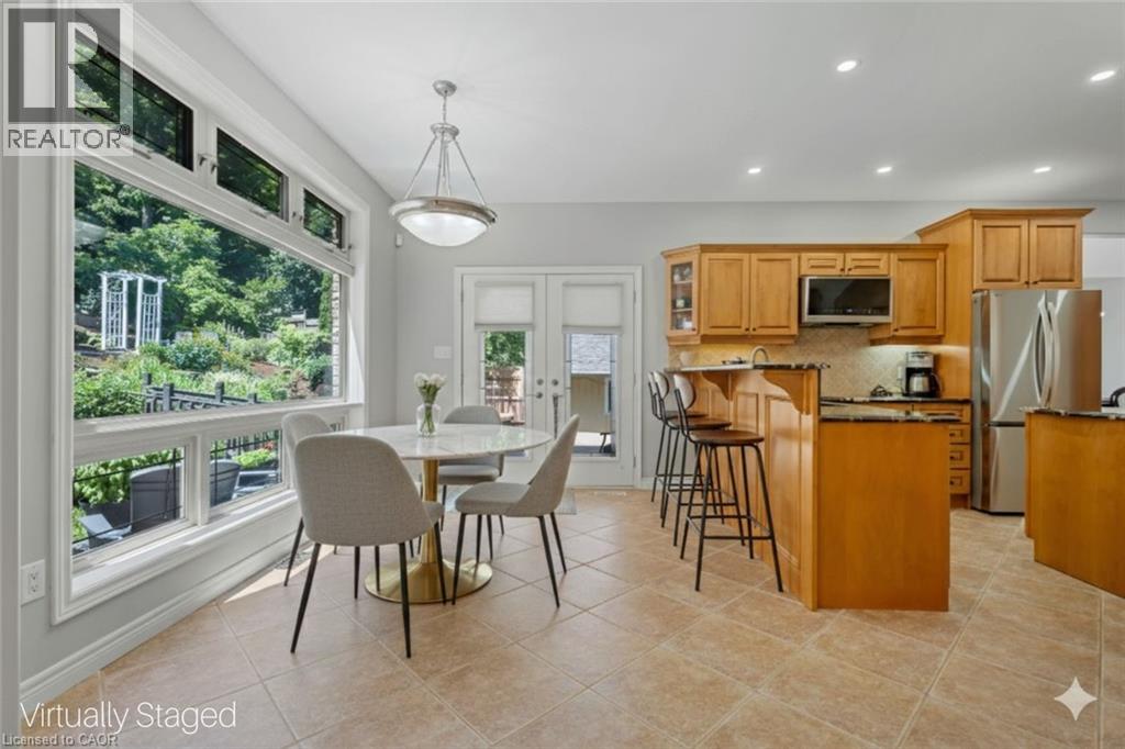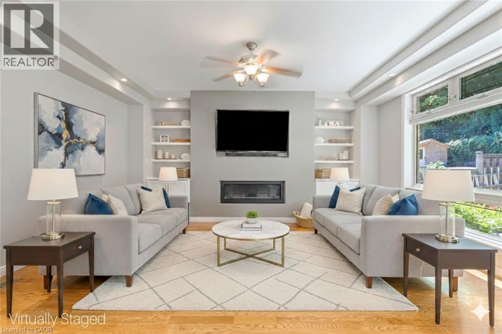 Escape the hectic pace of the modern world and step into your own private cottage retreat. Nestled gracefully beneath the Niagara Escarpment on a quiet crescent, this custom-built (2003) home sits on a premium pie-shaped lot backing onto lush, protected green space. This isn't just a backyard; it’s a lifestyle. Imagine trading screen time for real-world adventures—watching your kids catch frogs by your private, multi-tiered waterfall or chase fireflies as the sun goes down. Spend your evenings soaking in the hot tub, letting the stresses of the day melt away to the tranquil sounds of trickling water and a gentle symphony of cicadas and grasshoppers. It is a true piece of calm in a busy world. Inside, that connection to nature continues. Oversized windows flood the meticulously maintained 4+1 bedroom home with natural light, complementing the soaring ceilings and elegant rounded corners. The freshly painted interior features a kitchen equipped with brand-new appliances (including a gas cooktop option) protected by a 4-year warranty, plus reverse osmosis water at every sink. When it’s time to unwind, the spacious primary suite serves as the ultimate sanctuary, featuring a two-sided gas fireplace shared with a luxurious, spa-like ensuite. Family living is made easy with walk-in closets in every single bedroom, central vac, and two fruit cellars. The fully finished basement offers fantastic in-law or income potential, boasting rare 9-foot ceilings, a separate entrance, and a roughed-in kitchen. Complete with an oversized exposed aggregate driveway parking six cars, this move-in-ready home perfectly balances the tranquility of nature with modern luxury. (id:64974)