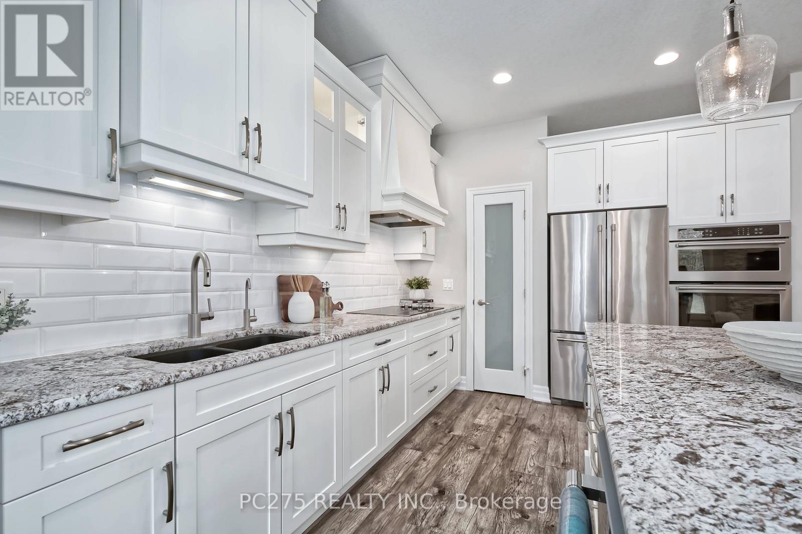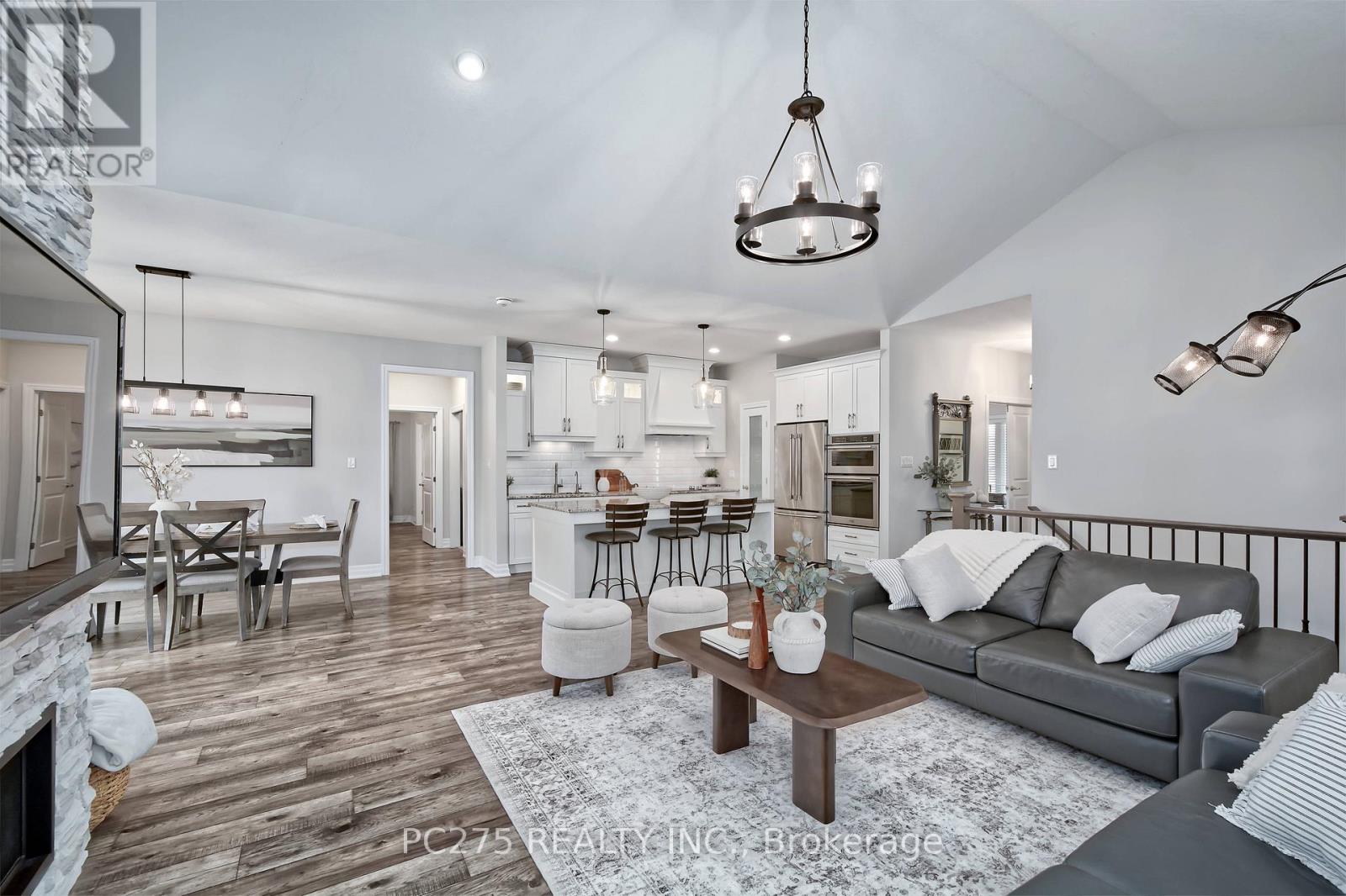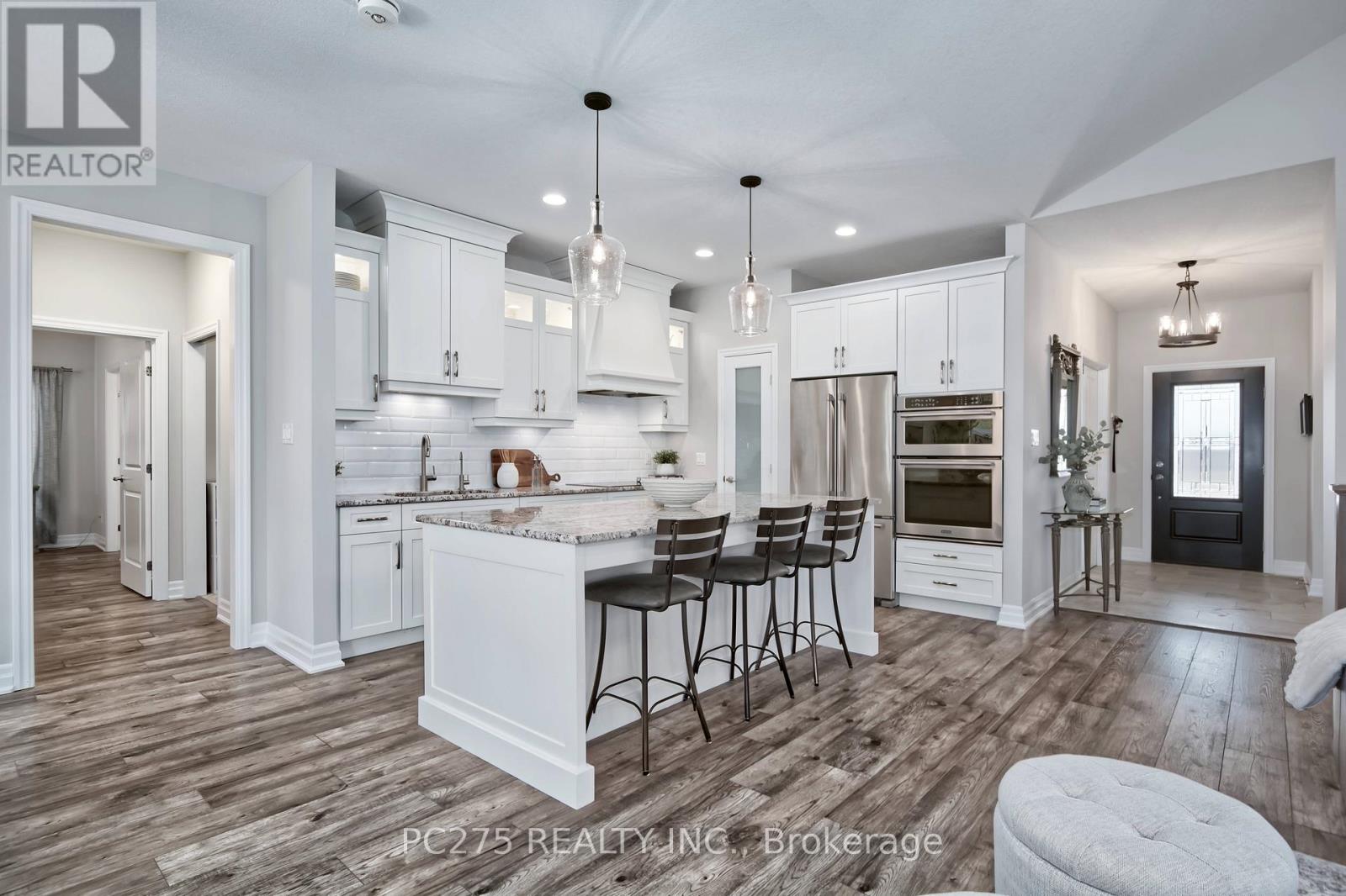 Stunning, spacious, and an absolute show stopper, this open concept style 3+1 bedroom, 3 bathroom ranch brings numerous high end custom build features you'll struggle to find all in one place! Making an excellent first impression upon entering the home, you are greeted by Mannington laminate and ceramic tile flooring, a linear in-wall gas fireplace, cathedral ceilings, and more. Prepare your meals in style in a beautiful GCW custom built kitchen with island, granite counter tops, built-in stainless steel oven, dishwasher, microwave, counter-top range, and refrigerator. The primary bedroom with a large walk-in closet and ensuite bathroom ensures comfort with a whirlpool jetted-tub, dual, opposing wall shower heads, 2 sinks, ceramic tile, and a dark stained maple vanity. With no rear or front neighbouring homes, enjoy a scenic view from the front porch or peace and privacy in the rear. Entertain guests in a multitude of ways! The lower level features a large and open recreation are for movies or catching the big game, a 16 foot bar, and pool table (included!). You can also take the gathering out back to a spacious backyard that now includes a heated 16x12 recreational retreat with hydro, a 9-person spa with gazebo, concrete patio, and deep lot for the kids to play in! With so much to offer, this is a definite must-see! (id:64974)