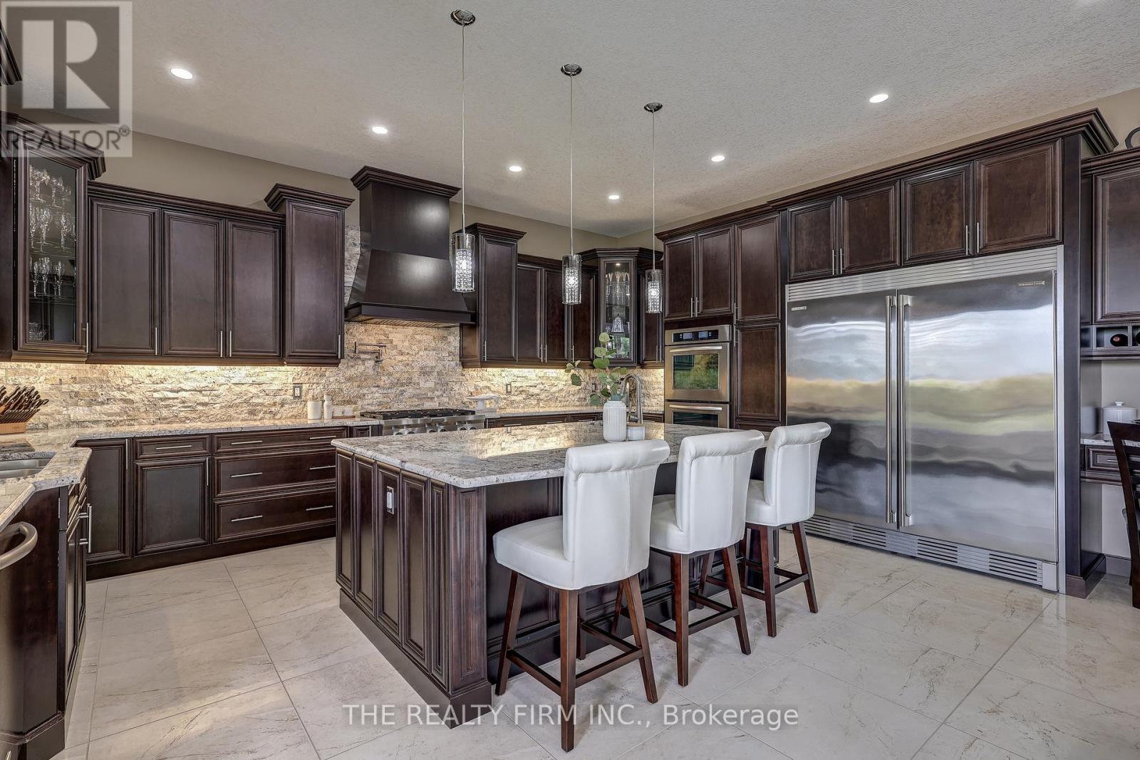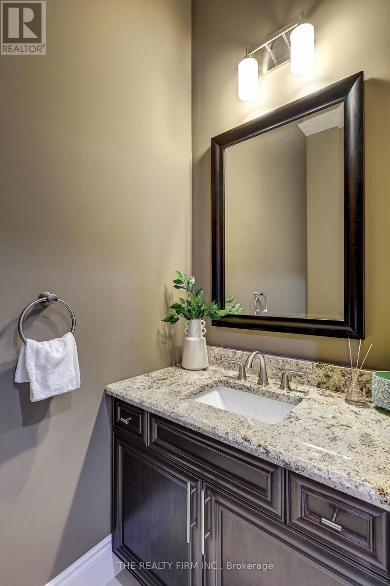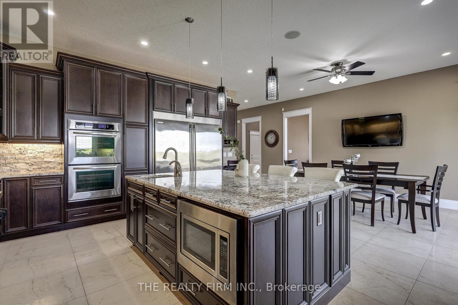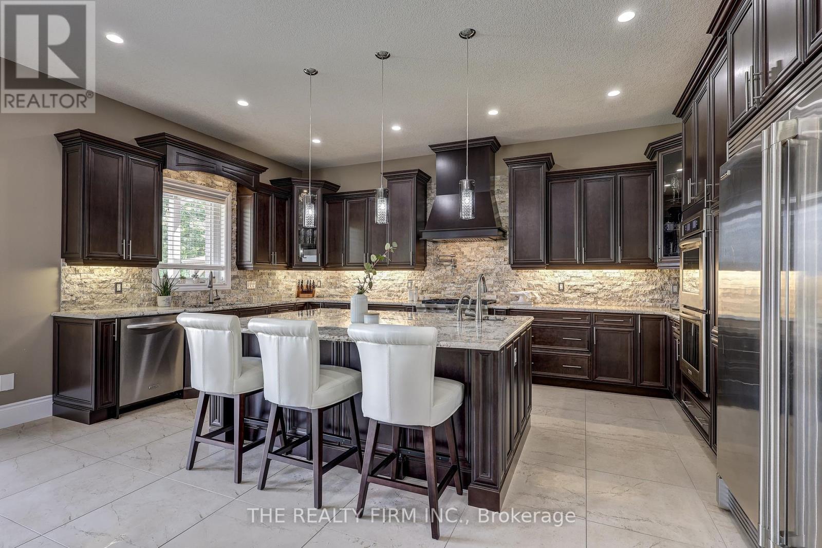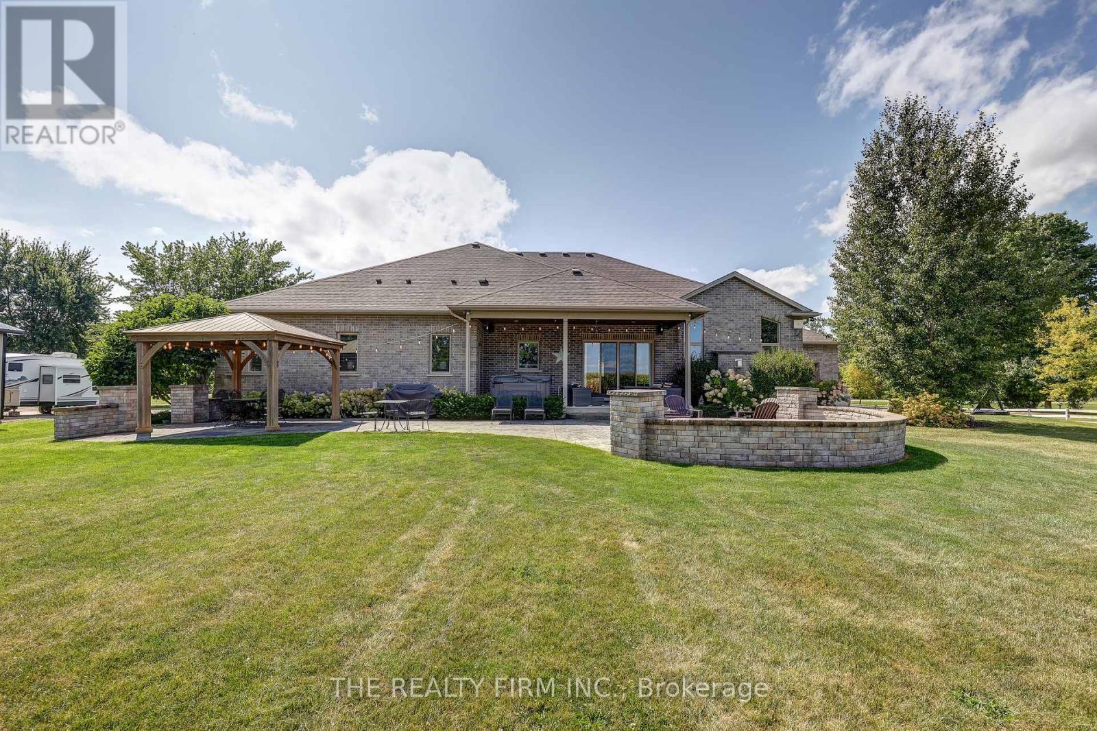 Welcome to your sanctuary of refined rural living at 22060 Nissouri Rd. Thorndale On. A breathtaking estate nestled on 1.33 acres spanning over 5,000 sq ft with exquisitely finished space. This majestic home features 4 + 1 bedrooms and 3.5 baths, crafted with thoughtful design and premium craftsmanship at every turn. Step through the stately entry into a 12' coffered-ceiling foyer with poplar custom trim flowing seamlessly into the family room with its soaring 13 vaulted ceiling and commanding floor-to-ceiling plaster gas fireplace. The kitchen, dazzles with maple cabinetry, a massive island with sink with reverse osmosis, a 6 burner gas stove, double wall ovens and luxe finishes like a travertine backsplash, Brizo faucets and Electrolux ICON fridge/freezer. The main level boasts 10 ceilings, 8 doors, hand scraped oak floors, Italian porcelain tile, granite throughout and an ambient speaker system all complemented by Hunter Douglas window treatments. A convenient main-floor laundry and custom drop zone add to daily ease. The lower level inspires with a stylish wet bar, wine fridge, additional bedroom, full bath, quartz and dual electric fireplaces, oak staircase, spray-foam insulation, separate garage access and a cold room. This property is ideal for multigenerational living with the separate lower level entrance, full amenities and expansive layout. Outside experience meticulously curated 360 landscaping and lighting, stamped concrete walkways and patios, a covered 10' x 25' patio with speakers, insulated attic & 2 extra circuits for a future sunroom addition. Completing the yard is a gas fire pit, a 20' x 22' shed with hydro, gazebo, backyard hydrant and a triple garage with an extra bay door to the back. Thorndale offers tranquility and vibrant community living with playgrounds, splash pad, skate park, sports courts and community gardens. A short drive to Londons premier shopping, business district & airport. The perfect blend of rural and urban charm (id:64974)