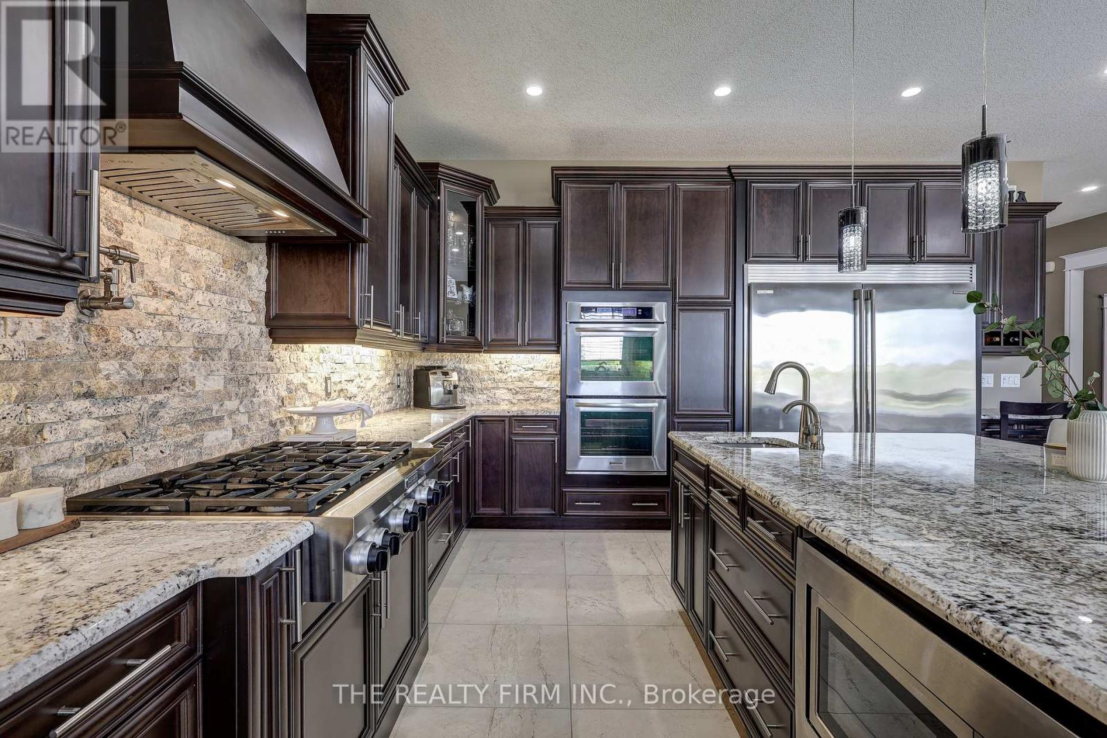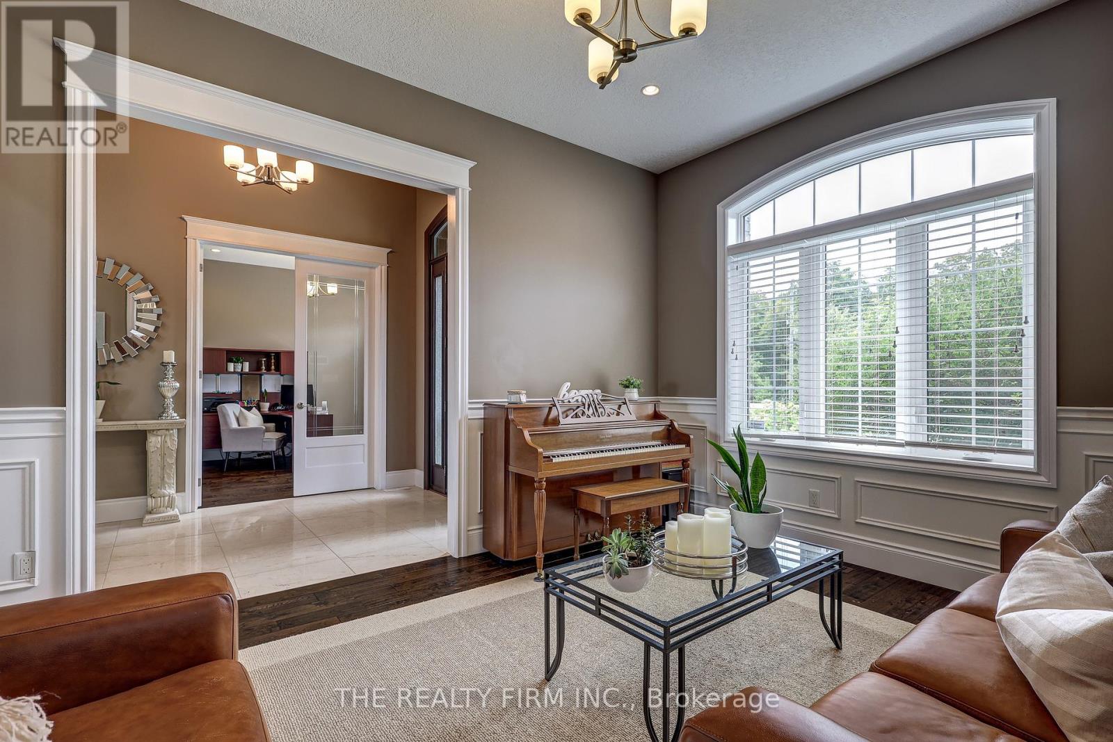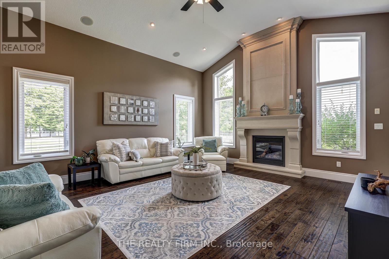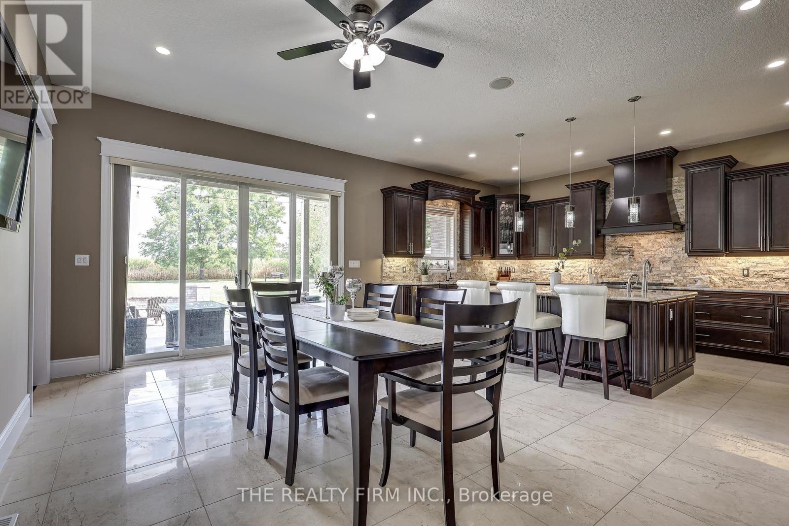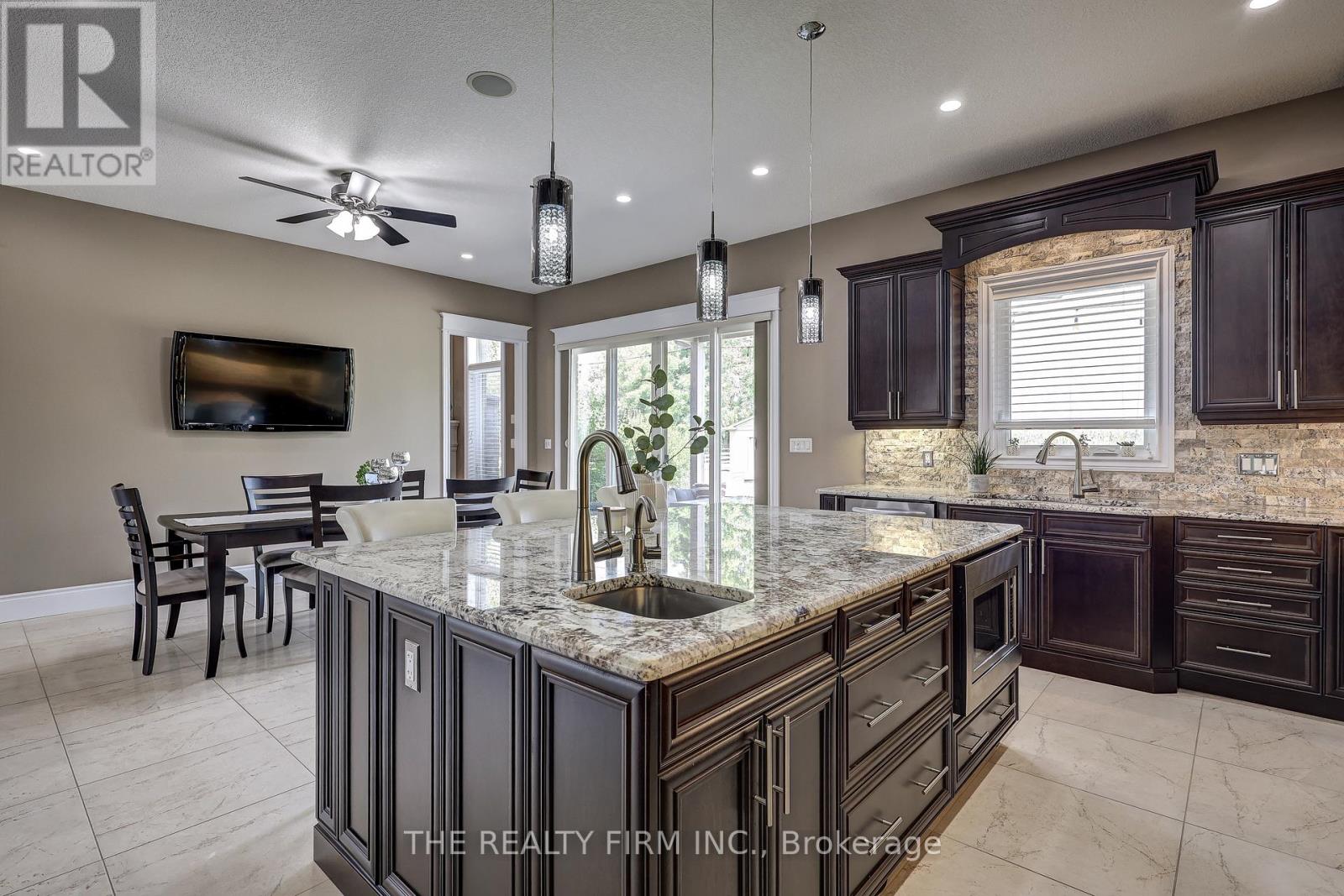 Welcome to your sanctuary of refined rural living at 22060 Nissouri Rd. Thorndale On. A breathtaking estate nestled on 1.33 acres spanning over 5,000 sq ft with exquisitely finished space. This majestic home features 4 + 1 bedrooms and 3.5 baths, crafted with thoughtful design and premium craftsmanship at every turn. Step through the stately entry into a 12' coffered-ceiling foyer with poplar custom trim flowing seamlessly into the family room with its soaring 13 vaulted ceiling and commanding floor-to-ceiling plaster gas fireplace. The kitchen, dazzles with maple cabinetry, a massive island with sink with reverse osmosis, a 6 burner gas stove, double wall ovens and luxe finishes like a travertine backsplash, Brizo faucets and Electrolux ICON fridge/freezer. The main level boasts 10 ceilings, 8 doors, hand scraped oak floors, Italian porcelain tile, granite throughout and an ambient speaker system all complemented by Hunter Douglas window treatments. A convenient main-floor laundry and custom drop zone add to daily ease. The lower level inspires with a stylish wet bar, wine fridge, additional bedroom, full bath, quartz and dual electric fireplaces, oak staircase, spray-foam insulation, separate garage access and a cold room. This property is ideal for multigenerational living with the separate lower level entrance, full amenities and expansive layout. Outside experience meticulously curated 360 landscaping and lighting, stamped concrete walkways and patios, a covered 10' x 25' patio with speakers, insulated attic & 2 extra circuits for a future sunroom addition. Completing the yard is a gas fire pit, a 20' x 22' shed with hydro, gazebo, backyard hydrant and a triple garage with an extra bay door to the back. Thorndale offers tranquility and vibrant community living with playgrounds, splash pad, skate park, sports courts and community gardens. A short drive to Londons premier shopping, business district & airport. The perfect blend of rural and urban charm (id:64974)