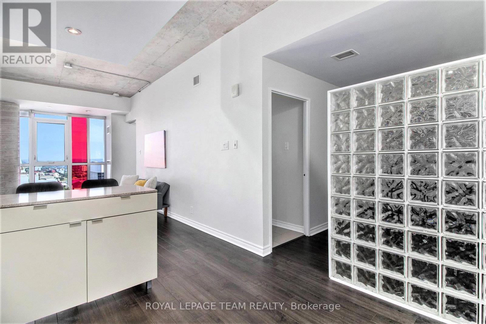 Welcome to The Mondrian by Urban Capital, where elevated downtown living meets unbeatable views. This 22nd-floor one-bedroom plus den unit offers breathtaking panoramic vistas of the Ottawa River and downtown skyline through floor-to-ceiling windows and soaring 10-foot exposed concrete ceilings. The open-concept layout is ideal for modern living, featuring a sleek kitchen with granite countertops, stainless steel appliances, and generous living and dining areas perfect for entertaining or working from home. The spacious bedroom includes wall-to-wall closets and captivating city views, while the den provides a flexible space for a home office or guest area. Enjoy the convenience of in-unit laundry and access to premium building amenities, including a concierge, three high-speed elevators, a fully equipped fitness centre, an outdoor rooftop terrace with BBQs, a plunge pool with cabanas, and a stylish party room complete with lounge seating, a billiards table, dining area, and wet bar. Located just steps from the Parliament LRT station, Ottawa U, Rideau Centre, Shoppers Drug Mart, grocery stores, the National Arts Centre, Parliament Hill, and an endless selection of restaurants and cafés, this is urban living at its finest. Dont miss your chance to own a premium unit in one of Ottawas most iconic condo buildings. (id:64974)