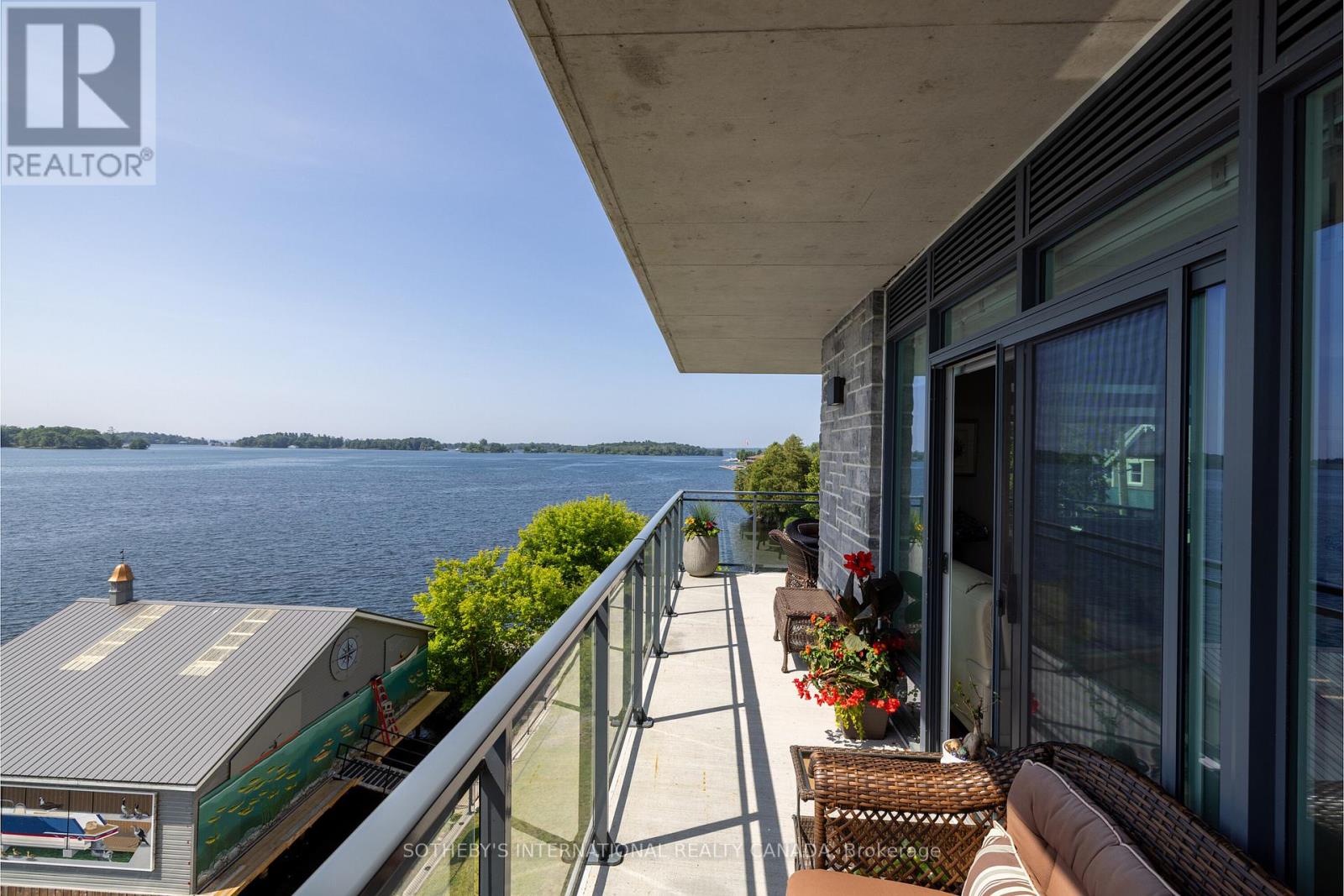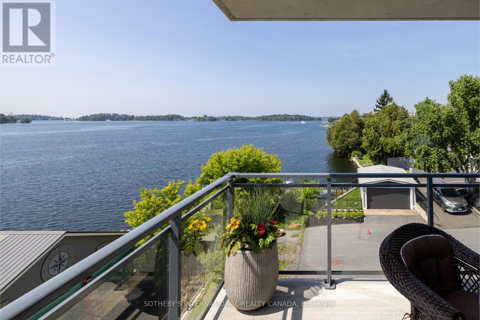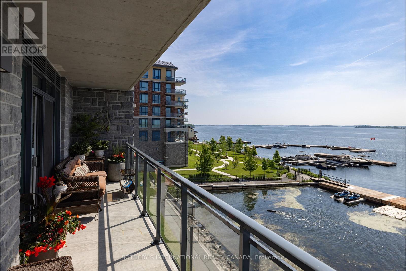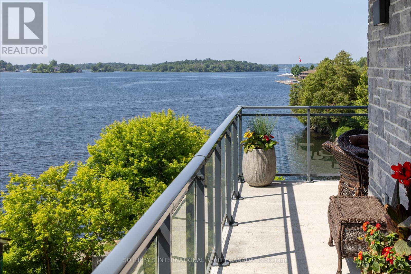 Experience refined waterfront living along the iconic St. Lawrence River in this exceptional 2-bedroom, 2-bathroom corner residence. Showcasing sweeping 270-degree panoramic views to the south, west, and north, this home captures ever-changing skies, sparkling water, and unforgettable sunsets from nearly every vantage point. Designed for those who appreciate both luxury and lifestyle, this residence offers a rare and coveted 44-foot private boat slip-inviting you to move seamlessly from elegant everyday living to effortless escapes on the water. Inside, a thoughtfully designed open-concept layout blends sophistication with comfort. A striking stone accent wall anchors the living space, where a sleek fireplace and curved 60" television create a warm, contemporary focal point-perfect for both intimate evenings and elevated entertaining. The gourmet kitchen is a statement in both form and function, featuring high-end appliances, marble countertops, a custom backsplash, and a layout designed to maximize space and flow. Throughout the home, upgraded hardwood flooring, motorized smart blinds, and curated lighting enhance the sense of modern luxury. The primary suite offers a tranquil retreat, complete with a spa-inspired ensuite and serene water views-an ideal place to unwind and recharge. Additional features include two parking spaces and a generous storage locker, ensuring convenience matches the home's elegance. This is more than a residence-it is a rare opportunity to embrace a sophisticated waterfront lifestyle, where luxury, comfort, and natural beauty converge. Please note that some photos have been virtually staged. (id:64974)