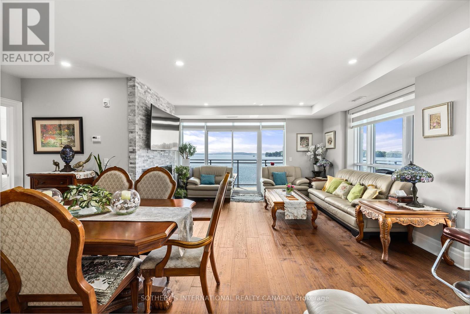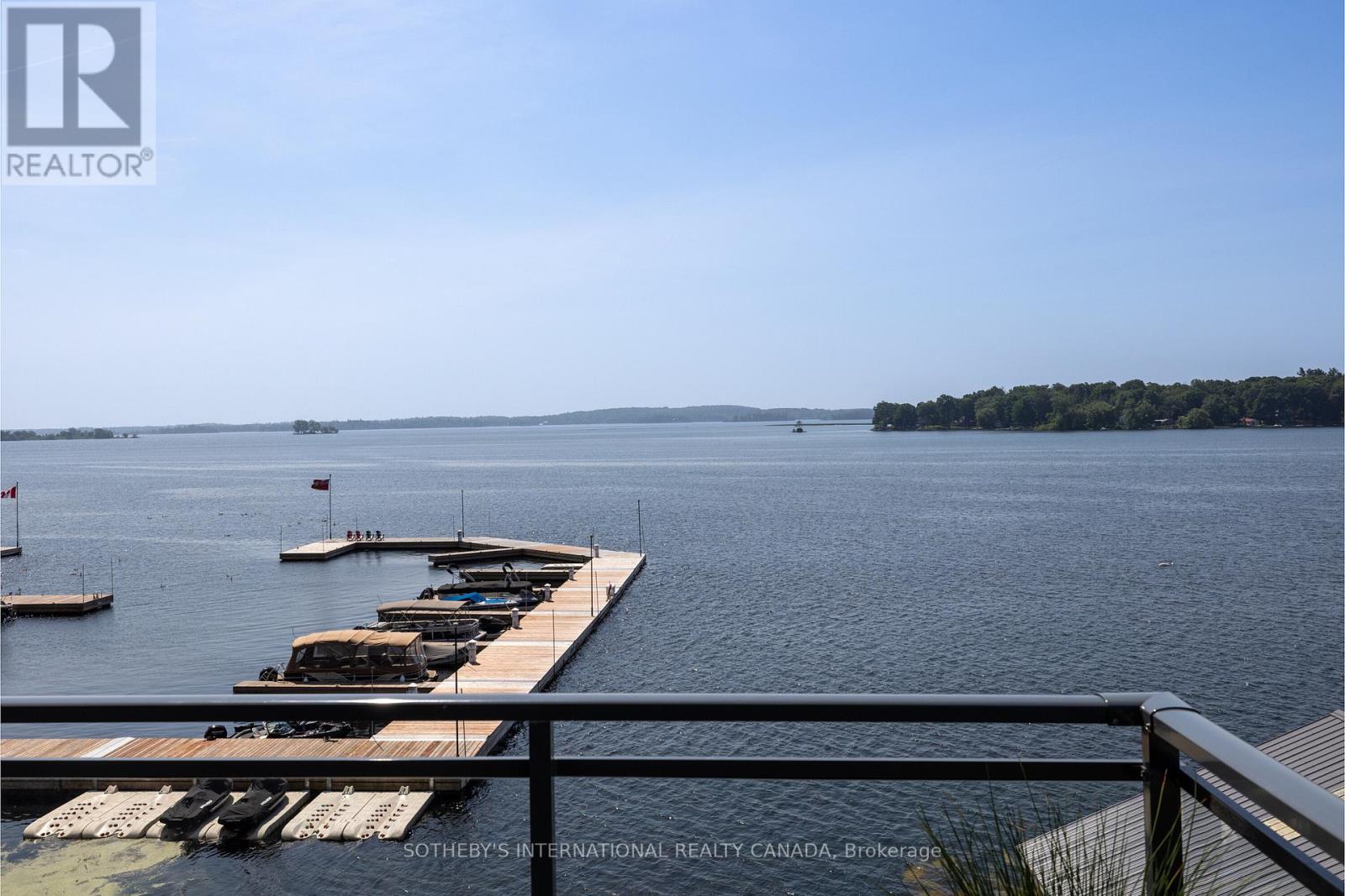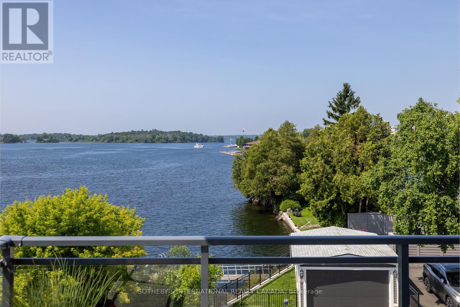 Experience refined waterfront living along the iconic St. Lawrence River in this exceptional 2-bedroom, 2-bathroom corner residence. Showcasing sweeping 270-degree panoramic views to the south, west, and north, this home captures ever-changing skies, sparkling water, and unforgettable sunsets from nearly every vantage point. Designed for those who appreciate both luxury and lifestyle, this residence offers a rare and coveted 44-foot private boat slip-inviting you to move seamlessly from elegant everyday living to effortless escapes on the water. Inside, a thoughtfully designed open-concept layout blends sophistication with comfort. A striking stone accent wall anchors the living space, where a sleek fireplace and curved 60" television create a warm, contemporary focal point-perfect for both intimate evenings and elevated entertaining. The gourmet kitchen is a statement in both form and function, featuring high-end appliances, marble countertops, a custom backsplash, and a layout designed to maximize space and flow. Throughout the home, upgraded hardwood flooring, motorized smart blinds, and curated lighting enhance the sense of modern luxury. The primary suite offers a tranquil retreat, complete with a spa-inspired ensuite and serene water views-an ideal place to unwind and recharge. Additional features include two parking spaces and a generous storage locker, ensuring convenience matches the home's elegance. This is more than a residence-it is a rare opportunity to embrace a sophisticated waterfront lifestyle, where luxury, comfort, and natural beauty converge. Please note that some photos have been virtually staged. (id:64974)