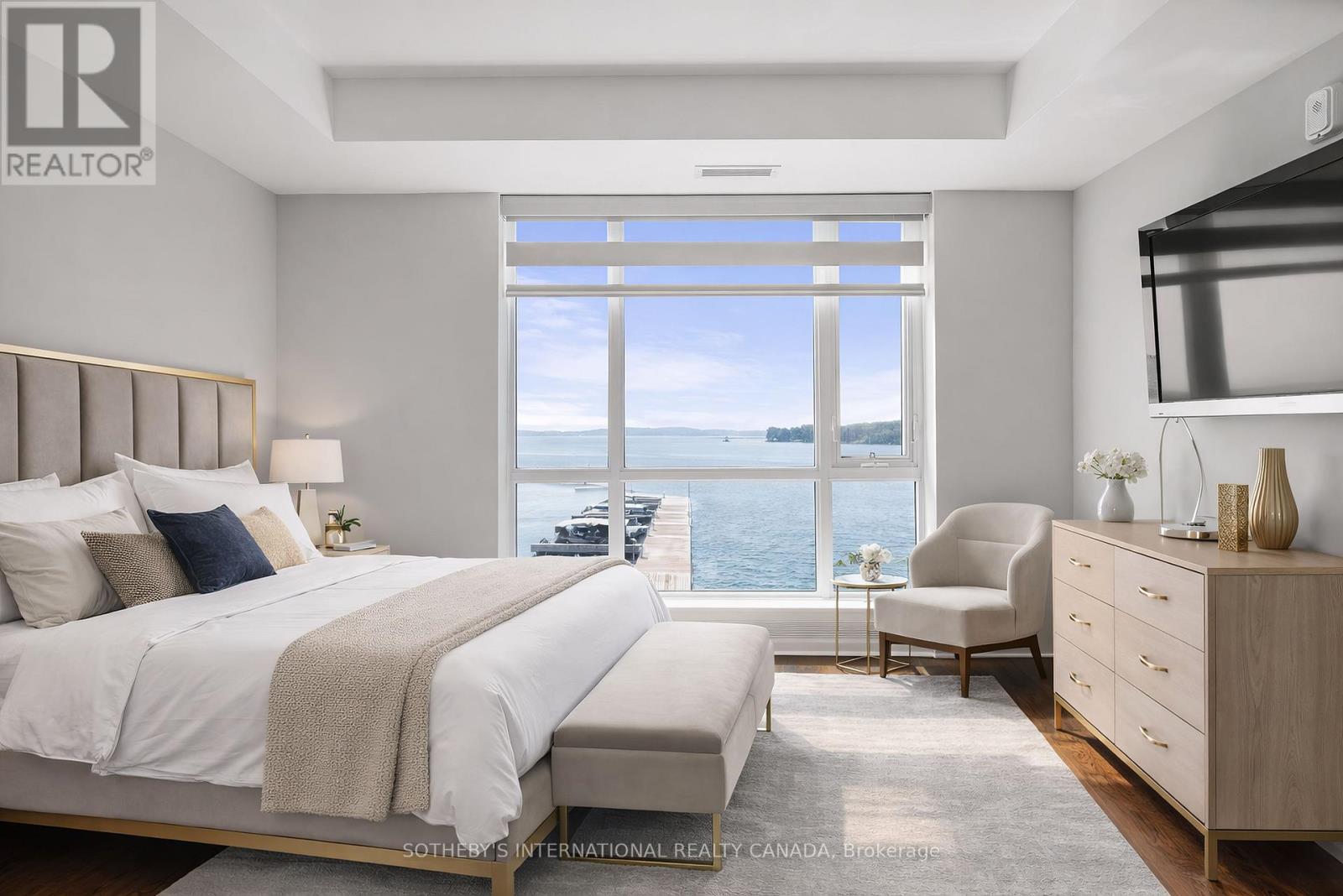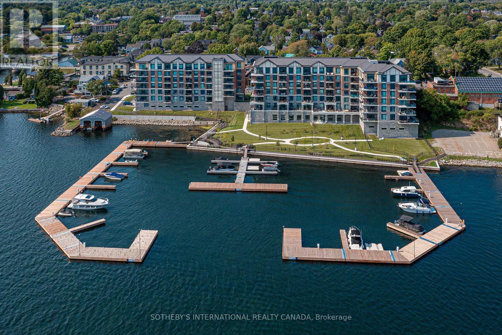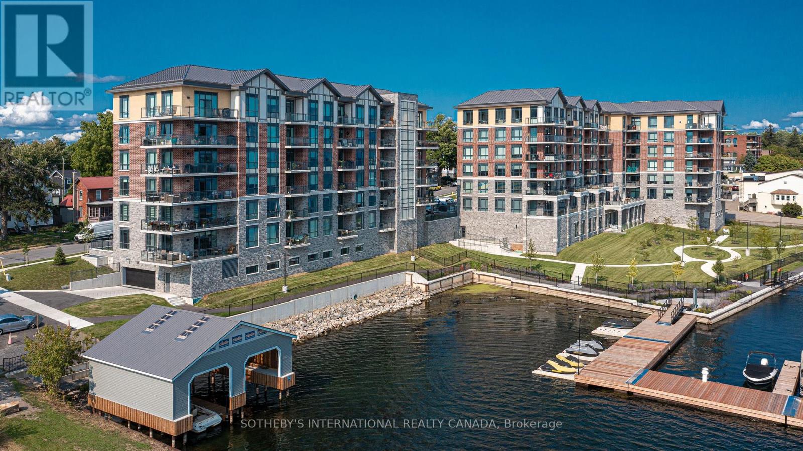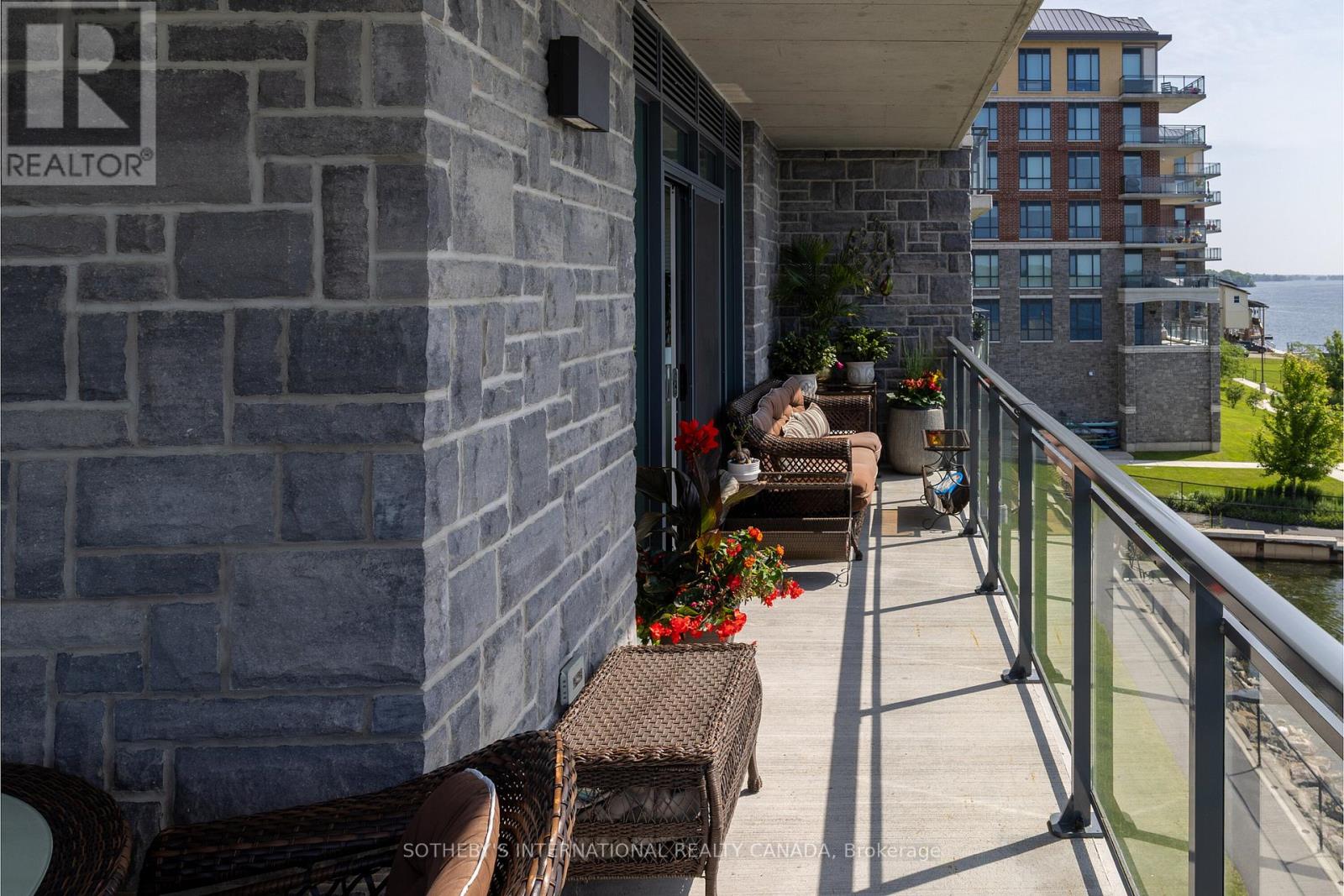 Experience refined waterfront living along the iconic St. Lawrence River in this exceptional 2-bedroom, 2-bathroom corner residence. Showcasing sweeping 270-degree panoramic views to the south, west, and north, this home captures ever-changing skies, sparkling water, and unforgettable sunsets from nearly every vantage point. Designed for those who appreciate both luxury and lifestyle, this residence offers a rare and coveted 44-foot private boat slip-inviting you to move seamlessly from elegant everyday living to effortless escapes on the water. Inside, a thoughtfully designed open-concept layout blends sophistication with comfort. A striking stone accent wall anchors the living space, where a sleek fireplace and curved 60" television create a warm, contemporary focal point-perfect for both intimate evenings and elevated entertaining. The gourmet kitchen is a statement in both form and function, featuring high-end appliances, marble countertops, a custom backsplash, and a layout designed to maximize space and flow. Throughout the home, upgraded hardwood flooring, motorized smart blinds, and curated lighting enhance the sense of modern luxury. The primary suite offers a tranquil retreat, complete with a spa-inspired ensuite and serene water views-an ideal place to unwind and recharge. Additional features include two parking spaces and a generous storage locker, ensuring convenience matches the home's elegance. This is more than a residence-it is a rare opportunity to embrace a sophisticated waterfront lifestyle, where luxury, comfort, and natural beauty converge. Please note that some photos have been virtually staged. (id:64974)