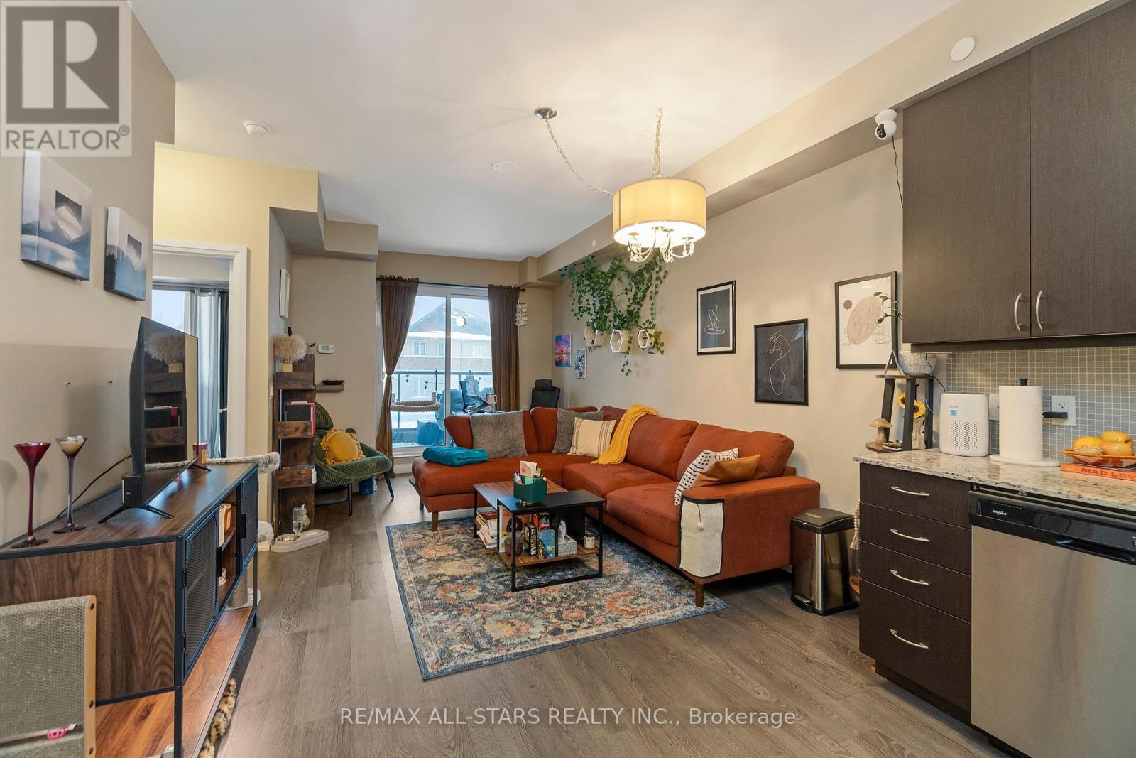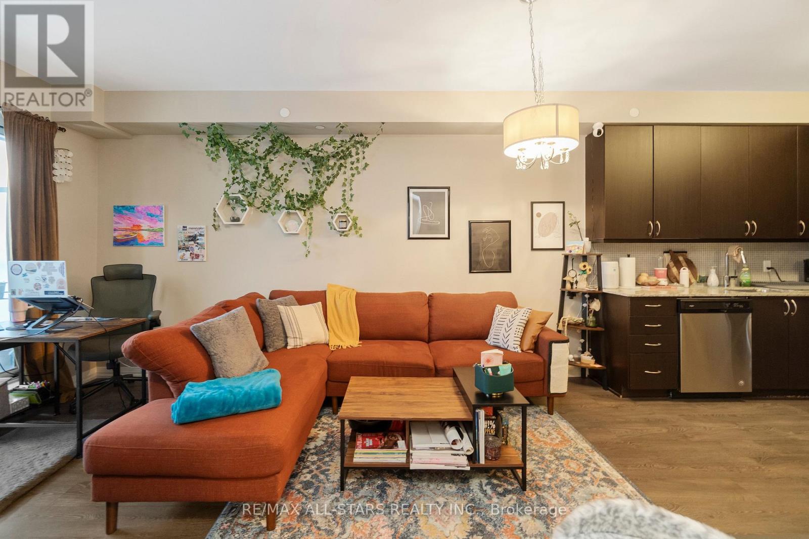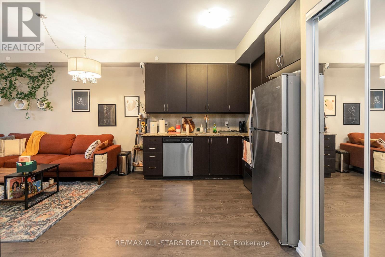 Amazing value in one of Markham's most convenient and walkable locations "The Mark", 221-9560 Markham Rd is the perfect opportunity for a first-time buyer, downsizer or savvy investor looking for lifestyle and long-term potential. Enjoy the ease of walking to the GO Train for a stress-free commute, and spend your weekends exploring Main Street festivals, local restaurants, shops, groceries, pharmacies and the surrounding nature trails just steps from your door. This well-managed boutique building offers concierge service and impressive amenities including a gym, incredible party/media/dining area/games room, guest suite, pet wash, car wash and an amazing rooftop terrace w bbq & outdoor garden area. Inside, the 683 sq ft 1 bedroom + den layout has 9 ft ceilings and is bright, open and highly functional, with a proper entryway that leads into a versatile den seamlessly integrated into the living space - ideal for working from home without feeling confined. The upgraded kitchen features granite countertops, stainless steel appliances and exceptional storage including a built-in pantry and front hall closet. The spacious living area accommodates full - sized furniture and opens to a west-facing balcony with high ceilings and large windows that fill the space with natural light-perfect for enjoying afternoon sun or evening summer cocktails. Laminate flooring runs throughout the main living areas for a modern, low-maintenance finish. The bedroom offers generous closet space, wall-to-wall windows and its own walk-out to the balcony, complete with remote control blinds for added comfort and convenience. One underground parking space and locker (locker: approx 5.9 feet by 2.8 feet) are included, making this an outstanding opportunity in a prime Markham location. (id:64974)