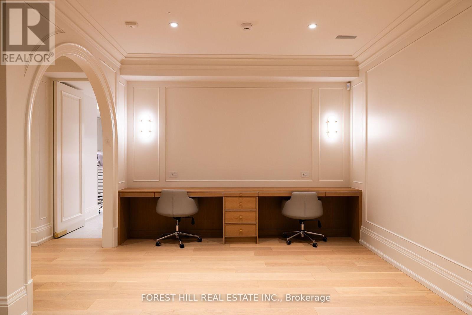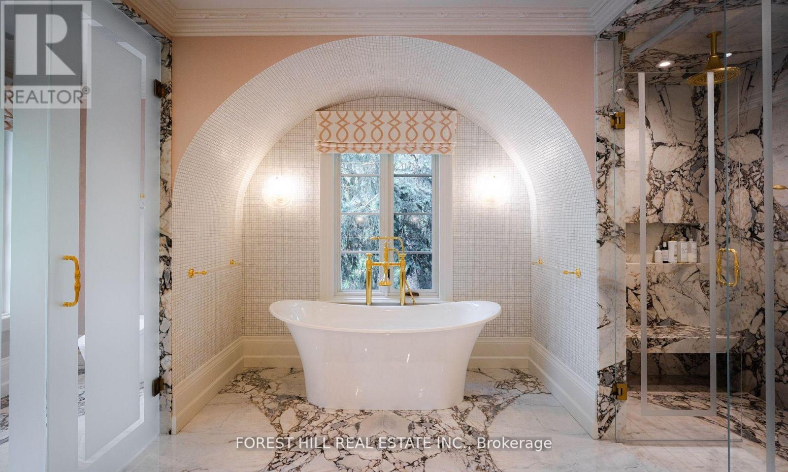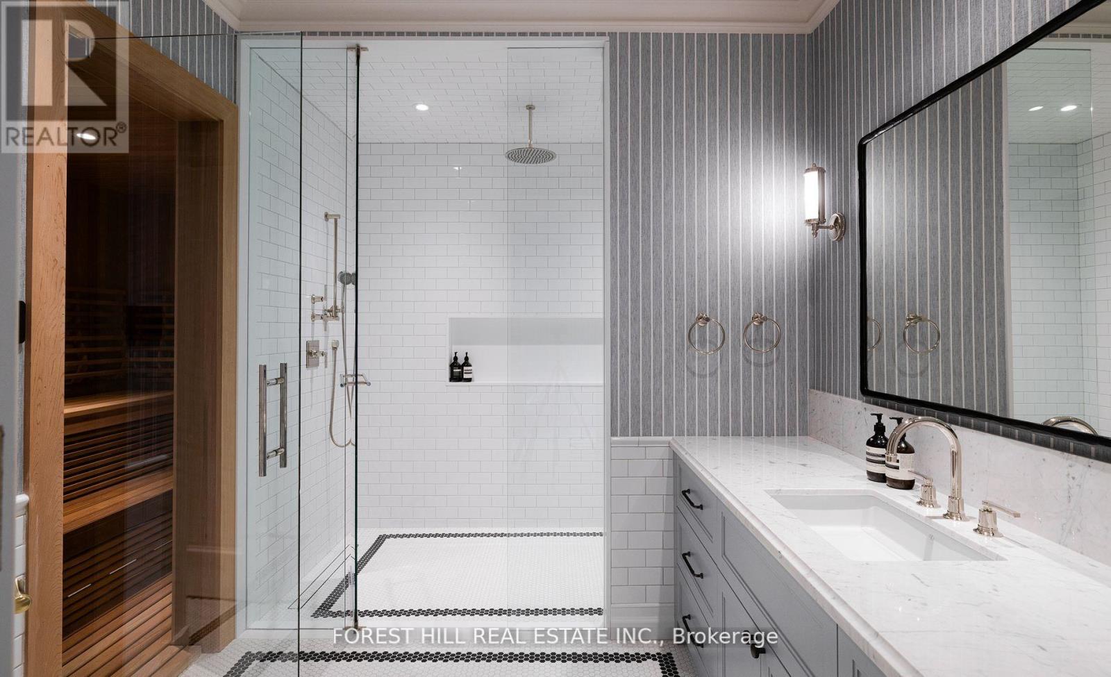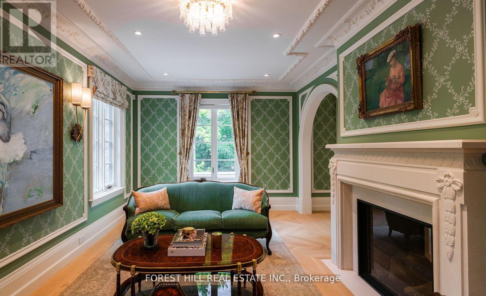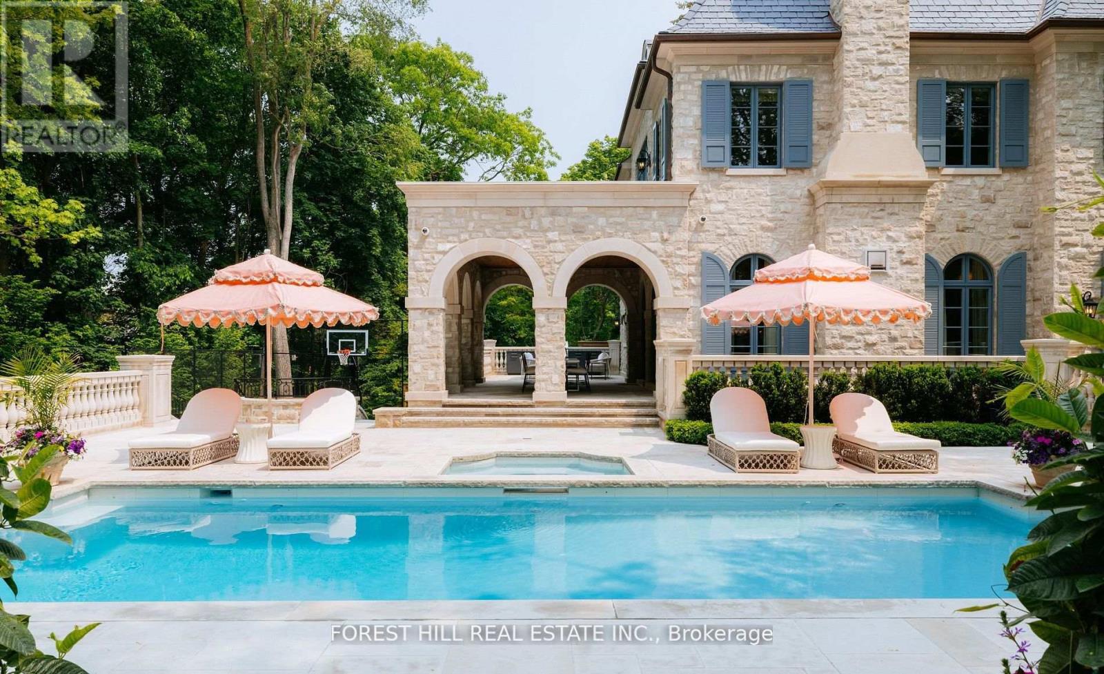Welcome to 221 Forest Hill Road, an architectural triumph with nearly 13,000 sq ft of living space on a private 17,000 sq ft lot, nestled along the Beltline Trail in the heart of one of Toronto's most exclusive enclaves. This estate represents the pinnacle of bespoke luxury, meticulously brought to life by the city's finest: JTF Homes, Lorne Rose Architect, and Dvira Interiors. Clad in hand-selected limestone and inspired by the romance of the French countryside, the residence evokes the timeless elegance of a Provencal chateau. Arched windows with weathered-blue shutters, a stately turret, and a gracefully symmetrical facade create a striking first impression. A dramatic arcaded loggia opens onto manicured grounds and landscaping imagined by Fitzgerald and Roderick, featuring a lap pool, sports court, and lavish gardens that offer privacy and tranquility. The interiors are nothing short of breathtaking curated blend of old-world grandeur and modern refinement. The main level features soaring ceilings and a dramatic spiral staircase. Chevron-patterned white oak floors, arched passages, imported wallpaper, and tailored lighting reflect impeccable attention to detail. The formal dining room (seating 20) flows effortlessly into a statement kitchen adorned with hand-painted Portuguese tiles and custom cabinetry by Emanuele Furniture Design. The sunlit family room is anchored by a hand-carved fireplace and opens onto the gardens through elegant French doors. The crown jewel is the primary suite, a true sanctuary with vaulted ceilings, whimsical wallpaper, arched detailing, and a fireside lounge that creates a retreat-like atmosphere. The piece de resistance: a couture-inspired, two-storey dressing room with a spiral staircase and chandelier, paired with a spa-like ensuite clad in expansive stone and Shirley Wagner fixtures. The lower level features a sprawling rec room, games lounge, prep kitchen, gym, cedar sauna, and a home theatre for the ultimate cinematic escape. (id:64974)