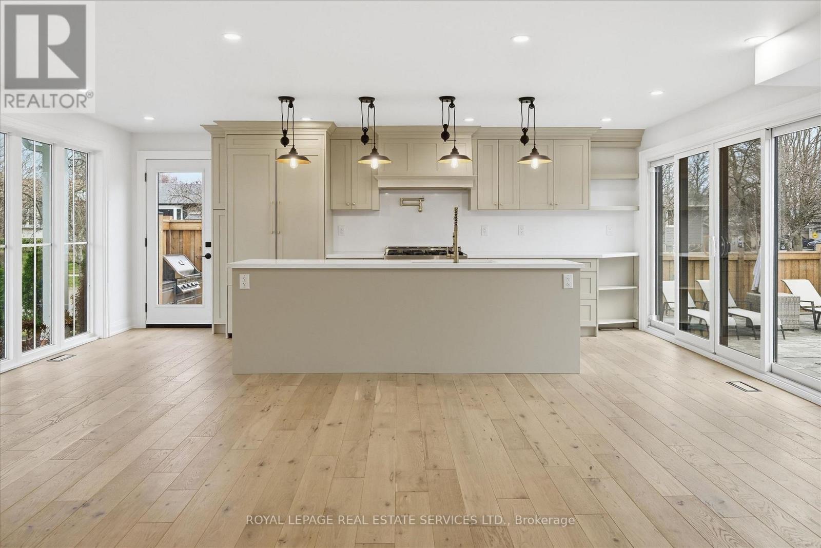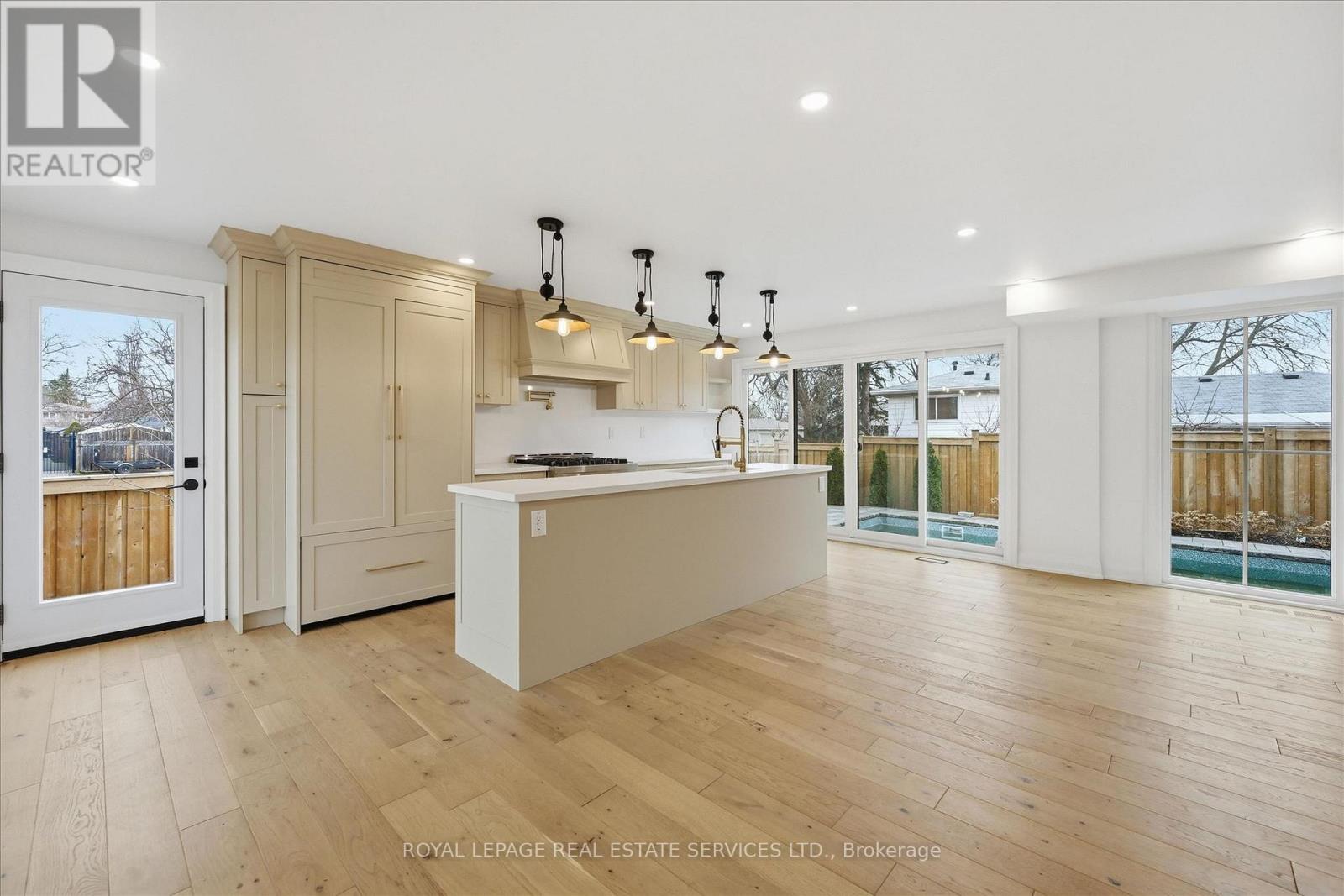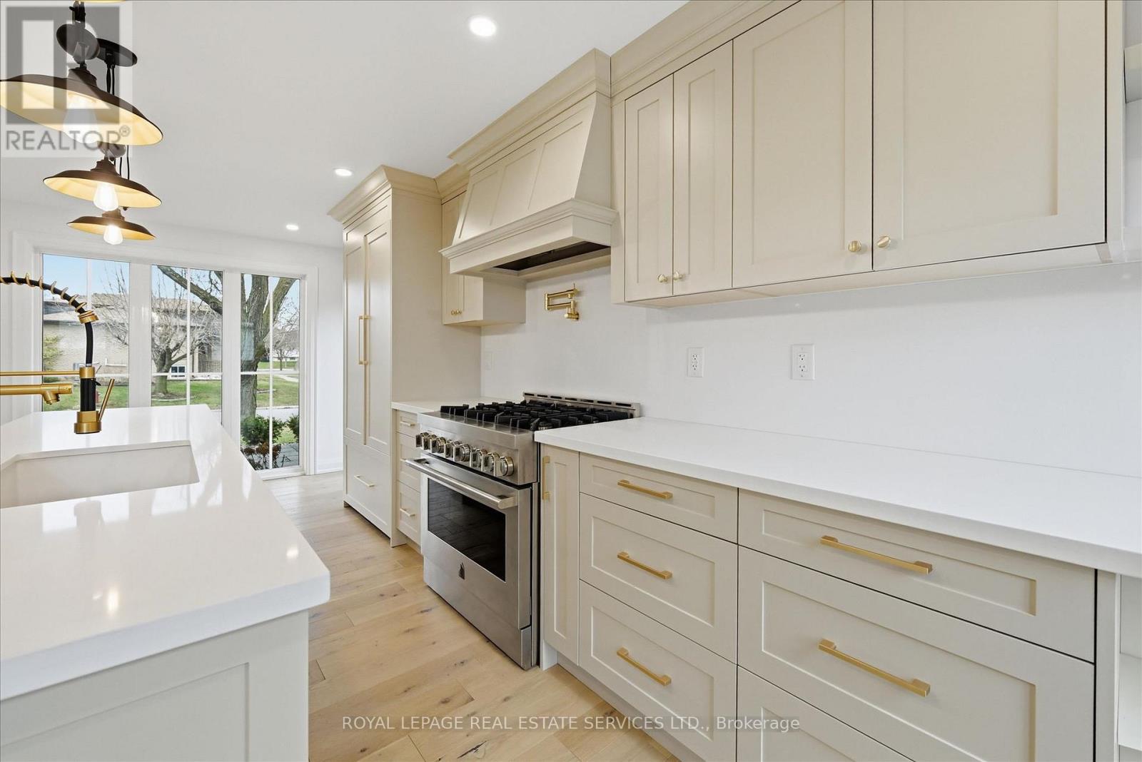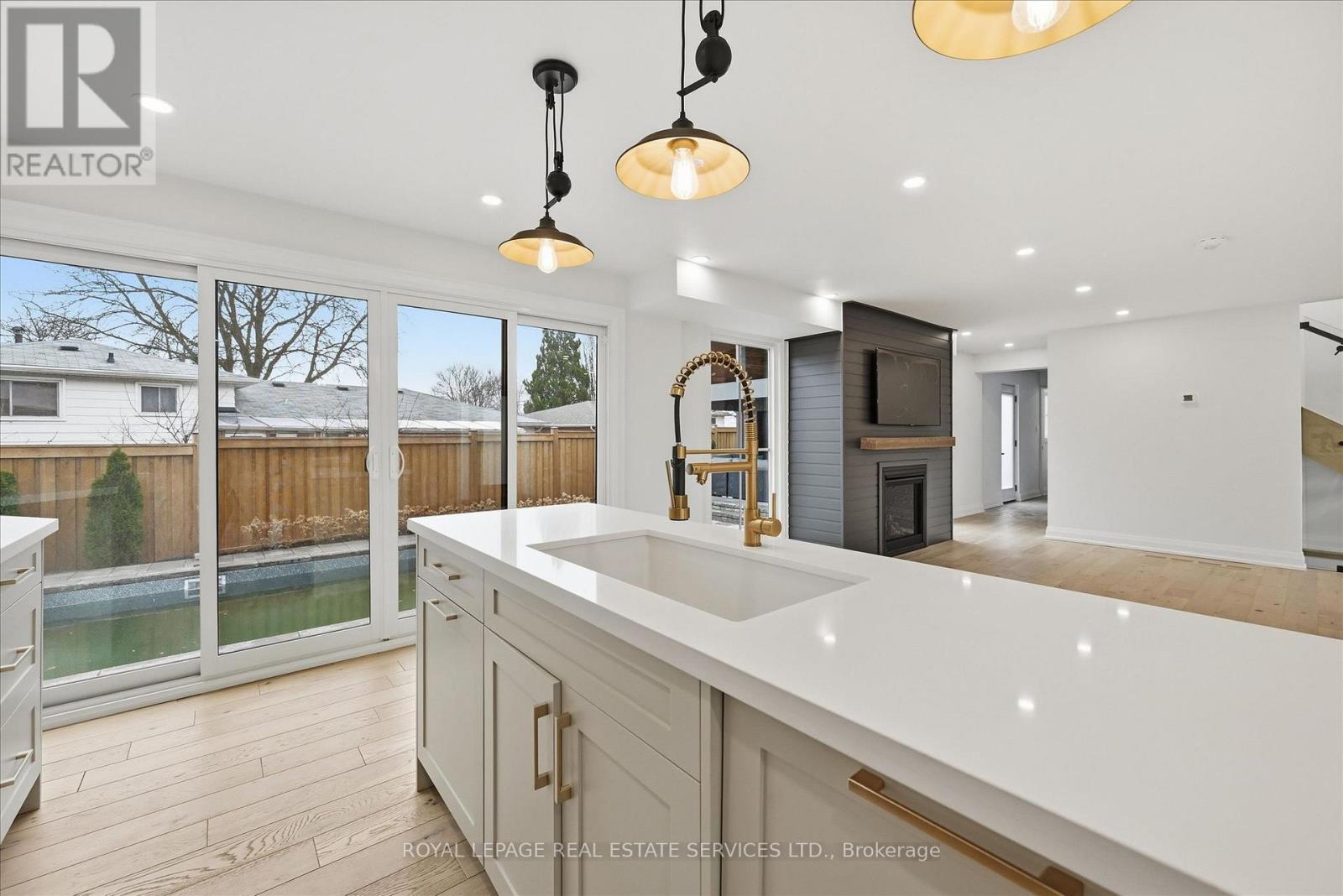 Recently reimagined for modern family living, this West Oakville residence blends refined architectural design with a resort-style backyard retreat, all just minutes from the lake. Offering 4+1 bedrooms, 4.5 bathrooms, and a finished lower level, the home delivers a seamless balance of style, comfort, and functionality. The main level is defined by engineered hardwood flooring, expansive floor-to-ceiling windows, and open-concept principal rooms designed for everyday living and entertaining. The custom kitchen showcases quartz countertops, a large centre island with sink, JennAir gas range, pot filler, and effortless flow to the backyard. An open-riser staircase with glass panels adds architectural interest, while the living area is anchored by a feature wall with gas fireplace. Upstairs, engineered hardwood flooring continues throughout. The primary suite offers an accent wall, wall sconces, a walk-in closet with built-ins and window, and a spa-inspired ensuite featuring a freestanding tub, glass shower with rainfall showerhead, and double sinks. A second bedroom enjoys its own private three-piece ensuite, while two additional bedrooms share a well-appointed four-piece bath. A convenient laundry room with sink completes the upper level. Outdoors, the fully fenced backyard is a true showpiece. Designed for entertaining and relaxation, it features an inground pool with an eco-friendly and cost-effective copper ionizer system, extensive stone hardscaping, and a covered outdoor living area with gas fireplace. A dedicated BBQ area with gas line and direct side-door access to the kitchen enhances both convenience and functionality. Ideally situated near parks, Gladys Speers Public School, St. Dominic Catholic Elementary School, Queen Elizabeth Park Community and Cultural Centre, shopping, transit, major highways, and the lake, this home offers an exceptional lifestyle in a vibrant, family-friendly community. (certain exterior images have been digitally enhanced) (id:64974)