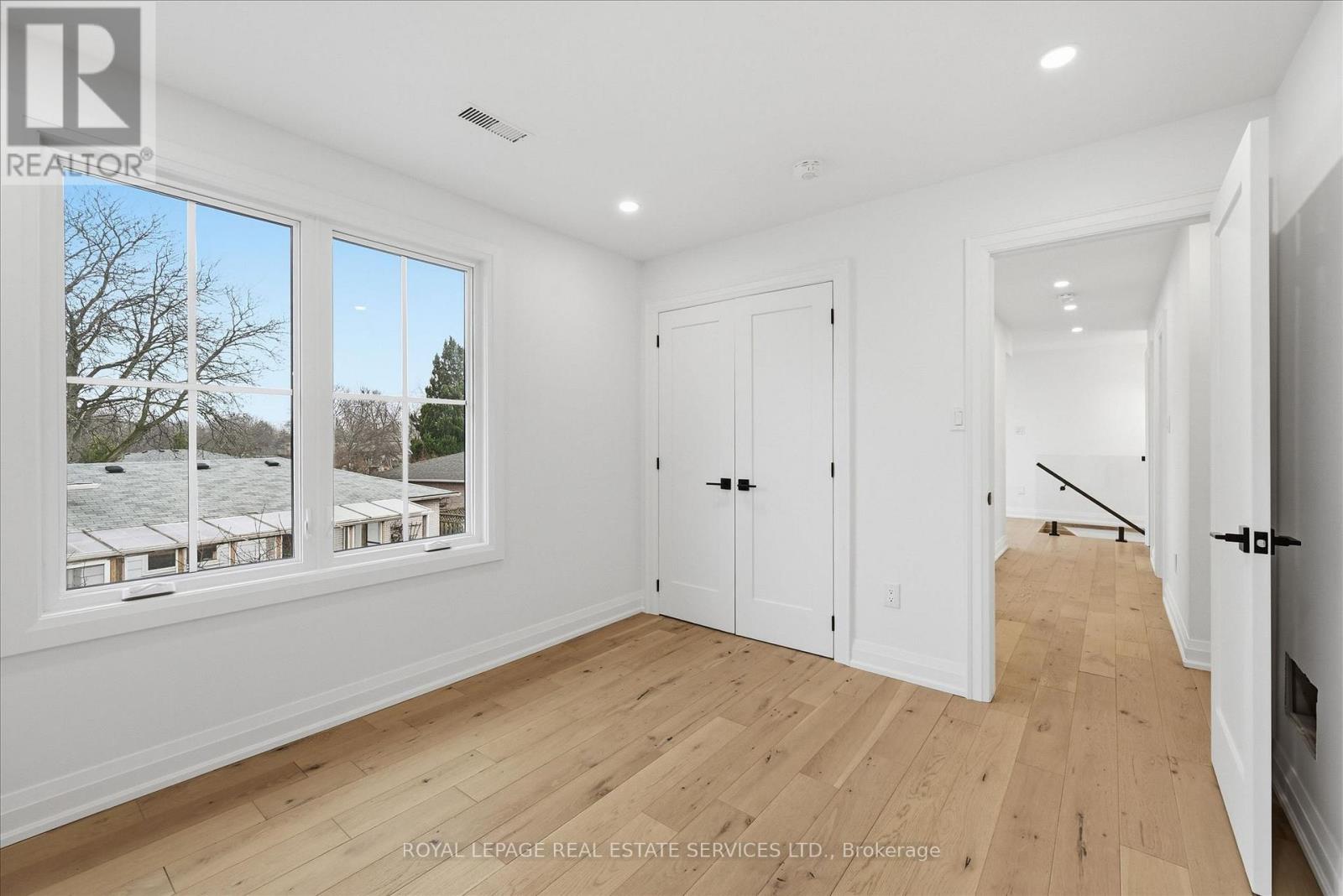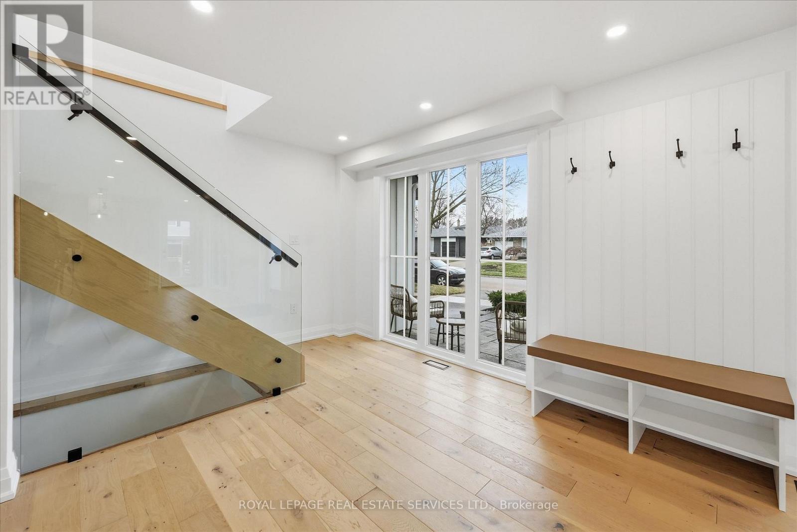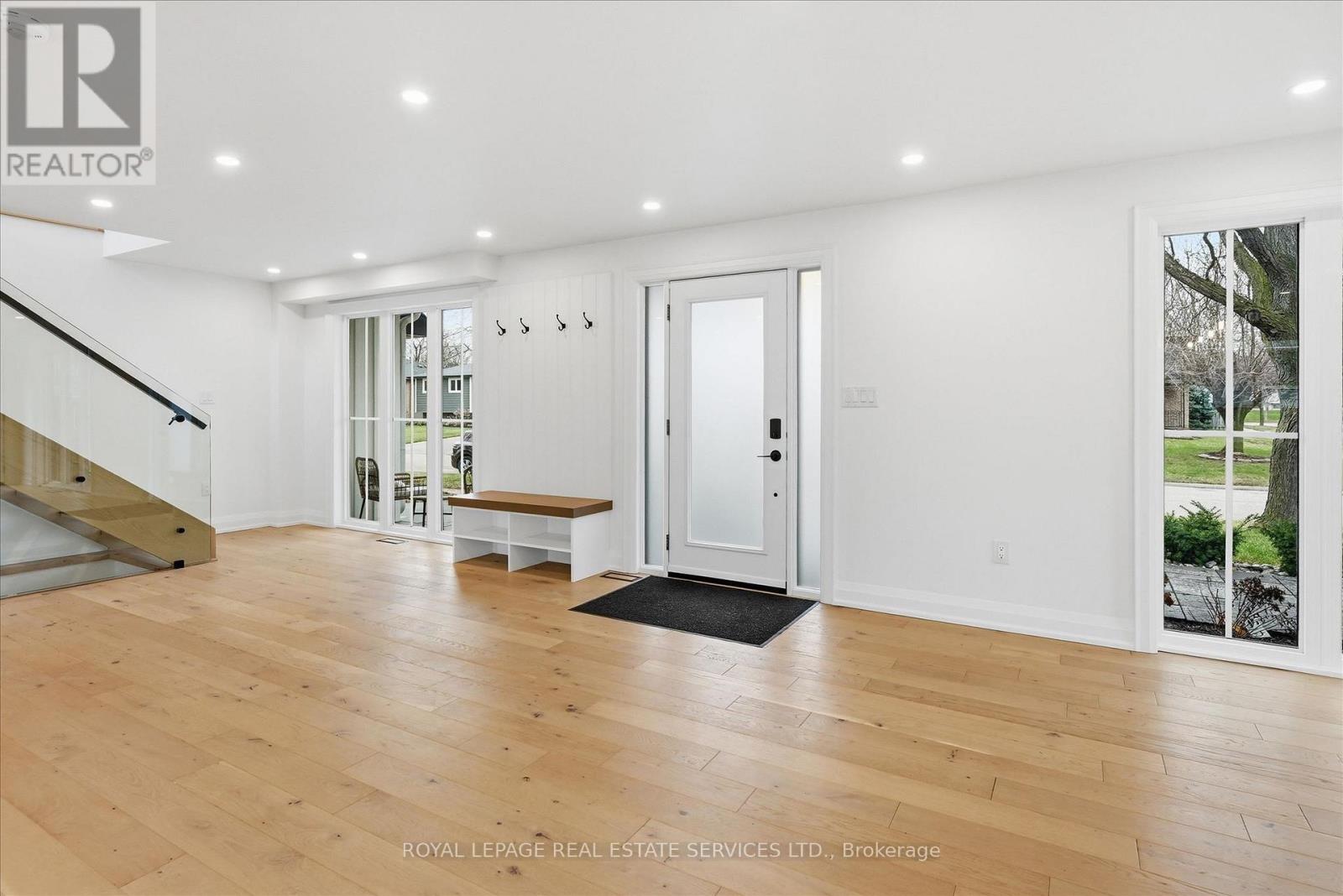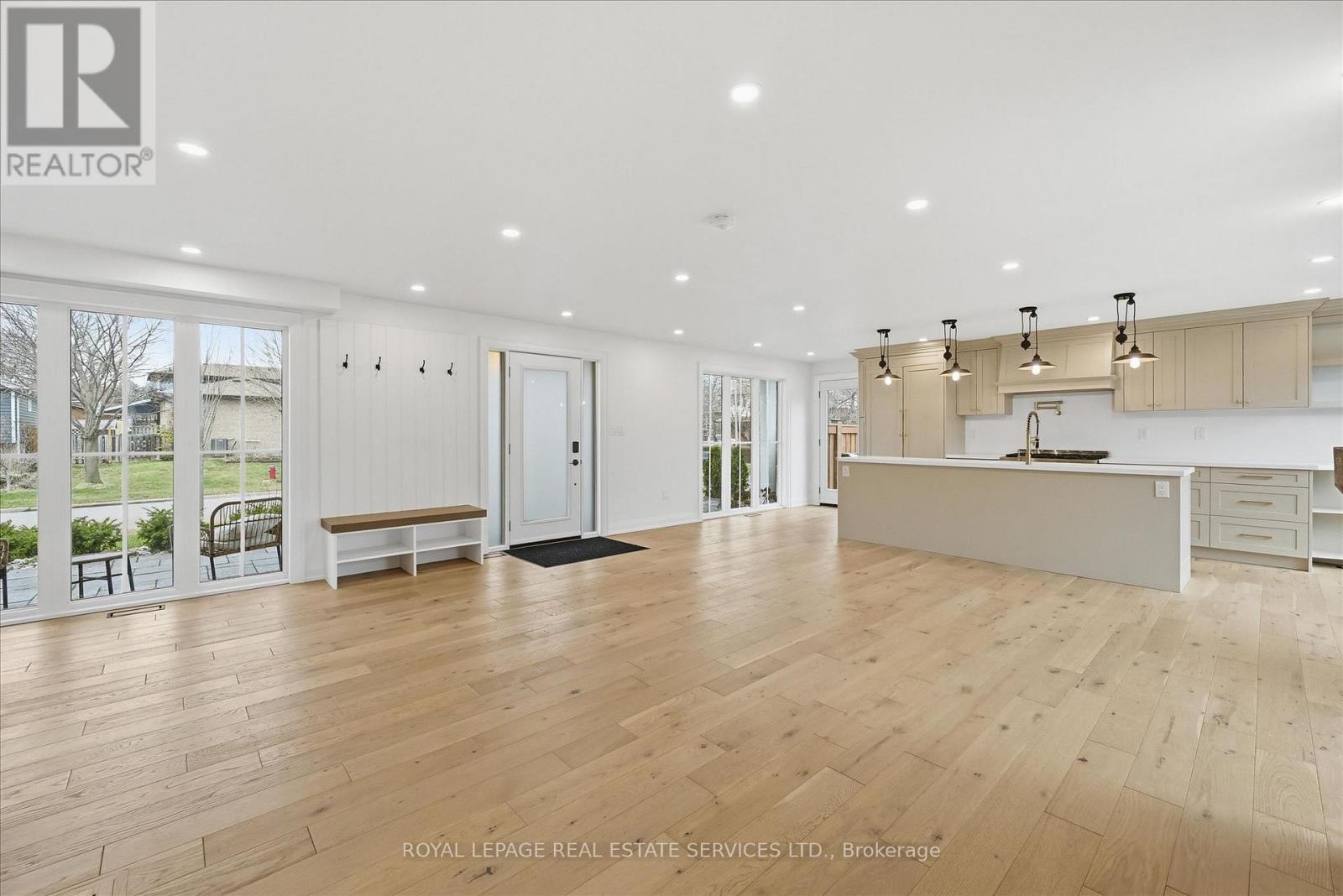 Recently reimagined for modern family living, this West Oakville residence blends refined architectural design with a resort-style backyard retreat, all just minutes from the lake. Offering 4+1 bedrooms, 4.5 bathrooms, and a finished lower level, the home delivers a seamless balance of style, comfort, and functionality. The main level is defined by engineered hardwood flooring, expansive floor-to-ceiling windows, and open-concept principal rooms designed for everyday living and entertaining. The custom kitchen showcases quartz countertops, a large centre island with sink, JennAir gas range, pot filler, and effortless flow to the backyard. An open-riser staircase with glass panels adds architectural interest, while the living area is anchored by a feature wall with gas fireplace. Upstairs, engineered hardwood flooring continues throughout. The primary suite offers an accent wall, wall sconces, a walk-in closet with built-ins and window, and a spa-inspired ensuite featuring a freestanding tub, glass shower with rainfall showerhead, and double sinks. A second bedroom enjoys its own private three-piece ensuite, while two additional bedrooms share a well-appointed four-piece bath. A convenient laundry room with sink completes the upper level. Outdoors, the fully fenced backyard is a true showpiece. Designed for entertaining and relaxation, it features an inground pool with an eco-friendly and cost-effective copper ionizer system, extensive stone hardscaping, and a covered outdoor living area with gas fireplace. A dedicated BBQ area with gas line and direct side-door access to the kitchen enhances both convenience and functionality. Ideally situated near parks, Gladys Speers Public School, St. Dominic Catholic Elementary School, Queen Elizabeth Park Community and Cultural Centre, shopping, transit, major highways, and the lake, this home offers an exceptional lifestyle in a vibrant, family-friendly community. (certain exterior images have been digitally enhanced) (id:64974)