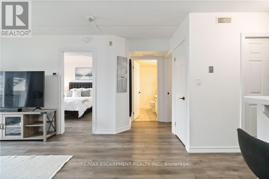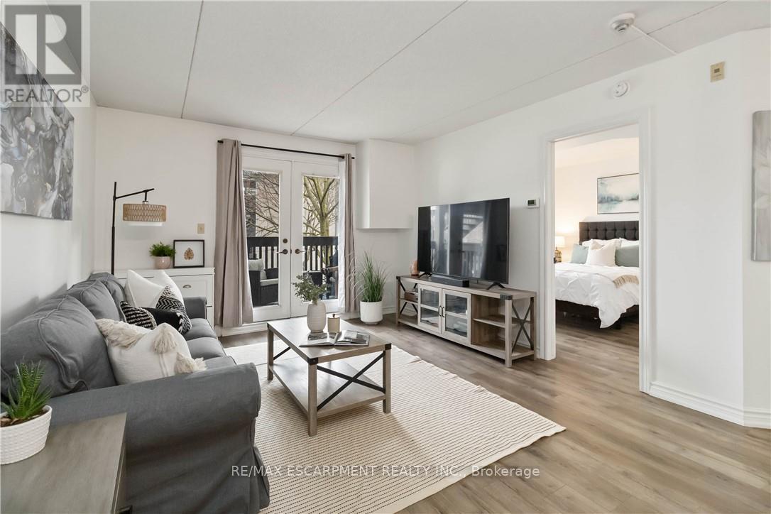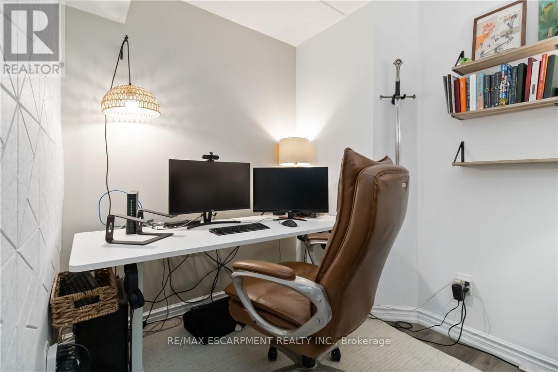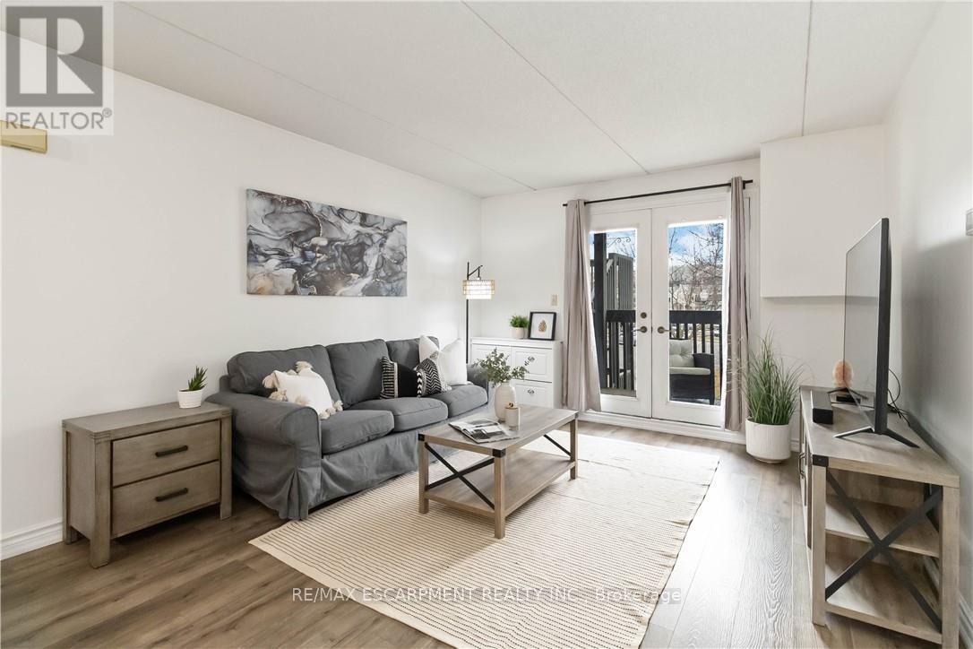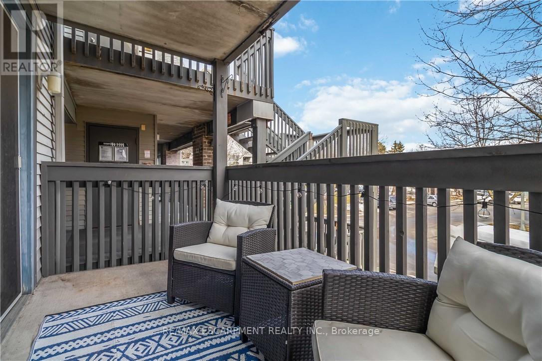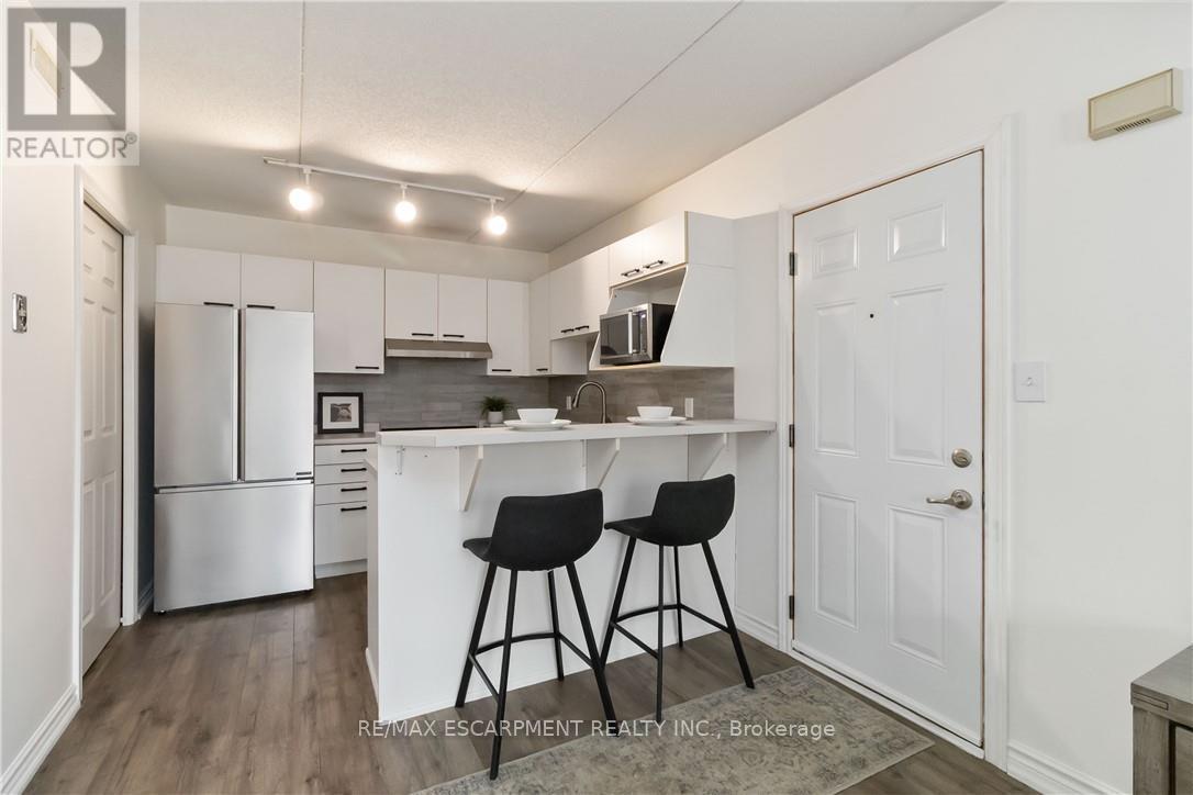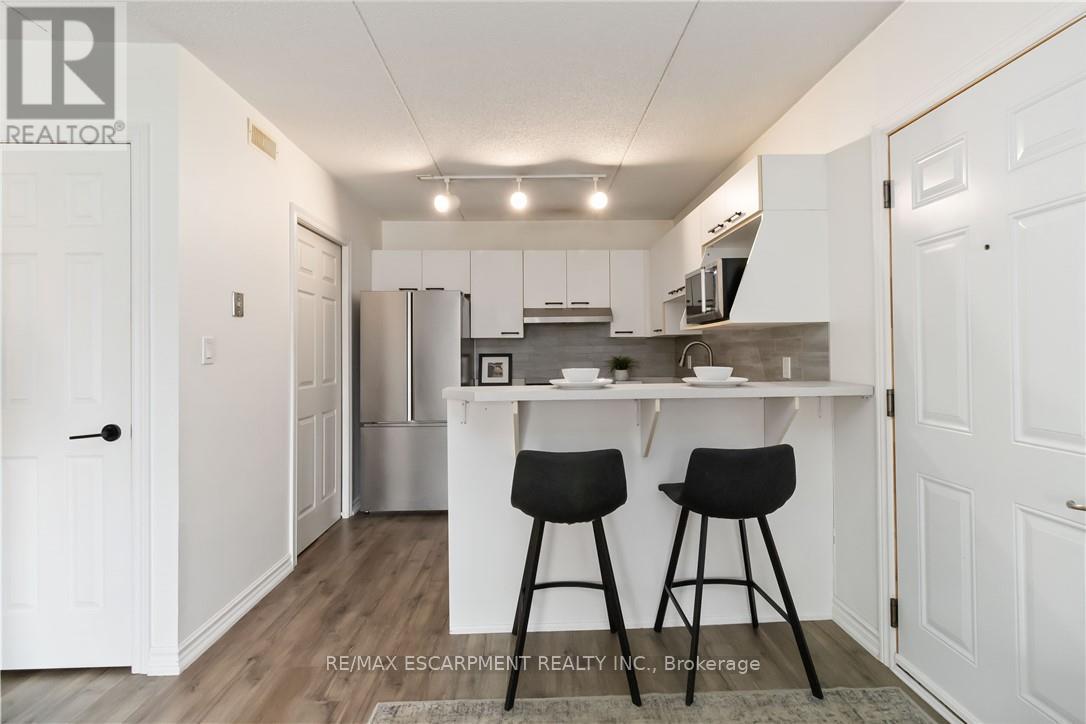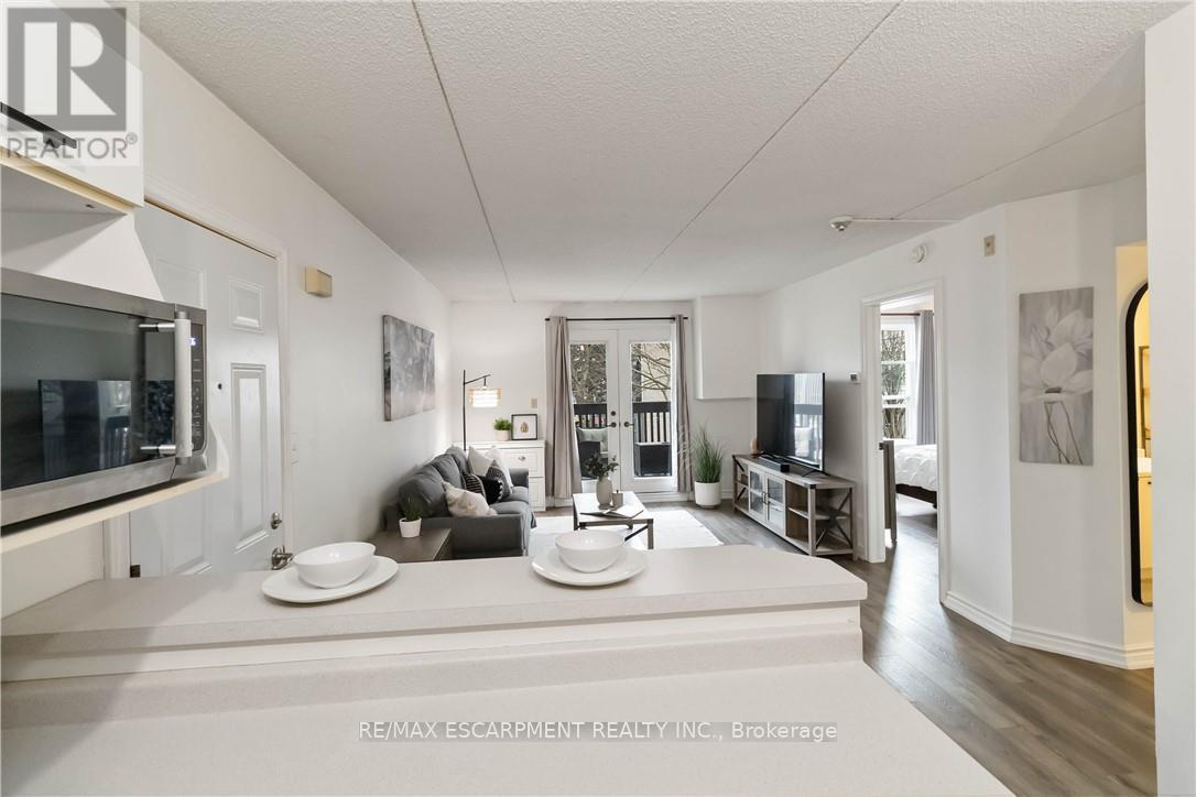 Welcome home to this beautifully appointed open-concept condo, privately nestled in the sought-after Headon Forest community of Burlington. Surrounded by mature trees and tranquil greenery, this bright and inviting one-bedroom plus den residence offers an exceptional blend of style, comfort, and convenience. Designed with modern living in mind, the spacious open-concept layout creates seamless flow between the kitchen, dining, and living areas-ideal for both everyday living and entertaining. The peninsula-style kitchen serves as the heart of the home, offering generous counter space, additional seating, and a natural gathering place for casual meals or hosting guests. The sun-filled living area extends to a private covered balcony, providing a peaceful outdoor retreat to enjoy your morning coffee or unwind at the end of the day. The well proportioned primary bedroom is complemented by a versatile den, perfect for a home office, guest space, or reading nook. A four-piece bath and convenient in-suite laundry enhance everyday functionality. Covered parking and a private locker are included for added comfort and storage. Ideally located close to shopping, restaurants, parks, and everyday amenities, this residence offers refined condo living in one of Burlington's most desirable neighbourhoods (id:64974)