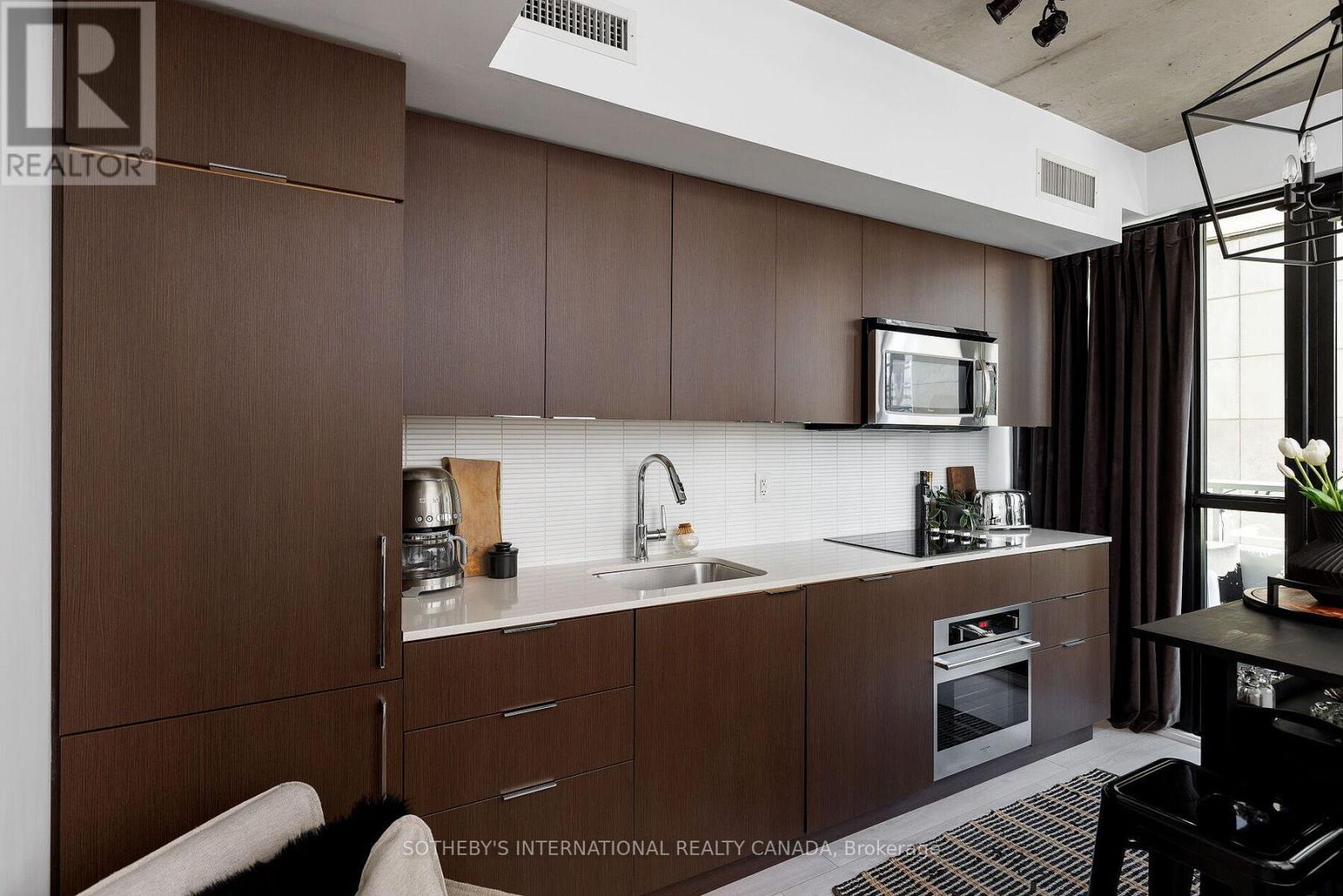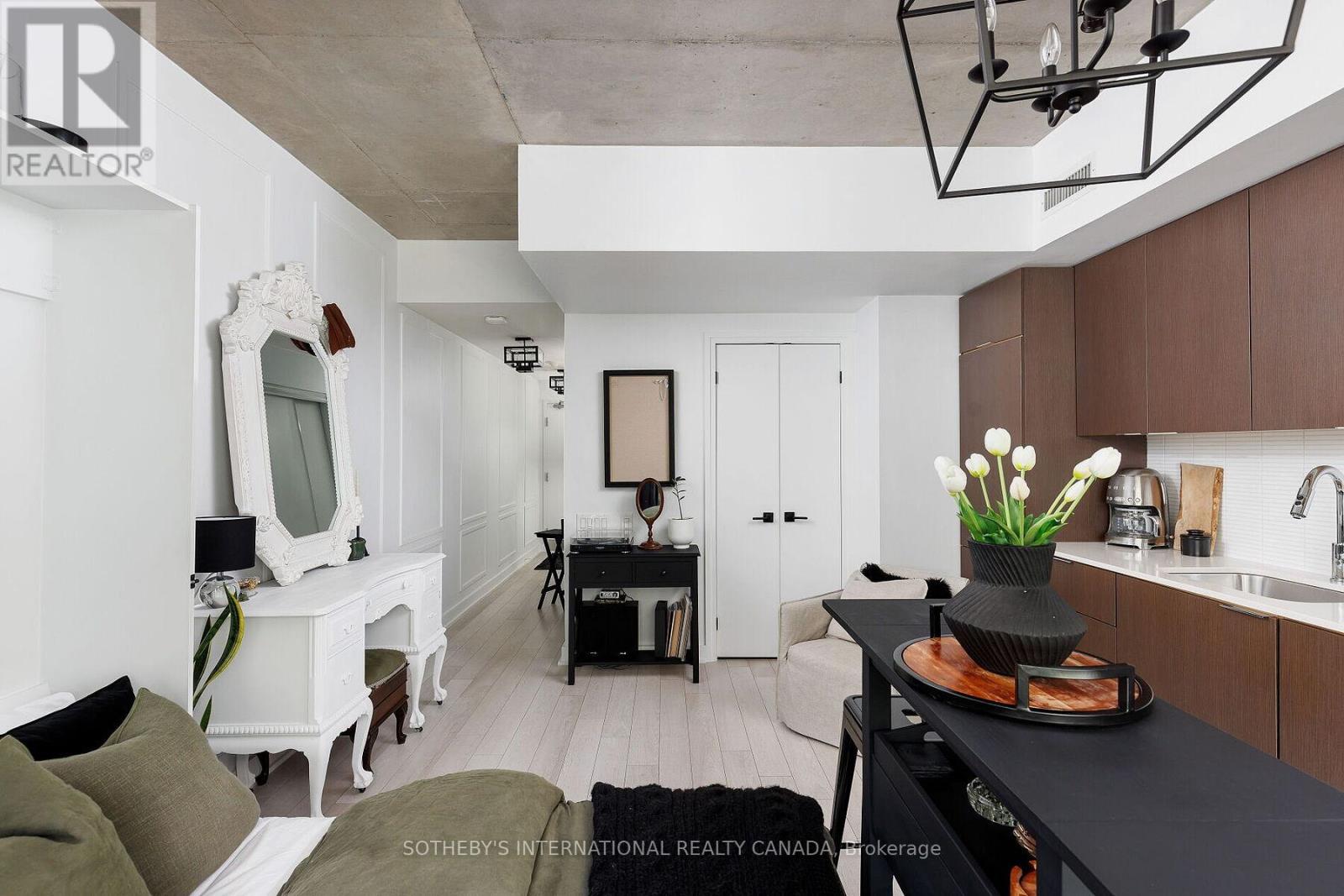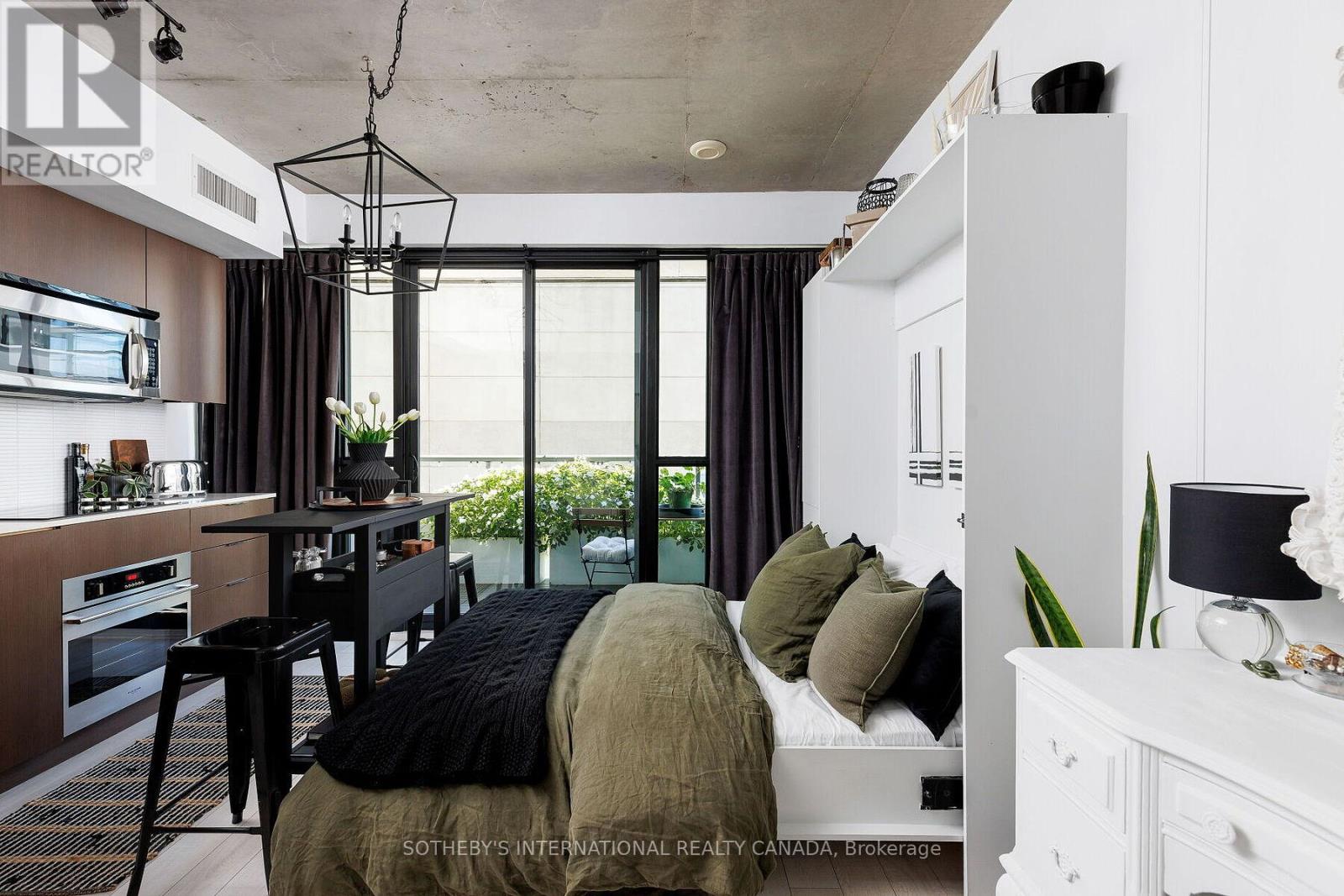 Find happiness on Hanna Ave in this stylish studio apartment at the ever popular Liberty Market Lofts! Suite 223 has been designed with function and flare - available partially furnished with a Murphy bed, making the most of the open concept space, you'll find unique pieces & smart storage solutions throughout. The modern kitchen features quartz counters, integrated & stainless steel appliances & ample cabinet space. Your balcony is an extension of the living space, equipped with furniture, lighting and planters where you can grow your own flowers/plants! Love living in Liberty Village just steps to parks, grocery stores, shops, restaurants, bars, fitness clubs, theTTC, the Exhibition GO Train, Budweiser Stage, Lake Ontario & so much more! Amenities at the LibertyMarket Lofts include; 24 hour concierge, visitor parking, two guest suites, party room with Billiards area, multiple meeting rooms, dog wash, communal large sized washing machine & dryer, a private courtyard, a gym with Peloton Bike, squat rack, free weights and cardio equipment and a yoga room + a half court basketball court! + Rental parking is available in the building. (id:64974)