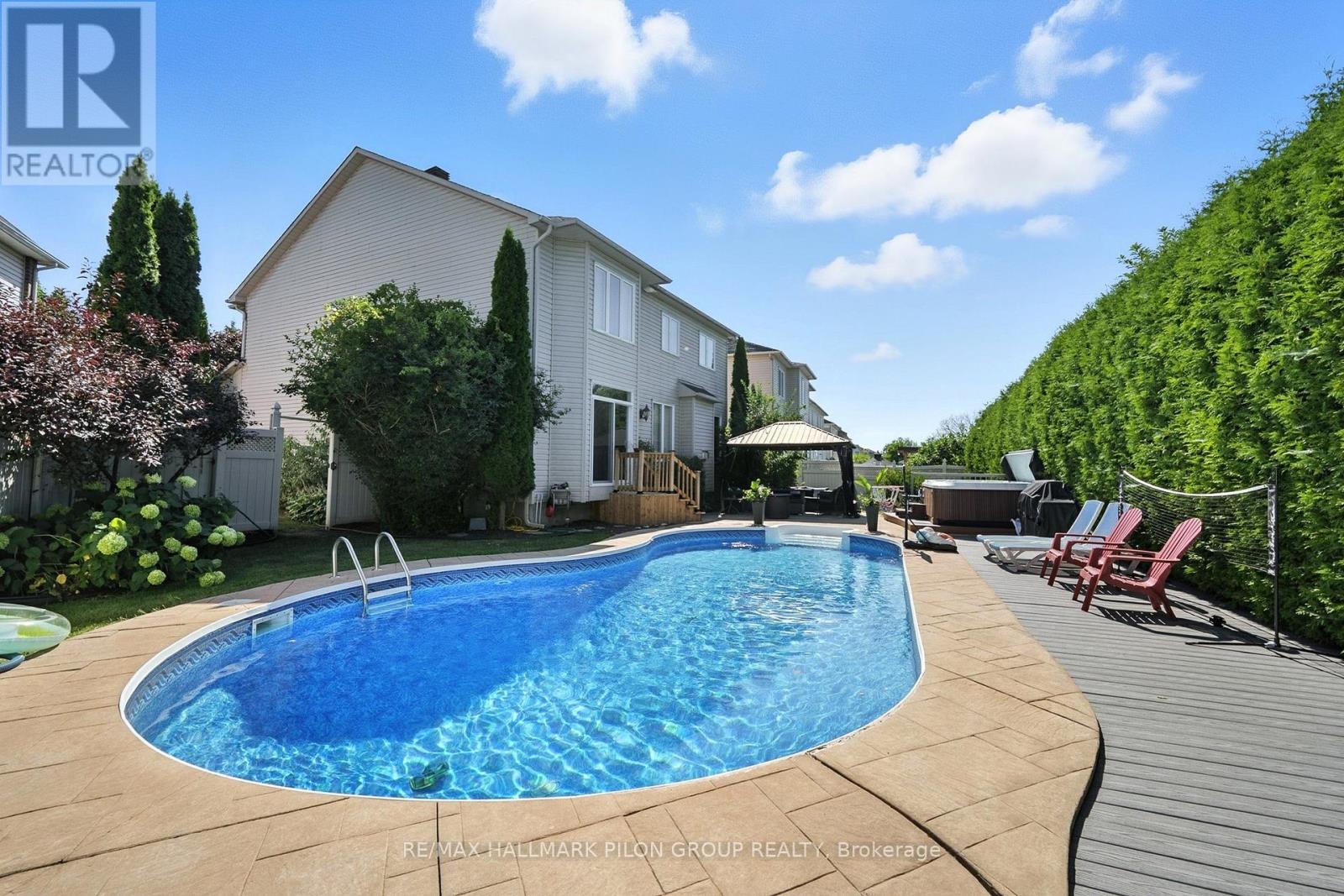 Welcome to 2234 Clermont Cr, a rare opportunity on a premium pie shaped lot in Avalon East. This beautifully maintained 4 bed, 4 bath home offers a private backyard oasis with heated saltwater pool, hot tub, pergola lounge & NO REAR NEIGHBOURS. Situated on a quiet crescent, this home is perfectly positioned for family living. Just steps to Aquaview Park with its splash pad, playground, green space & outdoor rink in the winter, and backing onto a walking/biking path.The backyard is a true standout. A tall manicured hedge spans the rear of the property, creating exceptional privacy. The 18' x 36' heated saltwater pool is surrounded by stamped concrete patios and multiple seating areas, ideal for entertaining. The hot tub offers year round enjoyment, while the pergola lounge and 10' x 12' gazebo with lighting & screens provide comfortable spaces to relax. PVC decking along the hedge adds additional usable outdoor space.Inside, the home welcomes you with a spacious foyer and a striking curved staircase. The main level offers a bright open concept living and dining area, along with a rear family room overlooking the yard with a gas fireplace featuring a stone surround and wood mantle. The kitchen has been updated with quartz countertops, refreshed cabinetry, new flooring, stainless steel appliances, and a large extended island w/breakfast bar seating, along with a bright eating area. Upstairs, hardwood flooring runs throughout all bedrooms. The spacious primary includes a walk in closet and 4pc ensuite. Three additional beds, full bath, & convenient 2nd level laundry complete the space.The finished LL offers a large rec room, dedicated gym area w/luxury vinyl flooring, computer nook, full bath, & ample storage. Roof 2015. Many updates throughout, full list available. Located in a highly desirable community known for its family friendly atmosphere, parks, schools, walking trails, & access to shopping and everyday amenities. (id:64974)