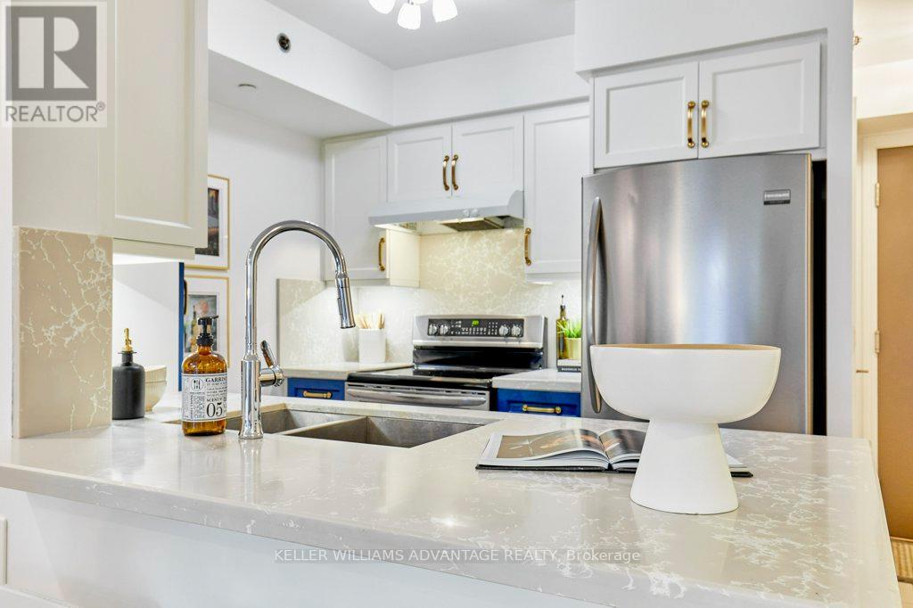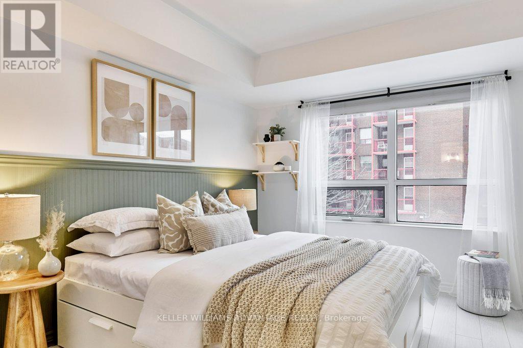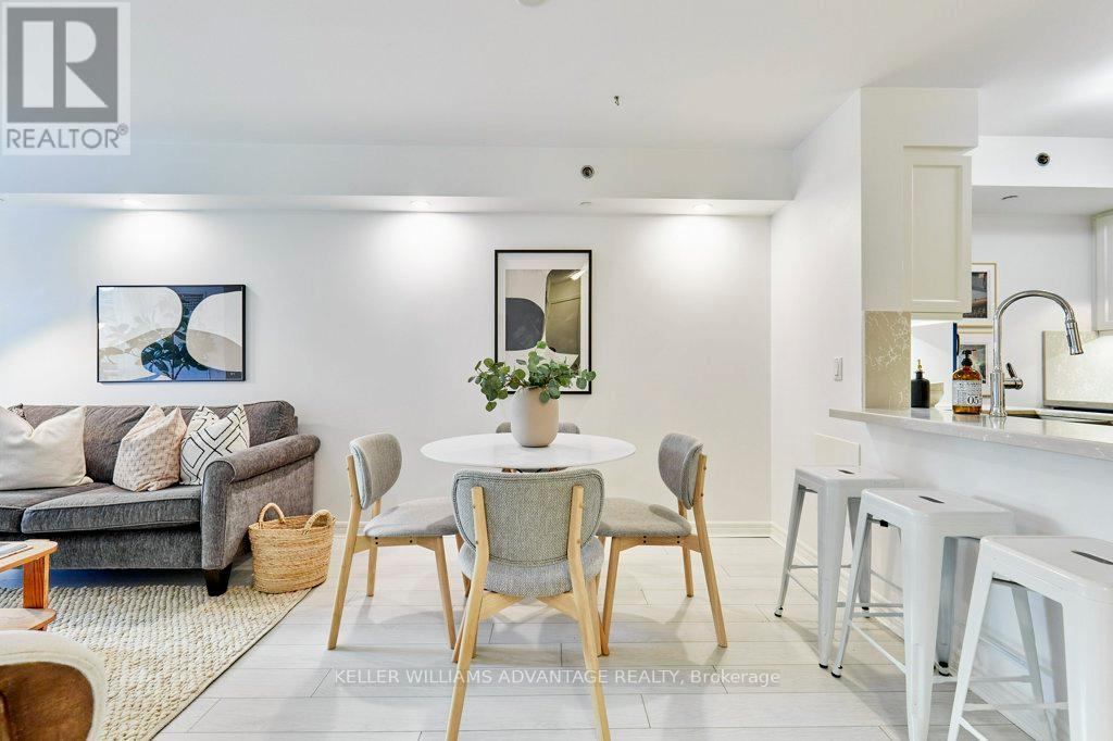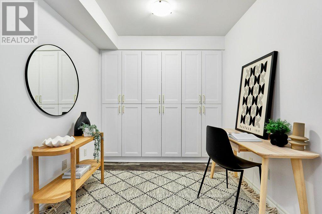 Step into this beautifully maintained 1-bedroom + den suite (670sqft) in sought-after Cranbrooke Village. The efficient, open layout maximizes space, with floor-to-ceiling windows that flood the living and dining area with natural light and showcase open views. The modern kitchen offers ample storage, a breakfast bar, and stylish blue cabinets. The bedroom has a large closet and full window, while the den is ideal for a home office or extra living space and includes a full wall of closets. Enjoy morning coffee or an evening beverage on you private balcony, relax or entertain on the rooftop BBQ terrace, stay active in the fitness room, or host friends in the elegant party room.Quiet yet connected, the condo is steps from shops, restaurants, Lawrence Plaza, parks, and community centres, with TTC transit nearby and quick access to Highway 401 and Allen Road. Bright, stylish, and move-in ready, this suite combines comfort, convenience, and a true sense of home.Low maintenance fees in this LEED Gold building make life easy and eco-friendly. Carpet Free! (id:64974)