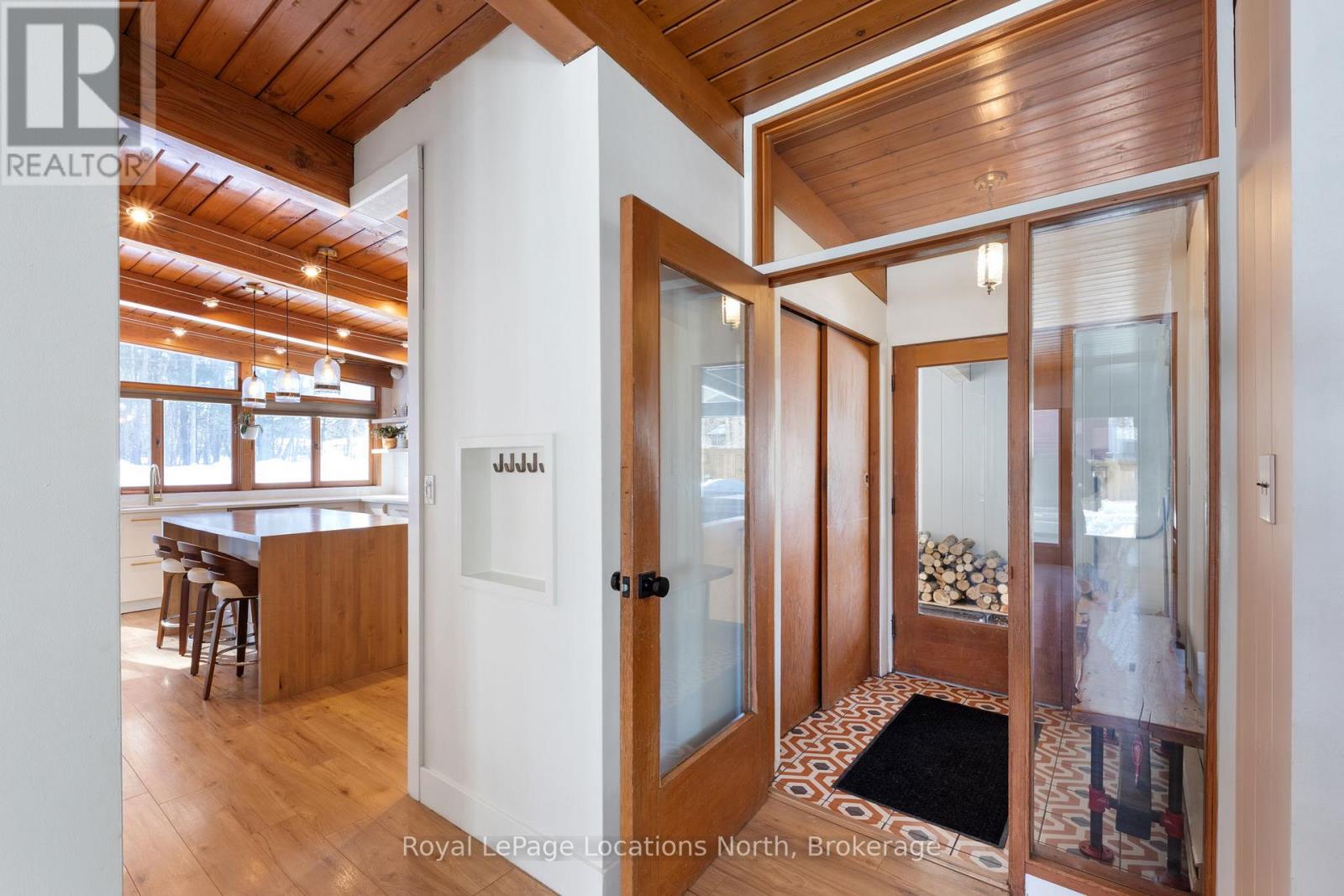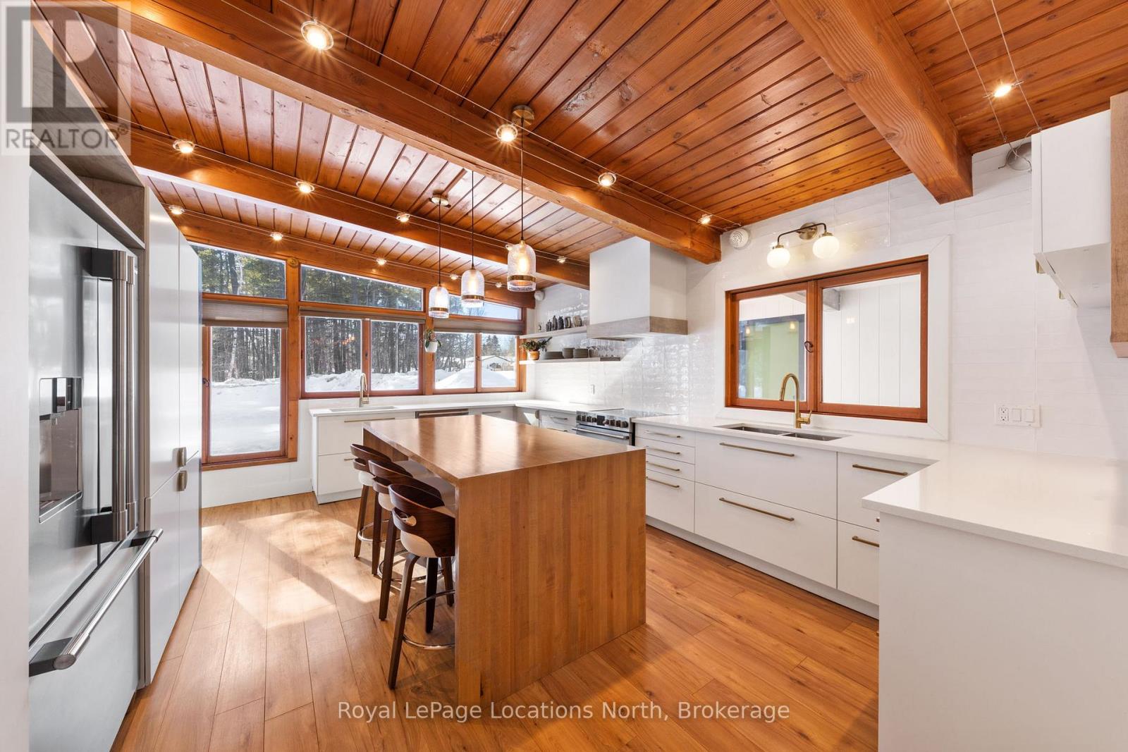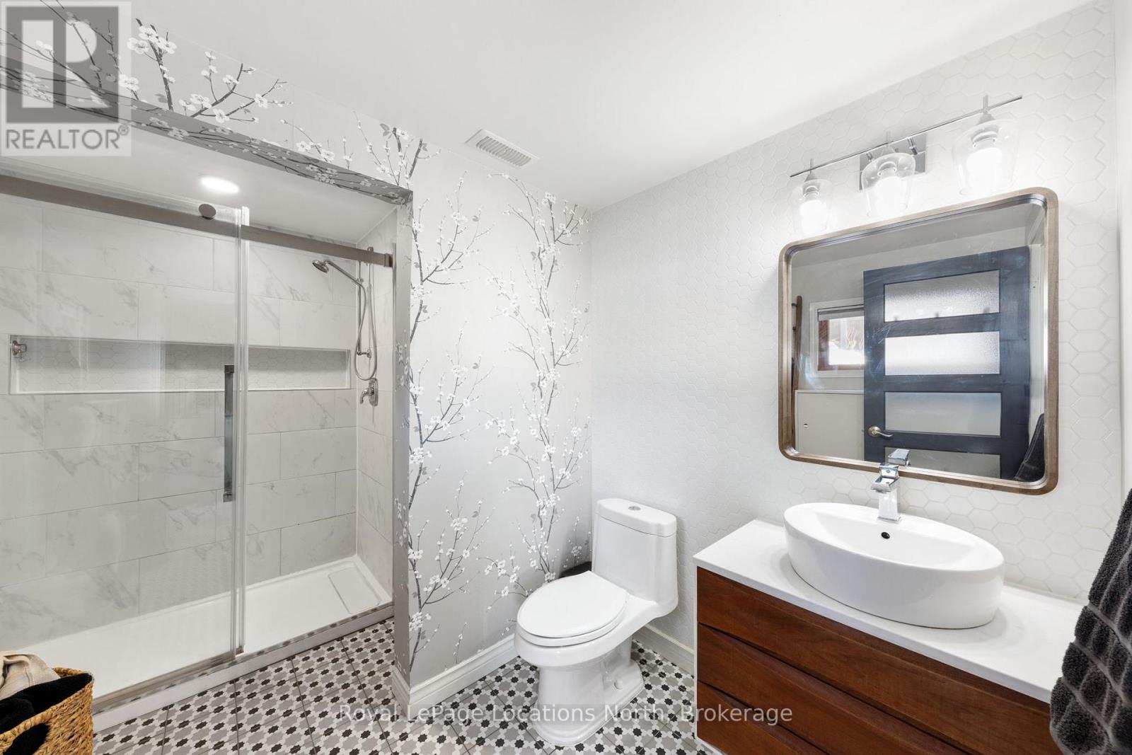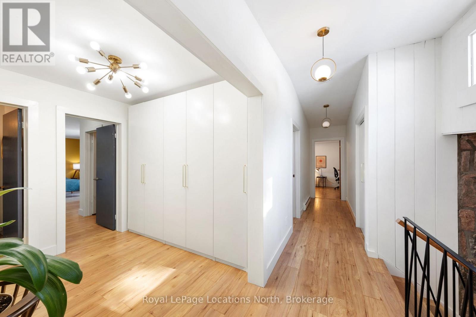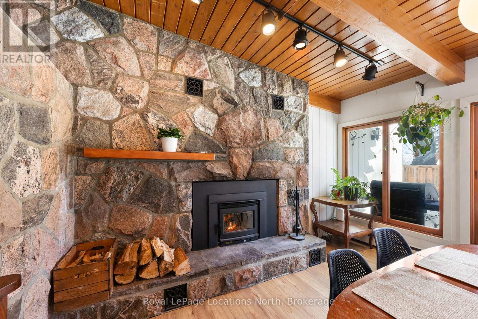 Modern mid-century multi-generational home located on a desirable quiet street in the charming town of Stayner, set on a large fully fenced lot. A covered breezeway connects the home to the heated two-car garage, offering sheltered access year-round. Inside, a spacious entryway welcomes you into a stunning dining room featuring a dramatic floor-to-ceiling stone wood-burning fireplace, original exposed wood ceiling beams, and a walkout to the backyard. The bright living room is filled with natural light from oversized windows, creating a warm and inviting space for family gatherings. The updated kitchen is designed for both style and functionality with stainless steel appliances, dual sinks, a large waterfall butcher block island with built-in wine fridge, and a generous pantry. The main level also offers a handy home office and convenient 2-piece bath. Upstairs, the impressive primary suite features a walk-in closet, large ensuite with soaker tub and separate shower, in-suite laundry, and doors leading to a private balcony. Three additional well-sized bedrooms and a modern 3-piece bathroom with oversized shower complete the upper level. The lower level offers a bright, self-contained two-bedroom apartment with above-grade windows, separate entrance, and interior access from the main home - ideal for multi-generational living or potential income. This space features a modern kitchen with stainless steel appliances and butcher block island, a comfortable living area, laundry off the kitchen, and a 3-piece bathroom. The apartment was fully updated in 2020.Recent updates include electrical panel (2020), main kitchen renovation (2022), and new garage door with opener (2022). The heated garage adds year-round comfort. Extensive landscaping along the west side of the home and a new fence installed in 2025 complete the outdoor space. This is a fantastic opportunity to own a spacious multi-generational home in the welcoming community of Stayner. Don't miss this one! (id:64974)