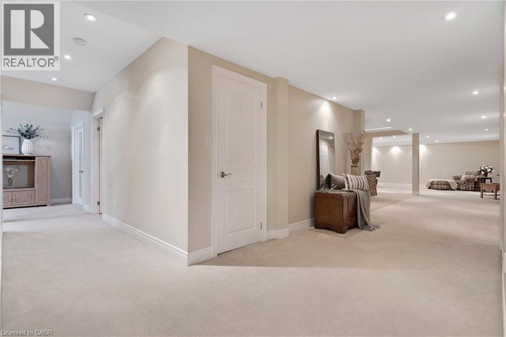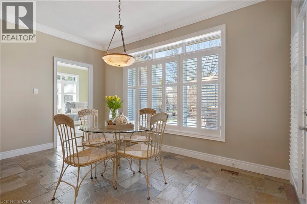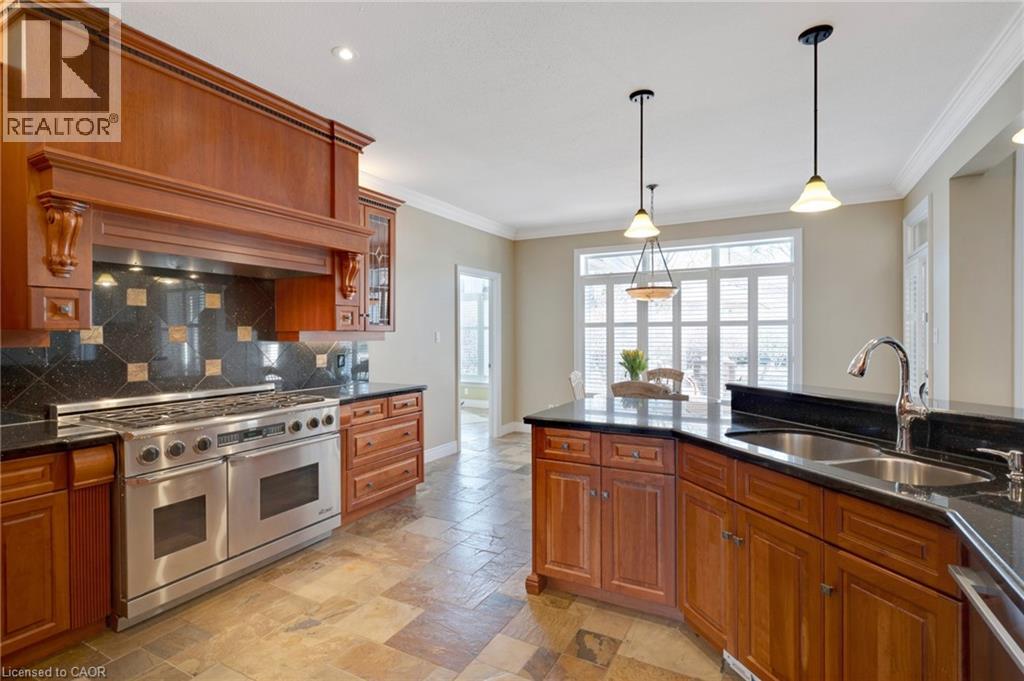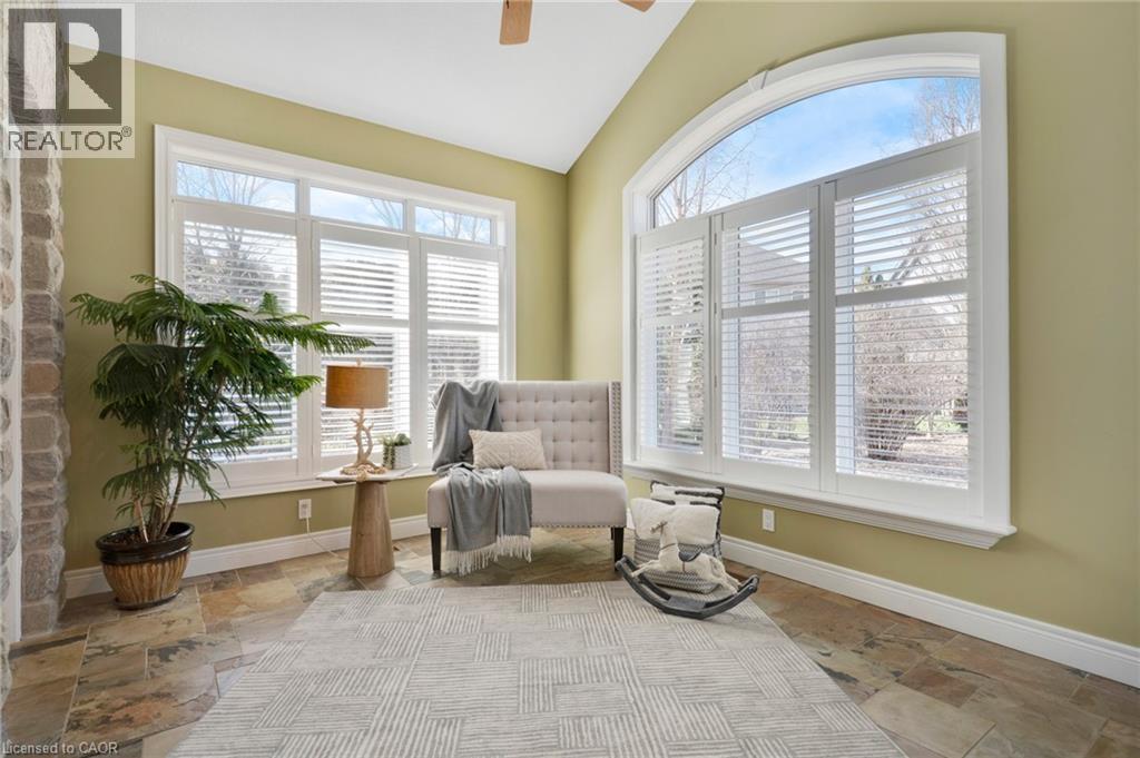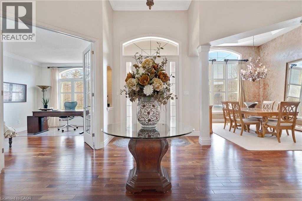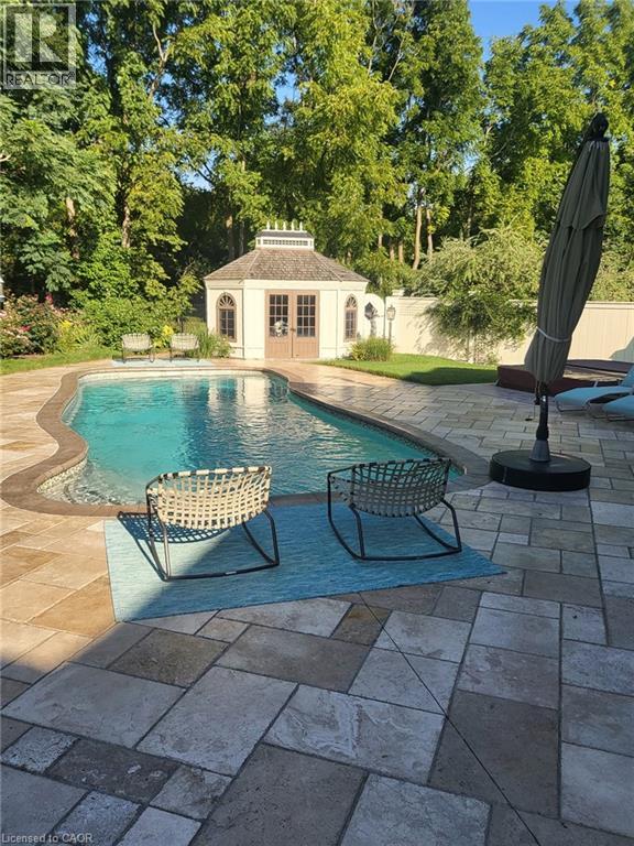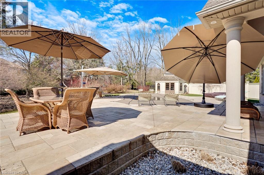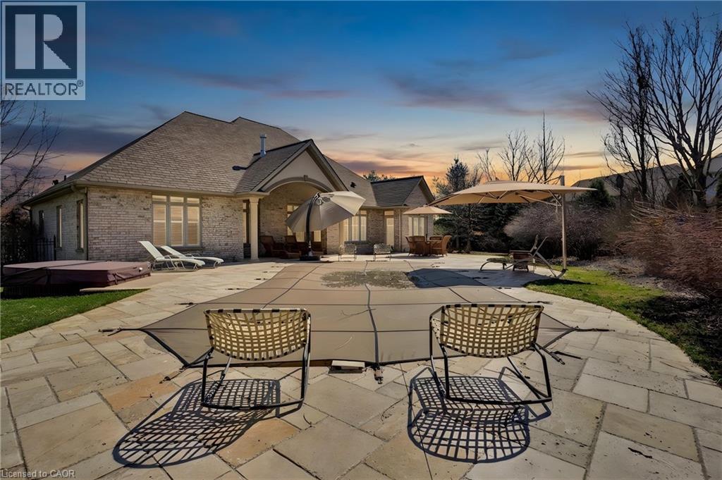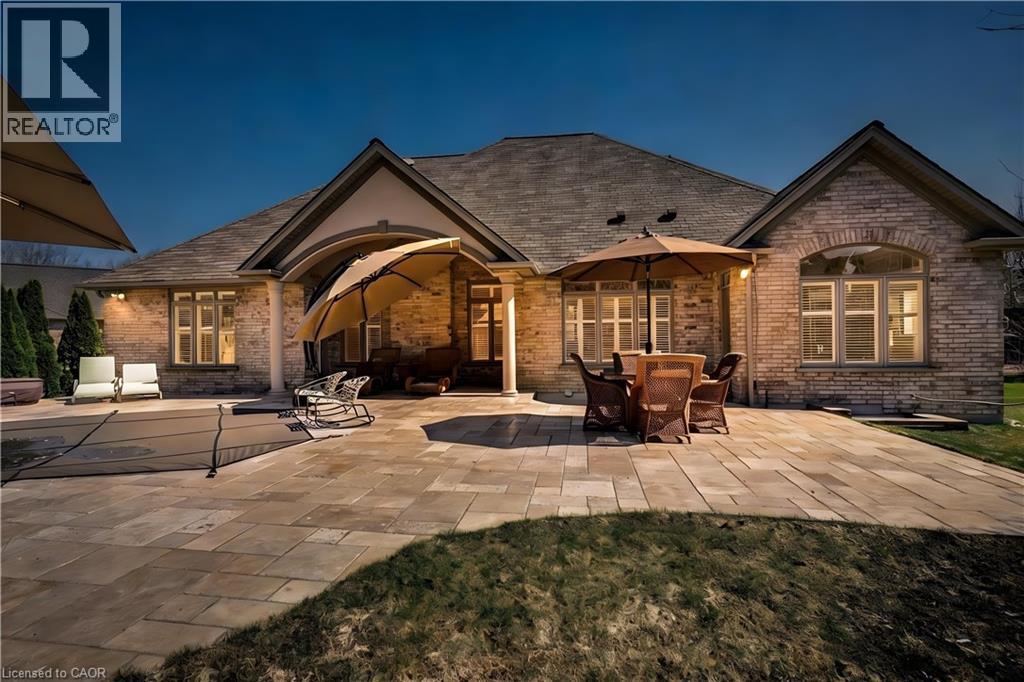 Located in the highly sought-after Doon Village area, this spacious bungalow is tucked away on an exclusive private court with just six homes, offering a quiet setting surrounded by mature trees and scenic walking trails. Set on a fully landscaped pie shaped lot of over 0.6 acres, the property provides exceptional privacy along with convenient access to amenities, Conestoga College, and Highway 401. With over 5,400 square feet of total living space, this home offers a well-designed layout with room for a variety of living arrangements. The main floor features an open and welcoming foyer, leading into bright principal rooms finished with hardwood floors, slate tile, 9-foot ceilings, and California shutters throughout. A large living room with gas fireplace anchors the space, complemented by a separate home office and a formal dining room with a built-in servery. The kitchen is both spacious and functional, equipped with high-end appliances including a six-burner gas range, and an eat-in area that opens to a sunroom overlooking the backyard. The main level includes three well-sized bedrooms, including a large primary suite set privately with a walk-in closet and a 5-piece ensuite. The fully finished lower level adds even more versatility, featuring two additional bedrooms, an oversized bathroom, a recreation room, home gym, playroom, and a sitting area/ office with rough-in for a wet bar. With direct access from the garage, this level is well suited for extended family or multi-generational living. Outside, the backyard offers a private retreat with an in-ground pool, patio, and hot tub, all surrounded by mature landscaping. A rare opportunity to own a well-appointed home in a quiet, established pocket of Doon. (id:64974)
