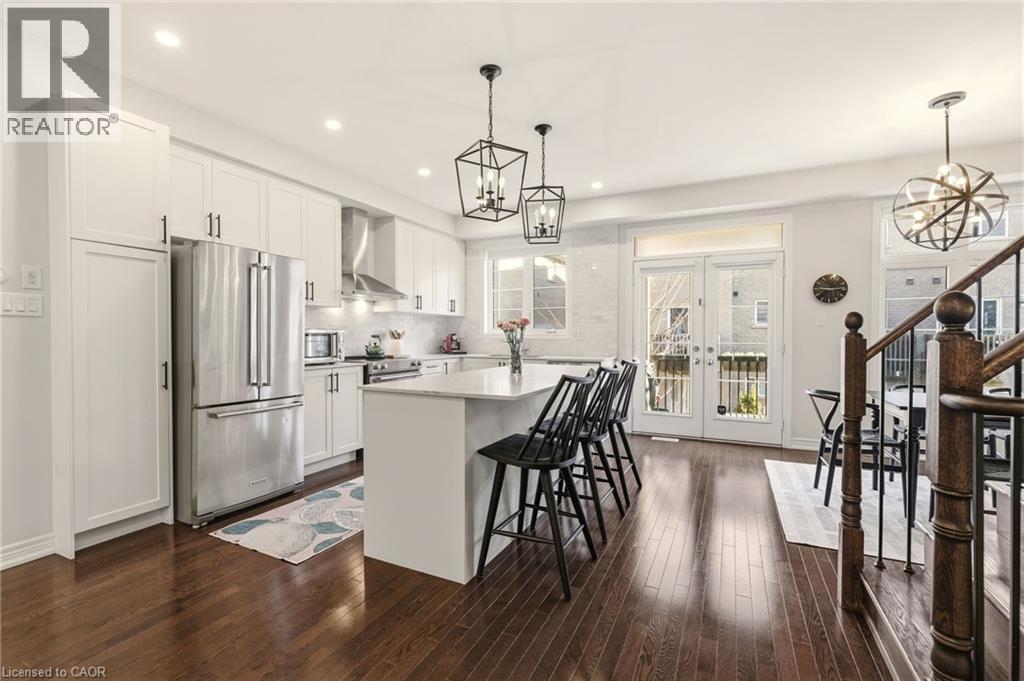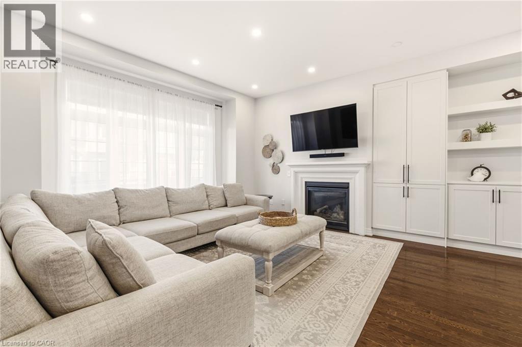 Beautifully built townhome featuring 3+1 bedrooms, 4 bathrooms, and a double car garage. The open-concept main floor offers a bright, spacious living area filled with abundant natural light from large windows. Upgrades include dark hardwood flooring throughout, dark-stained oak staircases, 9-ft ceilings, a stone fireplace mantel and custom built-ins in living room with extra storage. The gourmet kitchen features quartz countertops, a large centre island with breakfast bar, and KitchenAid stainless steel appliances, perfect for both everyday living and entertaining. The spacious breakfast area includes an oversized window and walkout to a covered balcony overlooking the rear yard, ideal for casual or formal dining. The primary suite offers dark hardwood flooring, a large walk-in closet, private walkout to an upper deck, and a luxurious 4-piece ensuite. Two additional bedrooms feature hardwood floors and double-door closets. Conveniently located close to the 407, major highways, hospital, shopping, parks, and schools, making it an ideal home for families and commuters alike. (id:64974)